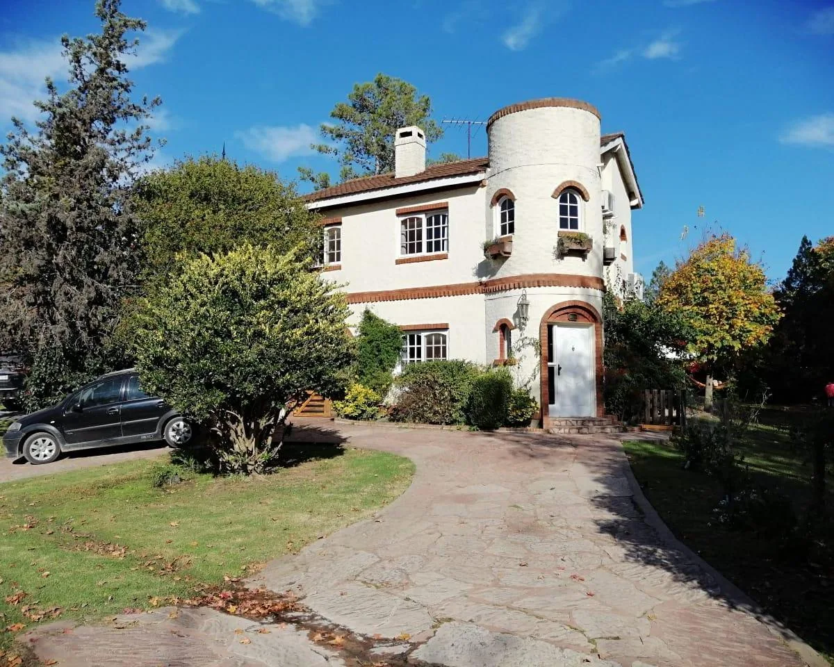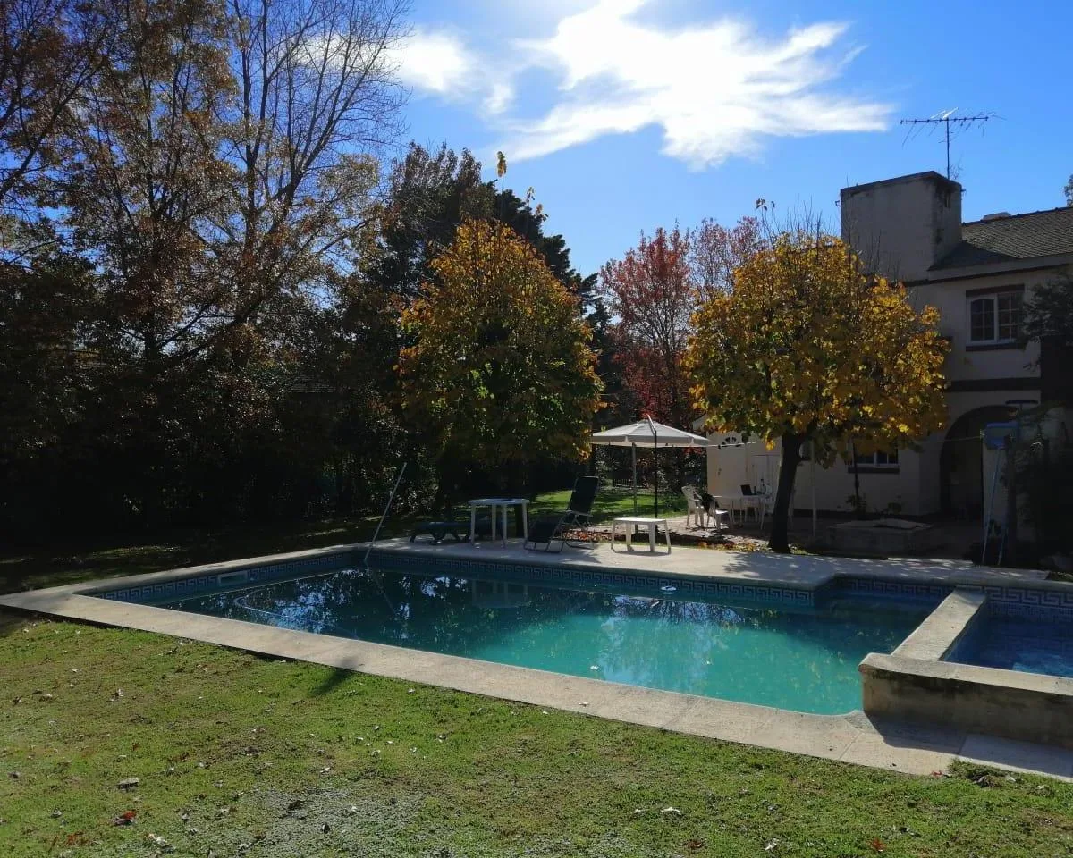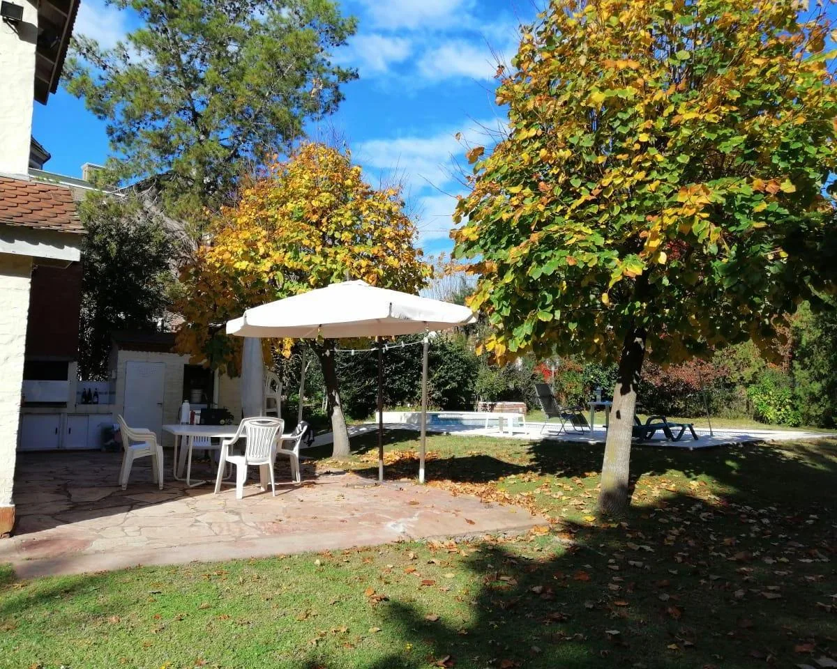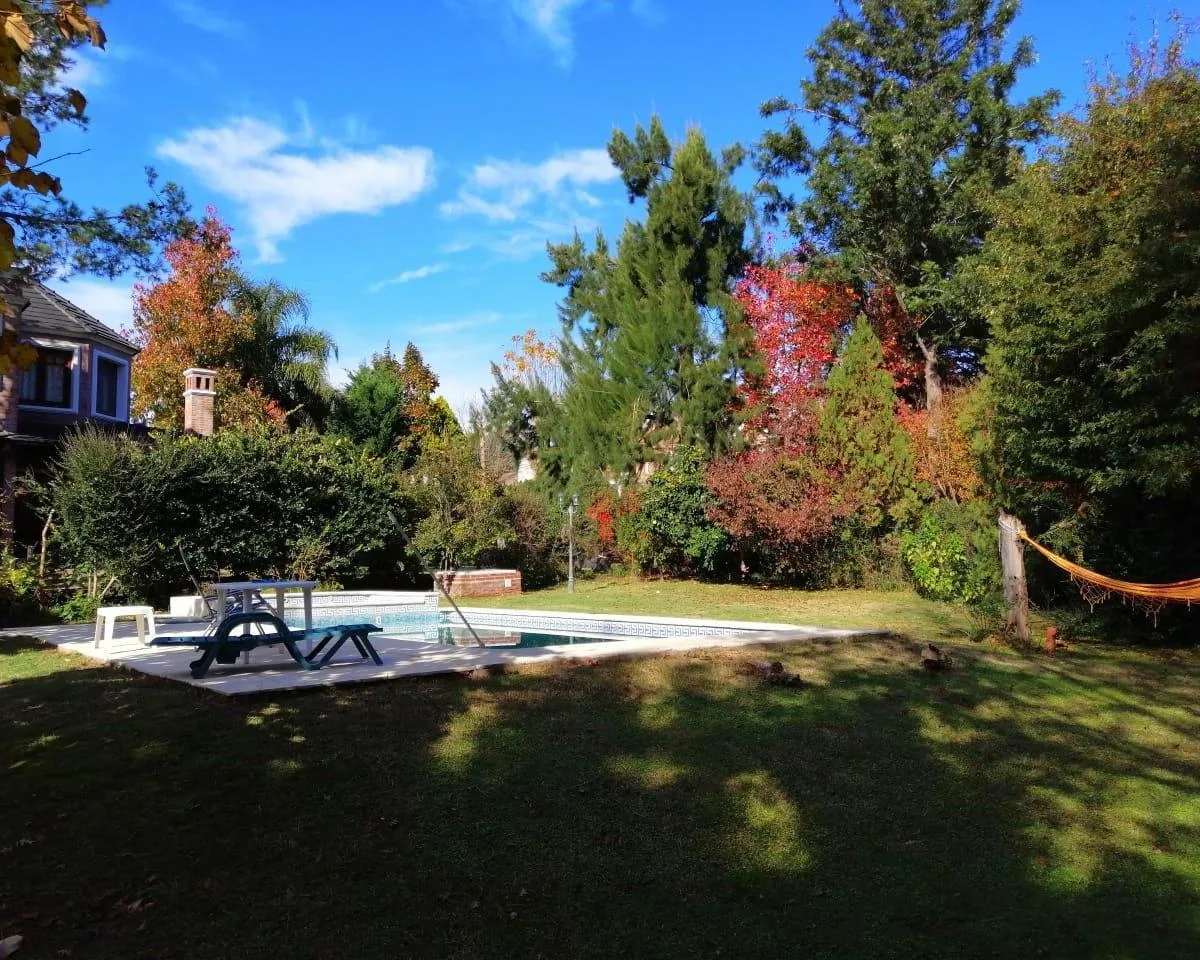 House for annual rent in El Bosque Country Club, located 65.5 km on Route 9, on 2 central lots. The property covers 165 m², with a total land area of 1,300 m². Ground floor: living room with a fireplace, guest toilet, kitchen, small dining area with a bay window, a covered and an uncovered gallery, a pool, and a large garden. Upstairs: 3 bedrooms, the main bedroom with a study, 2 heating and cooling air conditioners, and a full bathroom. Heating is provided by stoves. Annual rent is USD 1,100, p