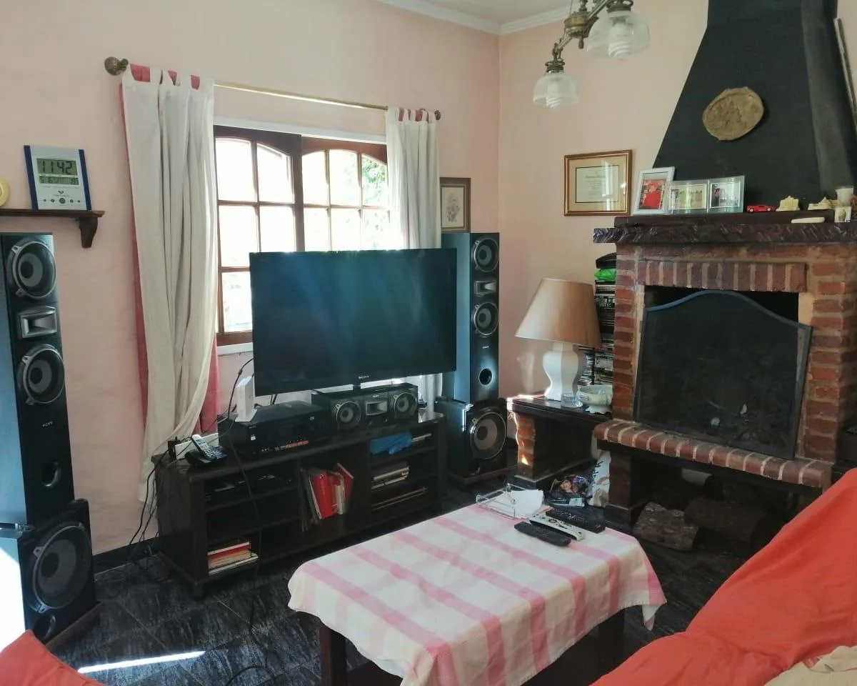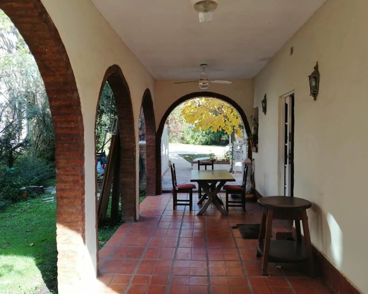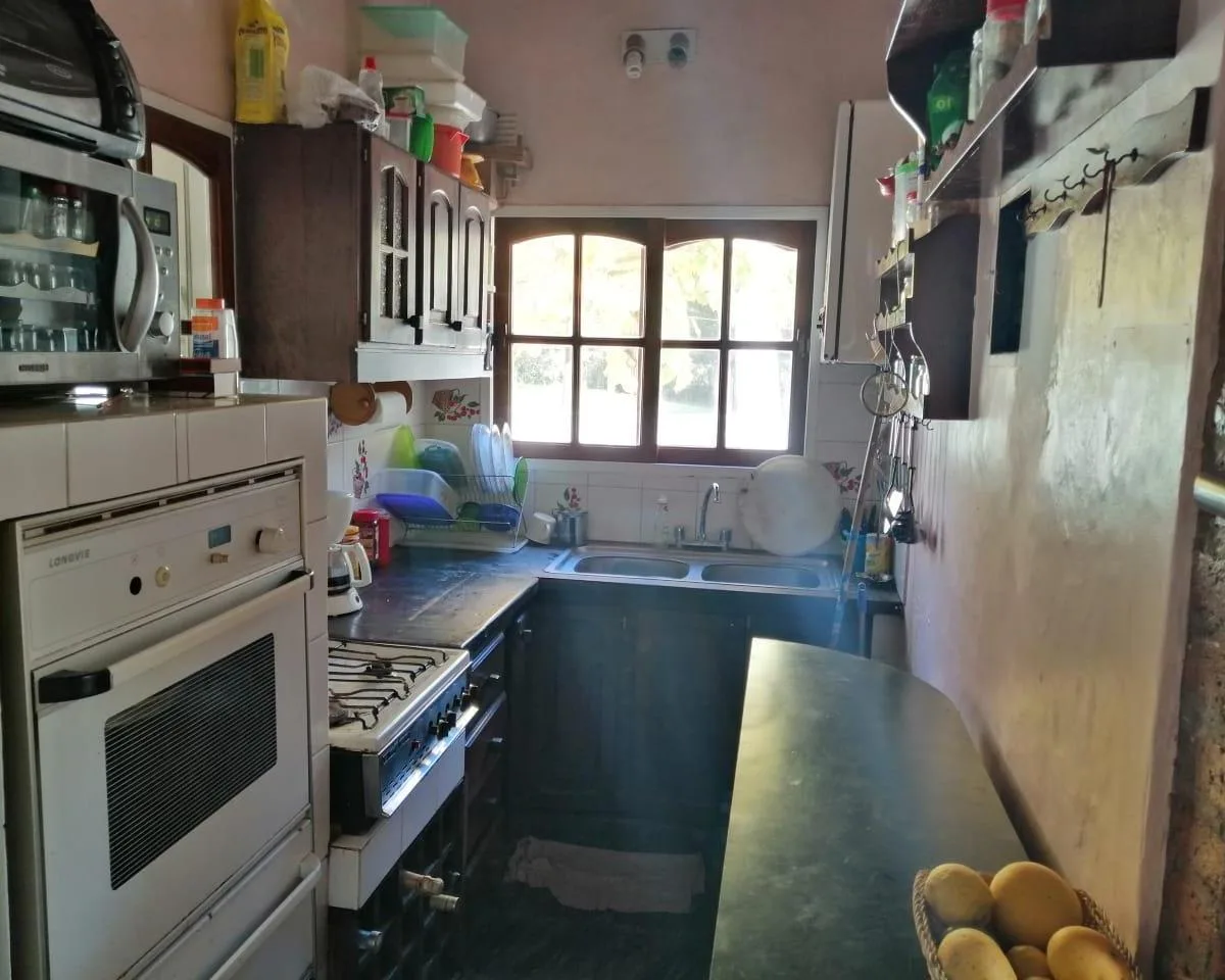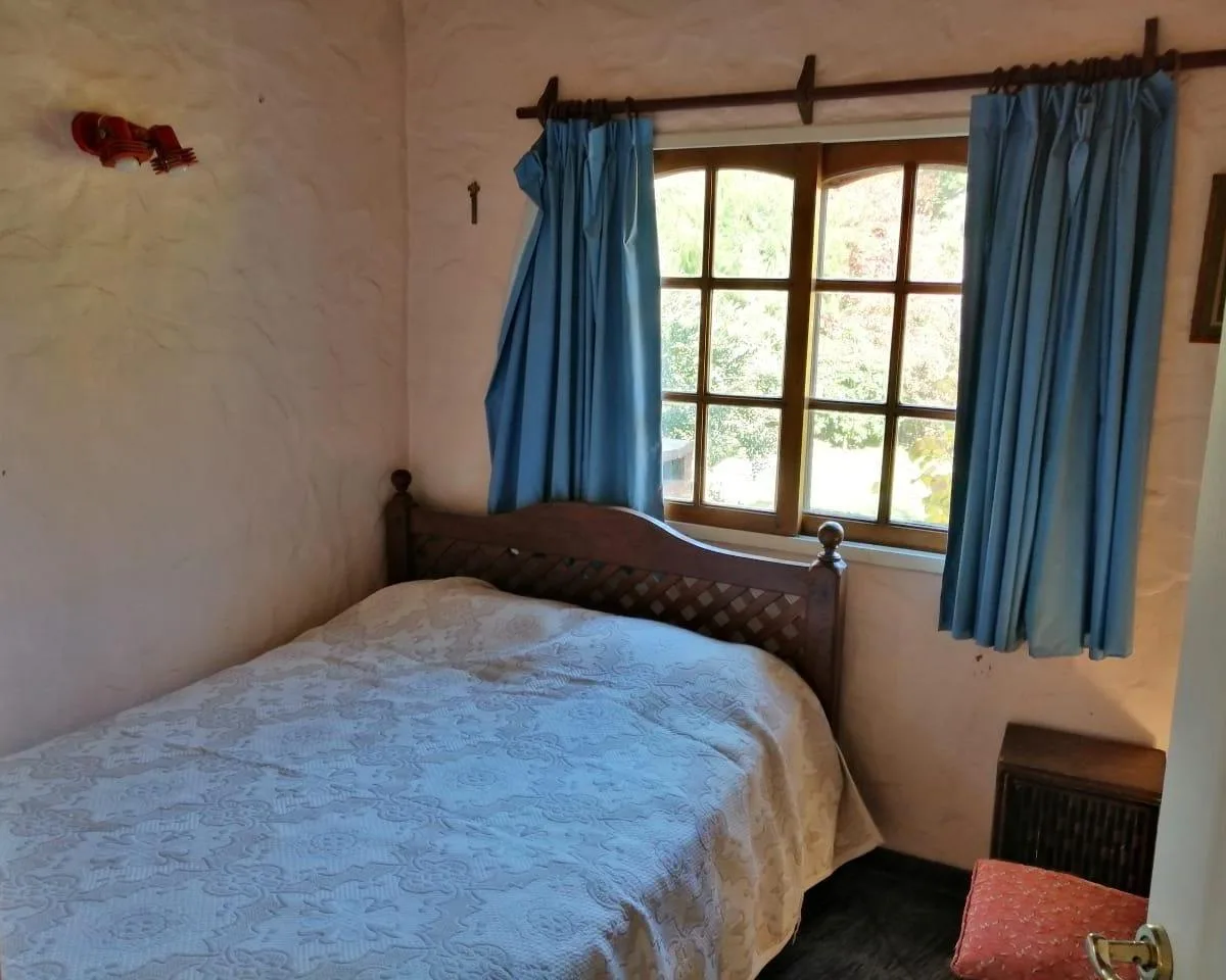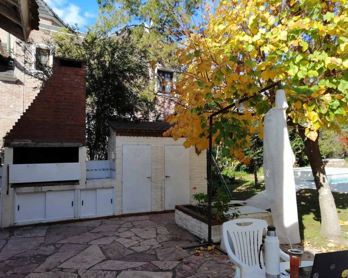 House for annual rent in El Bosque Country Club, located 65.5 km on Route 9, on 2 central lots. The property covers 165 m², with a total land area of 1,300 m². Ground floor: living room with a fireplace, guest toilet, kitchen, small dining area with a bay window, a covered and an uncovered gallery, a pool, and a large garden. Upstairs: 3 bedrooms, the main bedroom with a study, 2 heating and cooling air conditioners, and a full bathroom. Heating is provided by stoves. Annual rent is USD 1,100, p