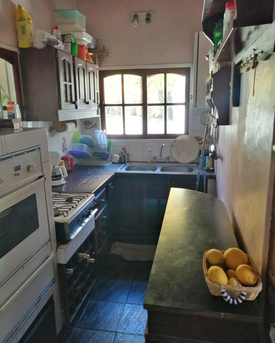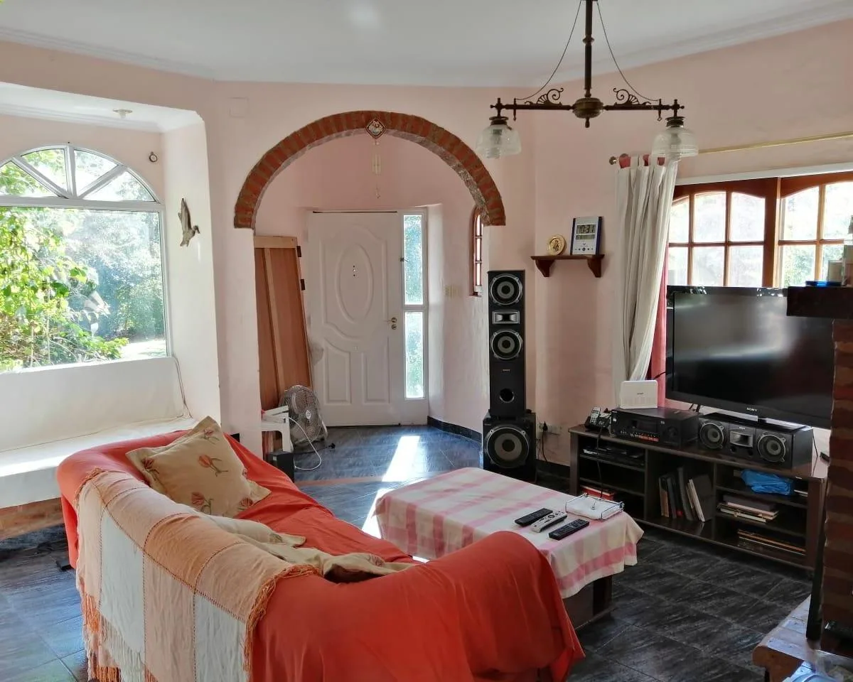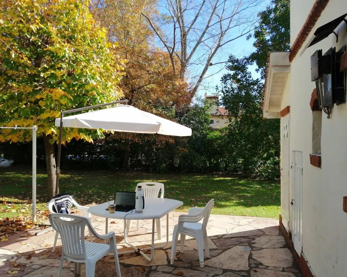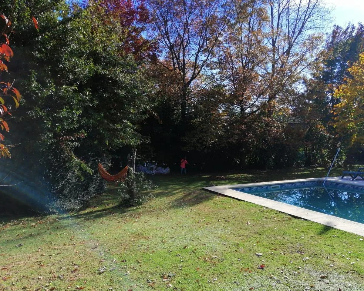 House for annual rent in El Bosque Country Club, located 65.5 km on Route 9, on 2 central lots. The property covers 165 m², with a total land area of 1,300 m². Ground floor: living room with a fireplace, guest toilet, kitchen, small dining area with a bay window, a covered and an uncovered gallery, a pool, and a large garden. Upstairs: 3 bedrooms, the main bedroom with a study, 2 heating and cooling air conditioners, and a full bathroom. Heating is provided by stoves. Annual rent is USD 1,100, p