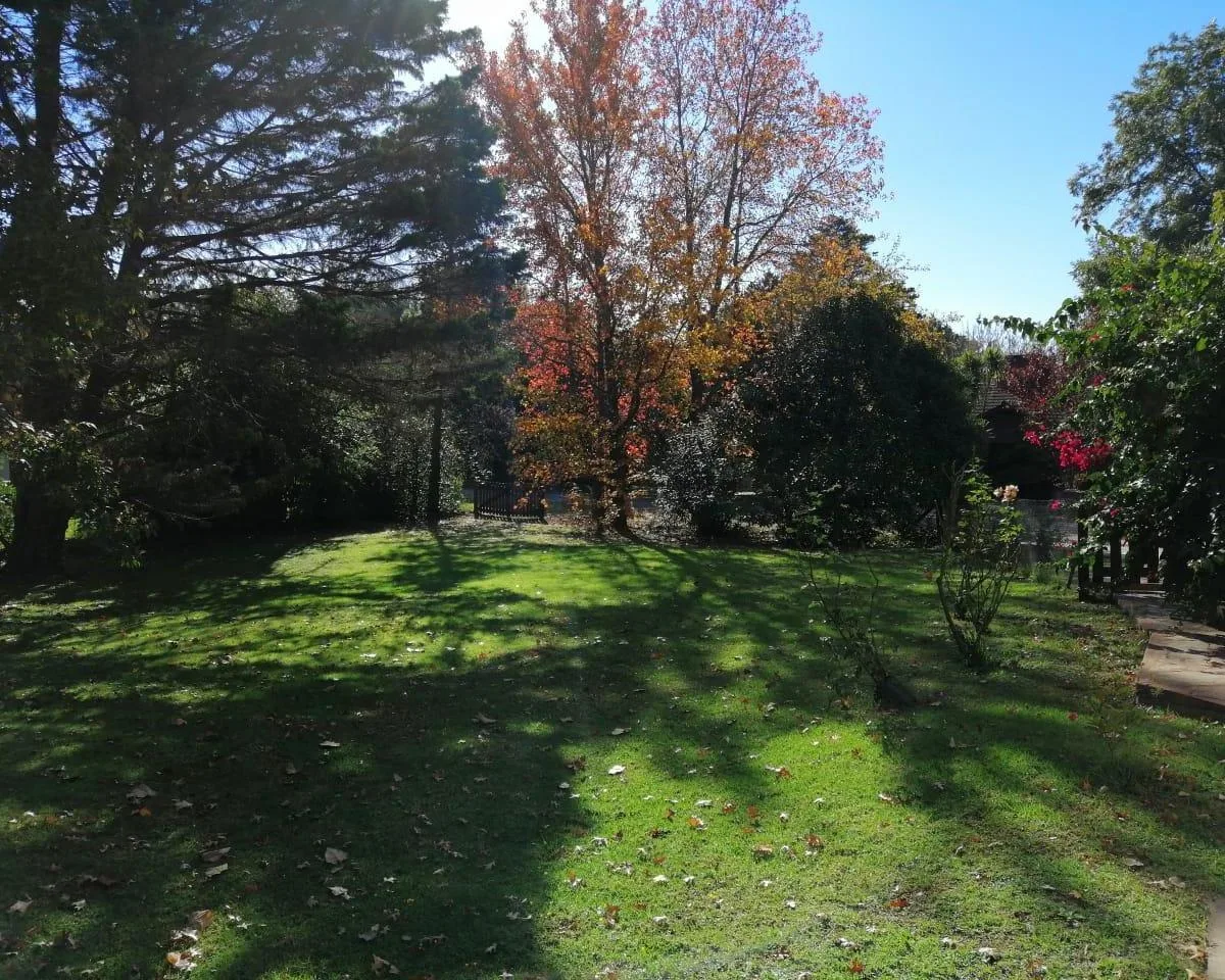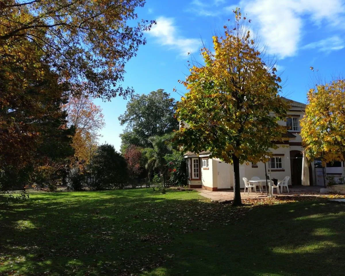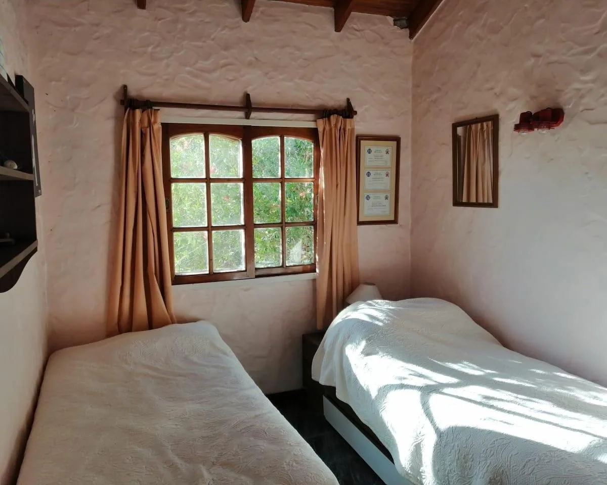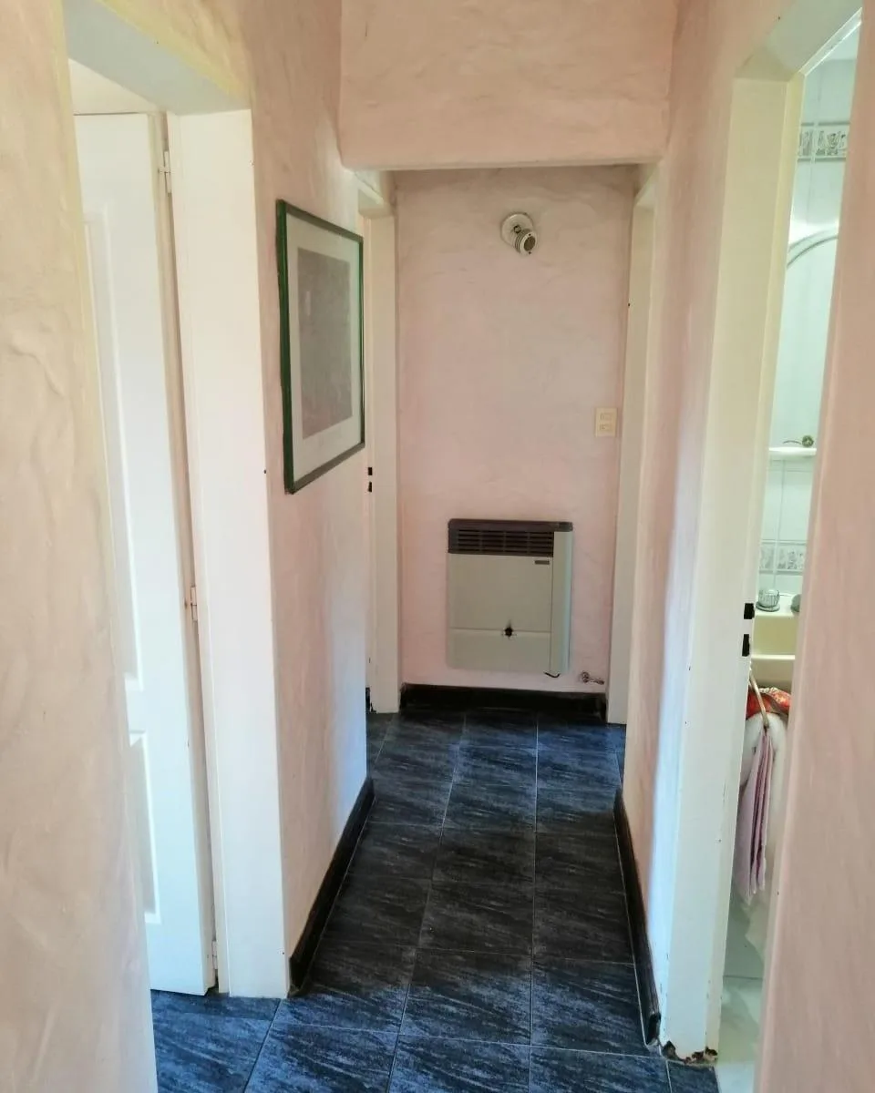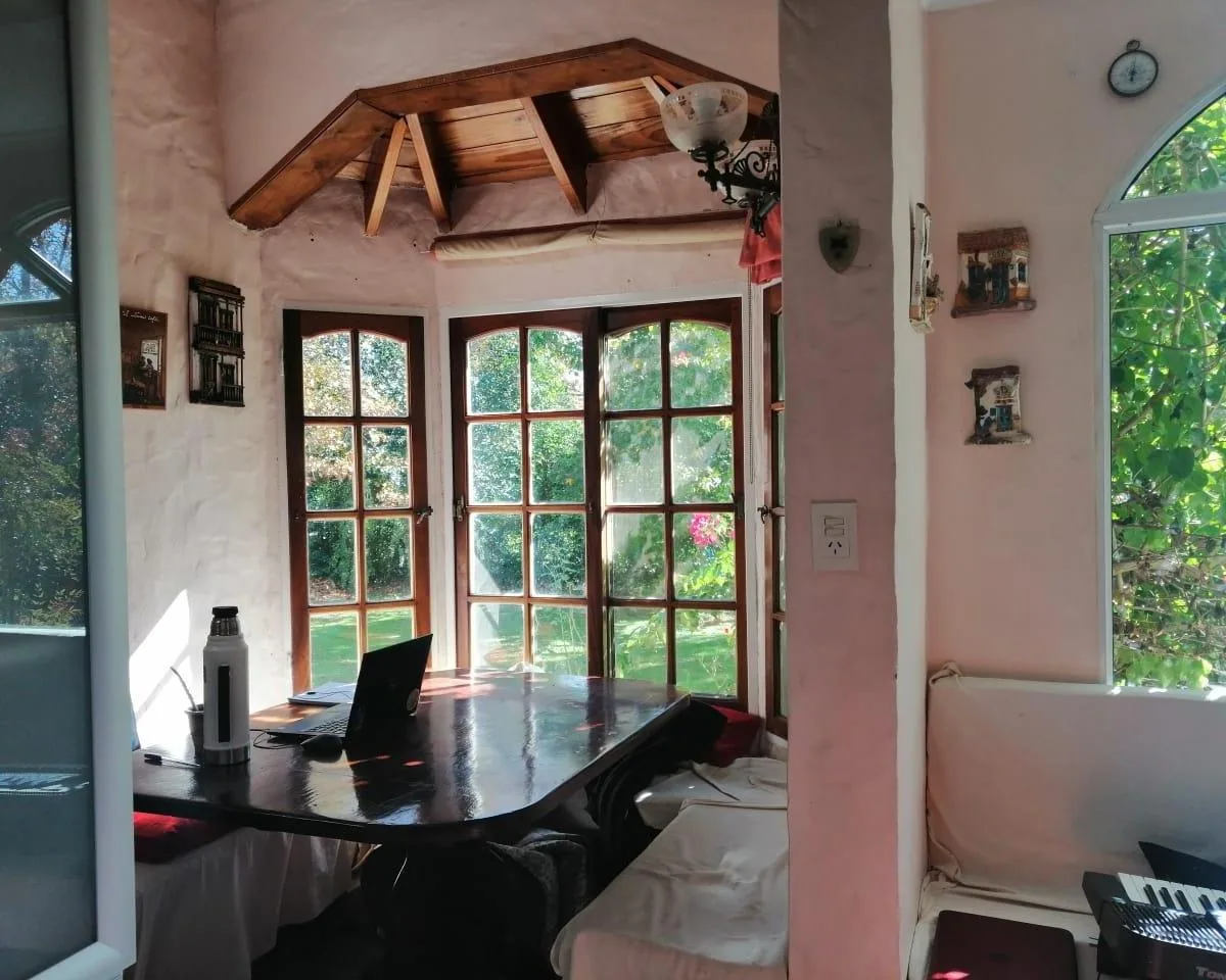 House for annual rent in El Bosque Country Club, located 65.5 km on Route 9, on 2 central lots. The property covers 165 m², with a total land area of 1,300 m². Ground floor: living room with a fireplace, guest toilet, kitchen, small dining area with a bay window, a covered and an uncovered gallery, a pool, and a large garden. Upstairs: 3 bedrooms, the main bedroom with a study, 2 heating and cooling air conditioners, and a full bathroom. Heating is provided by stoves. Annual rent is USD 1,100, p