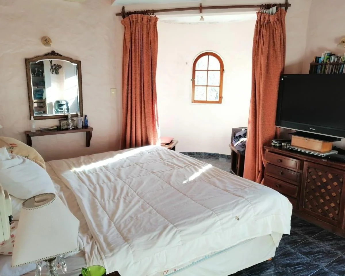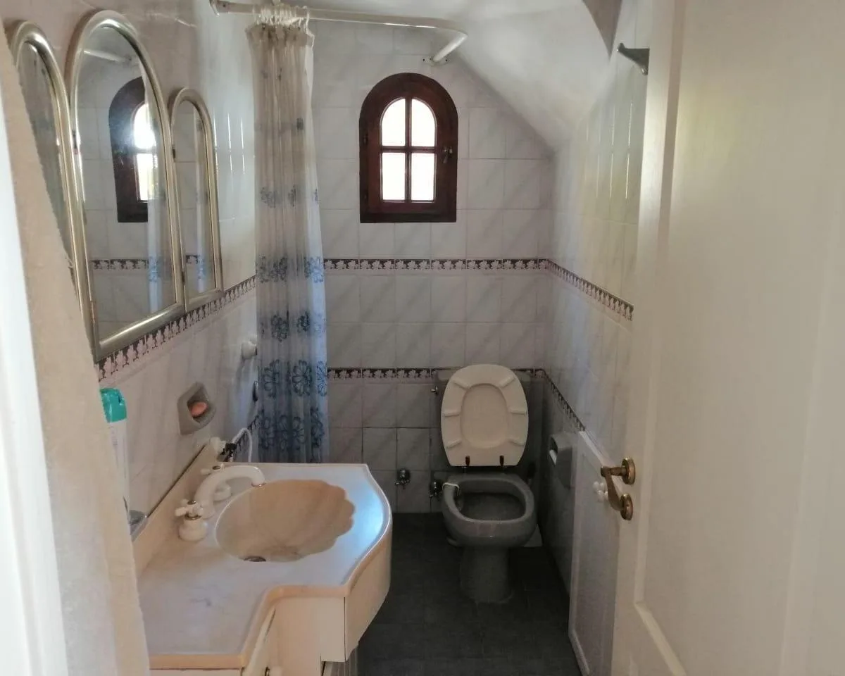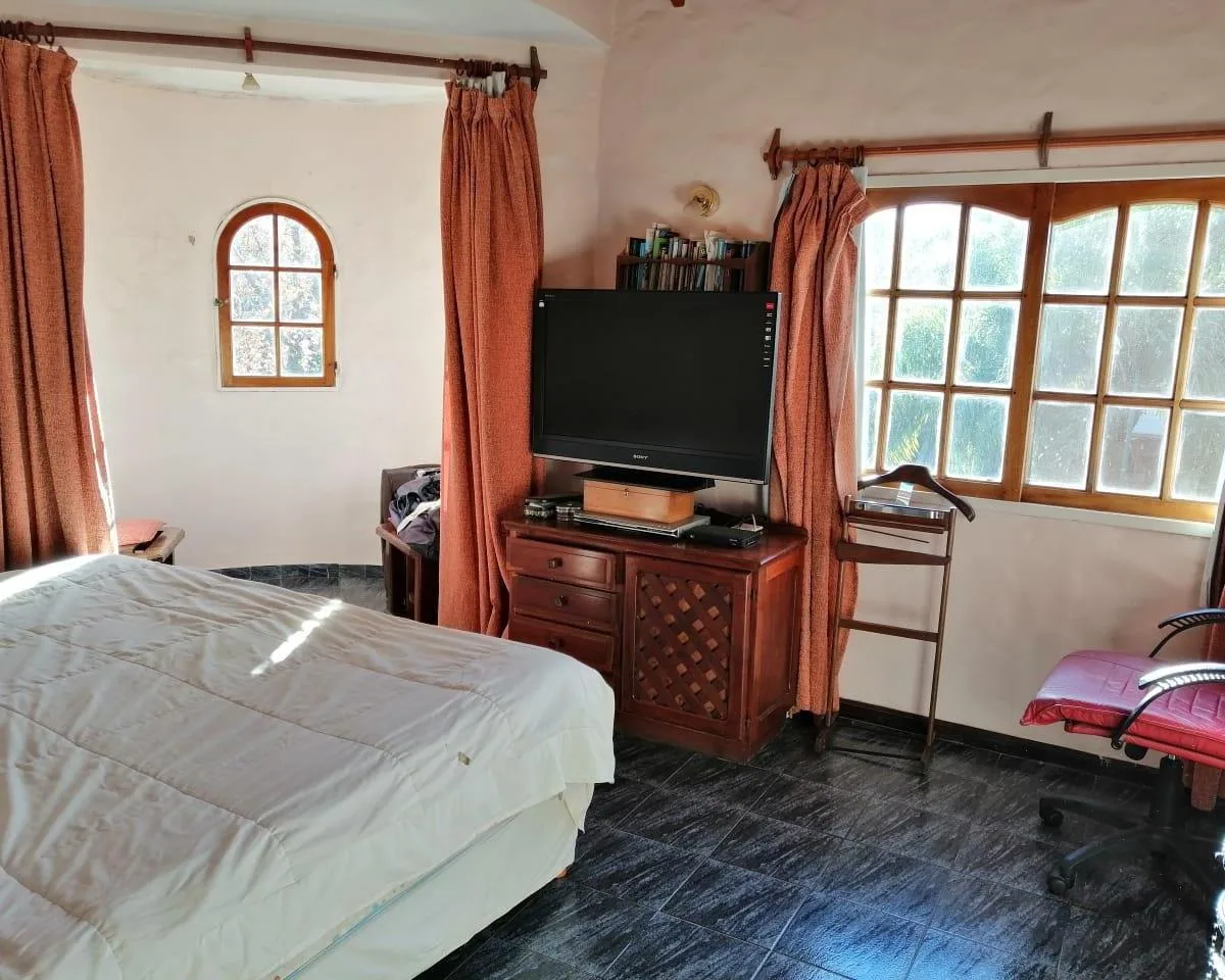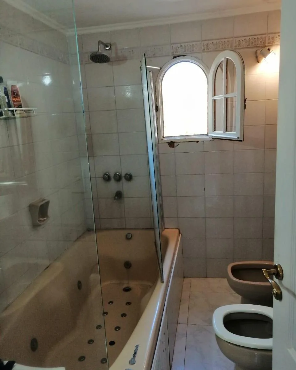 House for annual rent in El Bosque Country Club, located 65.5 km on Route 9, on 2 central lots. The property covers 165 m², with a total land area of 1,300 m². Ground floor: living room with a fireplace, guest toilet, kitchen, small dining area with a bay window, a covered and an uncovered gallery, a pool, and a large garden. Upstairs: 3 bedrooms, the main bedroom with a study, 2 heating and cooling air conditioners, and a full bathroom. Heating is provided by stoves. Annual rent is USD 1,100, p