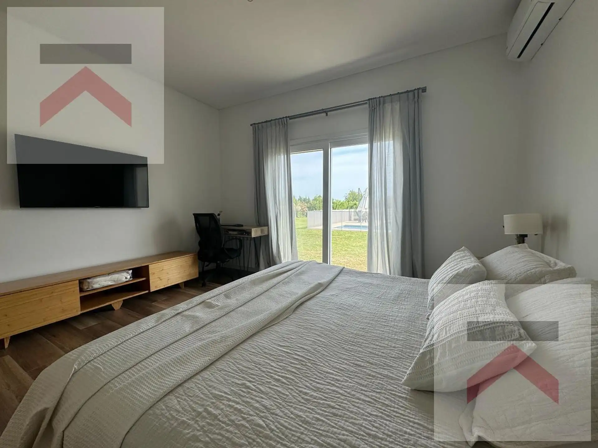 Unfurnished single-family house on a 1,900 m² plot with north orientation. It has a reception hall, a living and dining area, guest toilet, an eat-in kitchen, laundry area, and a staff room with bathroom used as an office. There are 3 bedrooms, one en suite with a dressing room, plus 2 full bathrooms. The property includes a covered gallery with a grill, a wooden playground structure, a pool with protection, radiator heating with a gas boiler, and split air conditioning for hot and cold with a s
