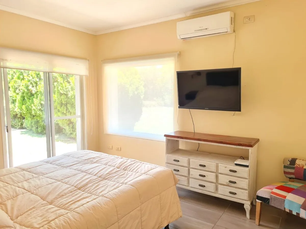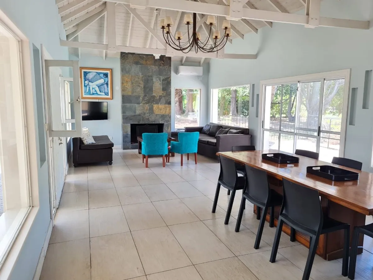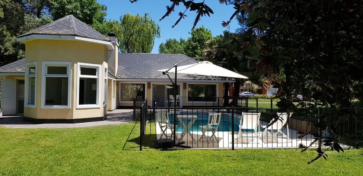 House for rent in Country Boca Raton, Villa Astolfi on Ruta 25 (km 12), Buenos Aires. The property has 200 m² covered within a 1030 m² lot, built in 2000 and completely refurbished. It has 3 bedrooms with walk-in closet and built-in wardrobes, 2 full bathrooms, a separate kitchen with an island, and a very large living-dining room. Parking includes 3 spaces for cars, plus visitor parking; outdoor features include a heated pool, uncovered pool, and a covered grill area. Country amenities include