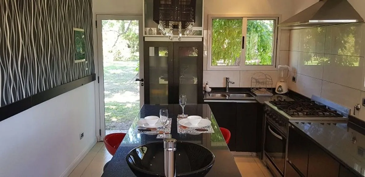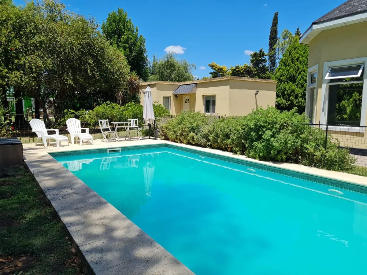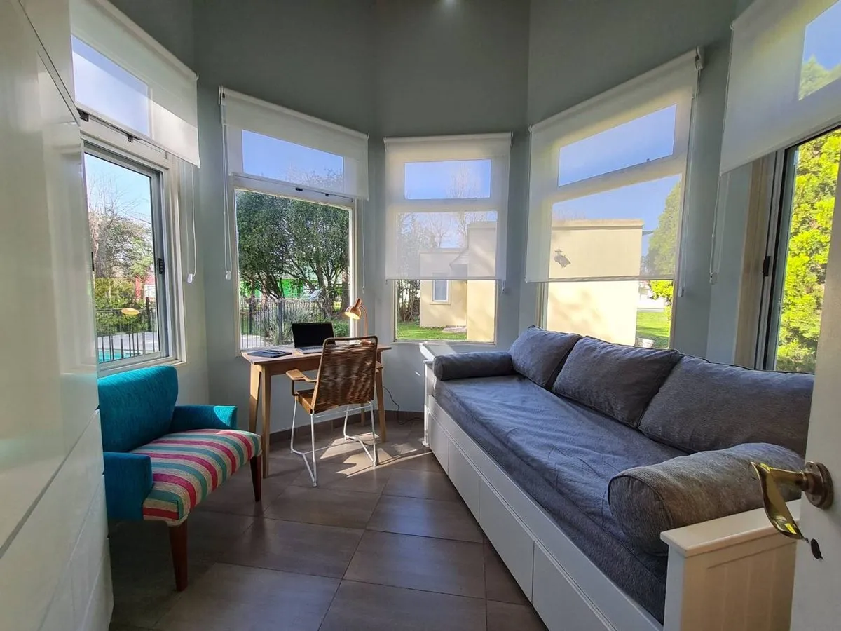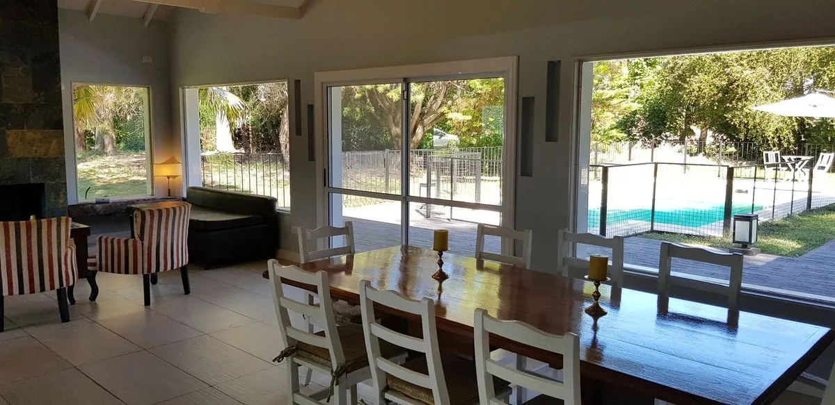 House for rent in Country Boca Raton, Villa Astolfi on Ruta 25 (km 12), Buenos Aires. The property has 200 m² covered within a 1030 m² lot, built in 2000 and completely refurbished. It has 3 bedrooms with walk-in closet and built-in wardrobes, 2 full bathrooms, a separate kitchen with an island, and a very large living-dining room. Parking includes 3 spaces for cars, plus visitor parking; outdoor features include a heated pool, uncovered pool, and a covered grill area. Country amenities include