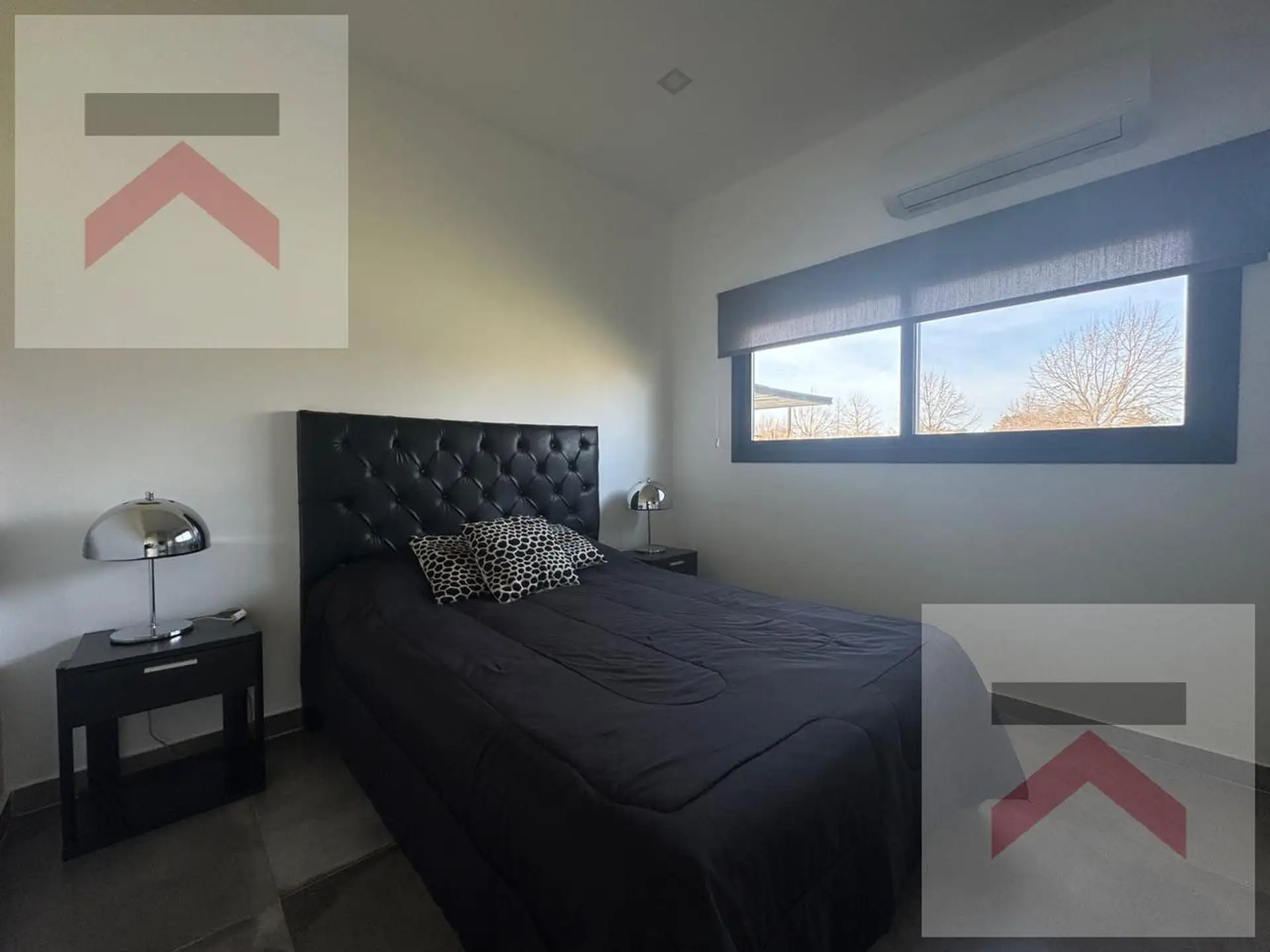 Single-storey house fully furnished and equipped for 6 people. Three bedrooms, including a master suite with double bed, dressing room and full bathroom, plus two additional bedrooms with built-in closets; one has a double bed and the other two single beds, and there is a second full bathroom. Living area with integrated dining and kitchen, laundry room, air conditioning (hot and cold) in all rooms, a double-sided wood-burning salamander, and two gas heaters. Covered gallery with grill and wood-
