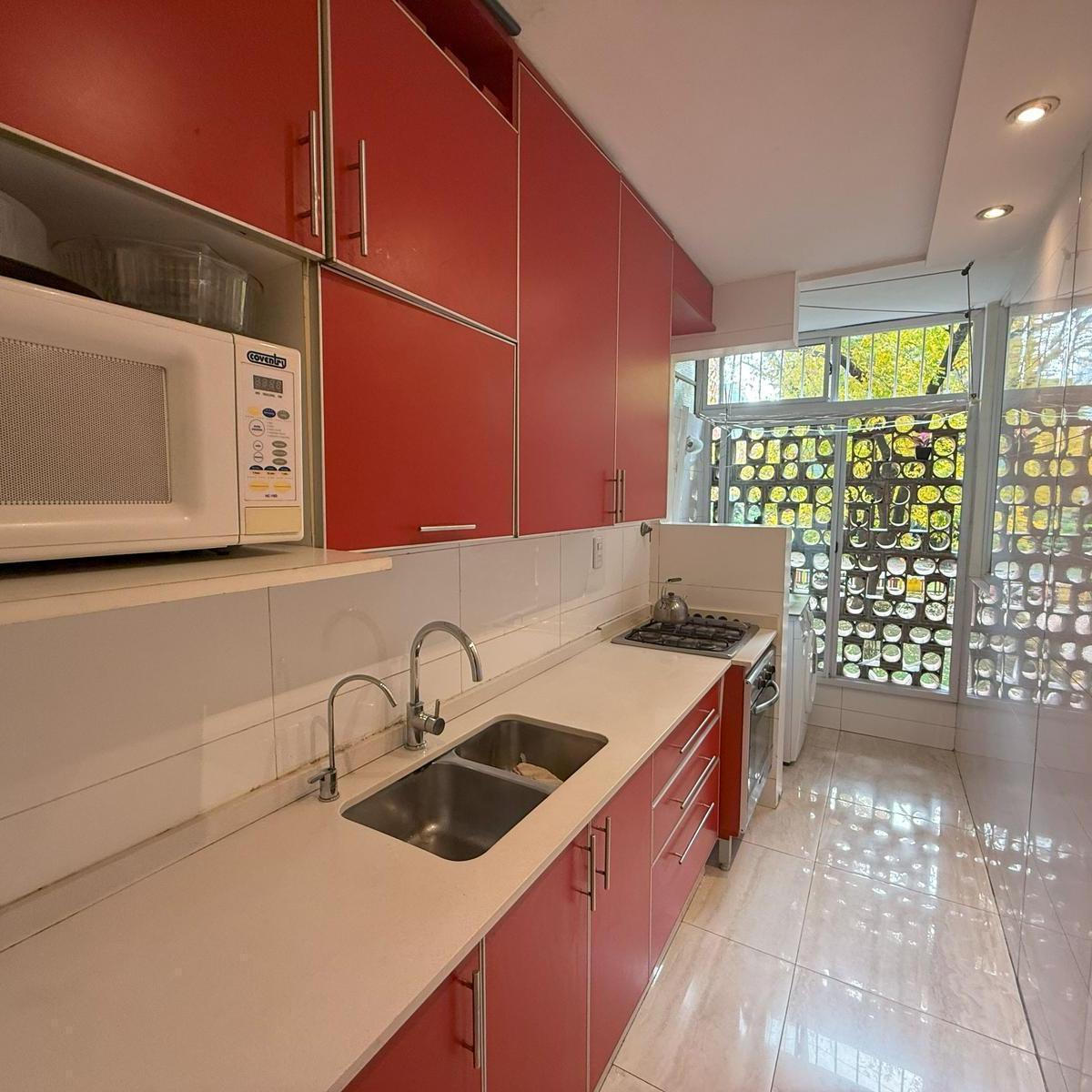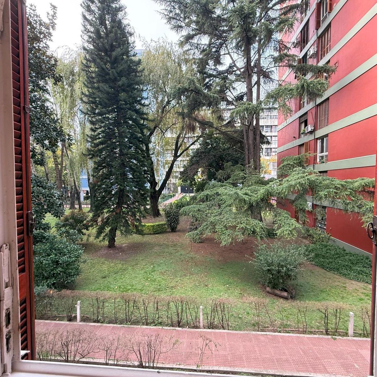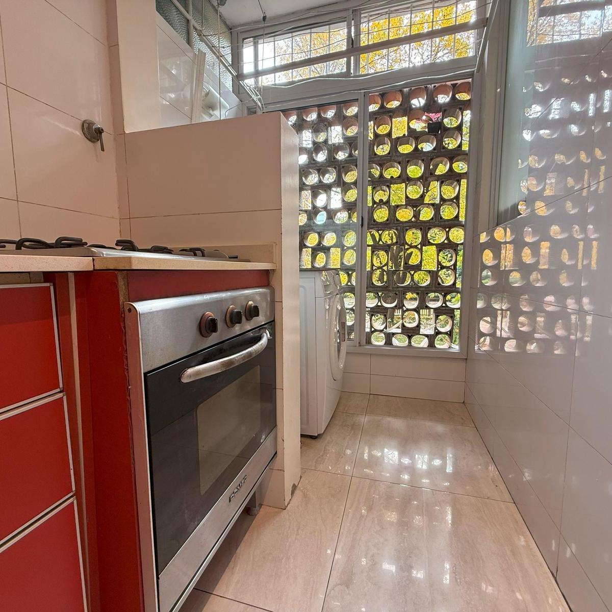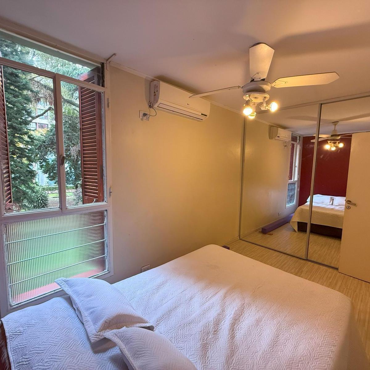 Four-room apartment in Catalinas Sur, La Boca. The unit is empty and ready to move in, with 3 bedrooms, including storage space in the main bedroom and in the hallways. There is a bright living-dining area with an open view of the park, a modern kitchen with a breakfast bar, and an independent laundry room. Three installed air conditioners and a ceiling fan are included, with porcelain tile floors; all rooms receive natural light and face the green park view.