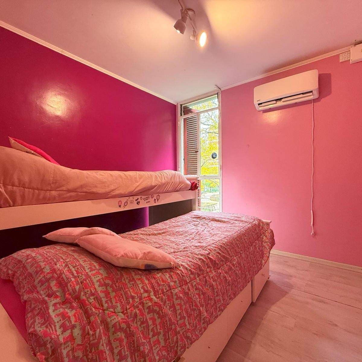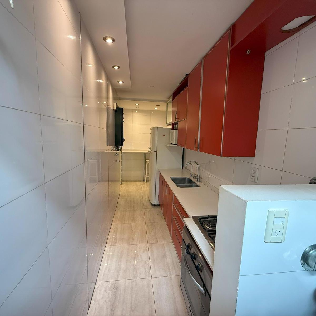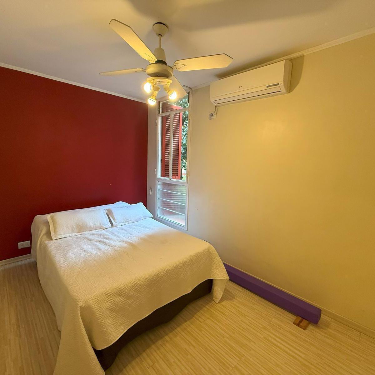 Four-room apartment in Catalinas Sur, La Boca. The unit is empty and ready to move in, with 3 bedrooms, including storage space in the main bedroom and in the hallways. There is a bright living-dining area with an open view of the park, a modern kitchen with a breakfast bar, and an independent laundry room. Three installed air conditioners and a ceiling fan are included, with porcelain tile floors; all rooms receive natural light and face the green park view.