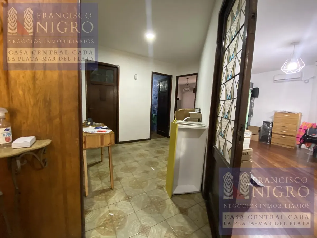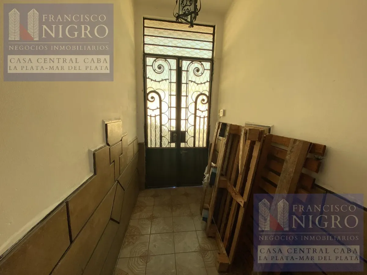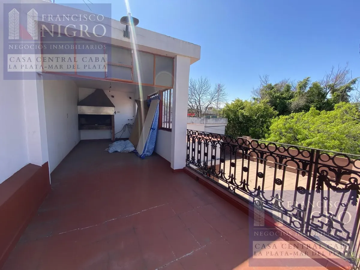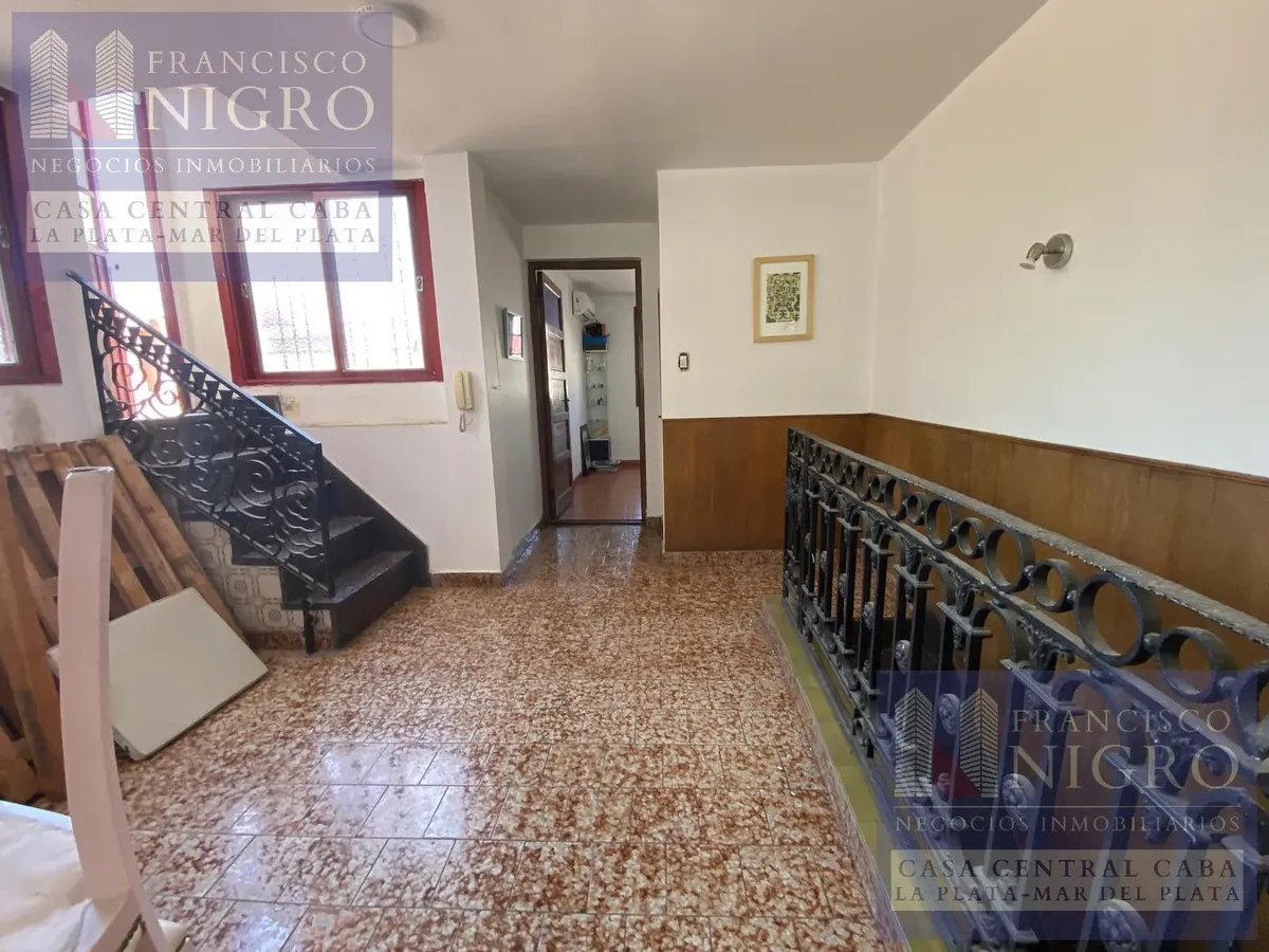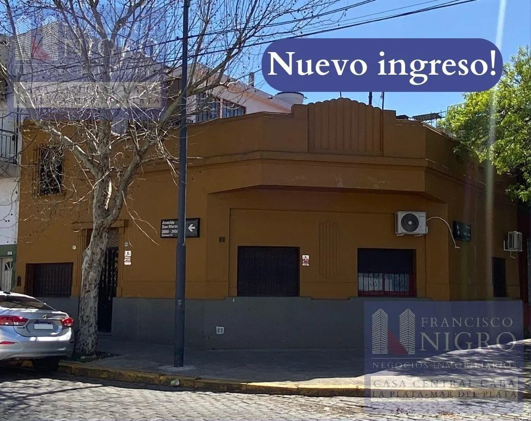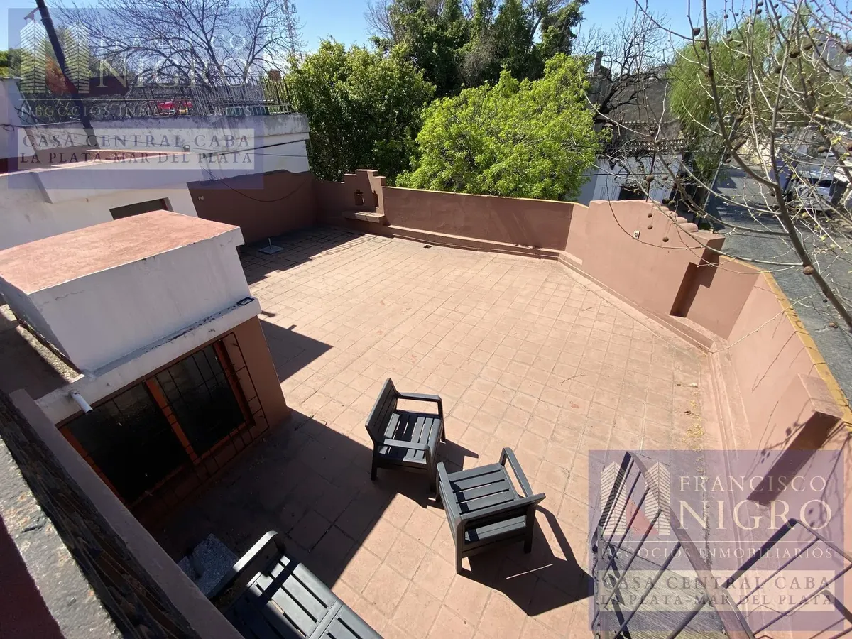 Corner house on 2 floors with a terrace and a grill on Av. San Martin esquina Biarritz in La Paternal, Comuna 15. The layout includes an irregular reception living room, a dining living room facing the ochava, two bedrooms with windows (one to Biarritz with a fitted wardrobe), a full bathroom with a bathtub, a second bedroom window to an interior patio, and a daily eat-in kitchen where the former garage has been converted into a storage room. Upstairs there is a distribution/TV room, a toilet, a