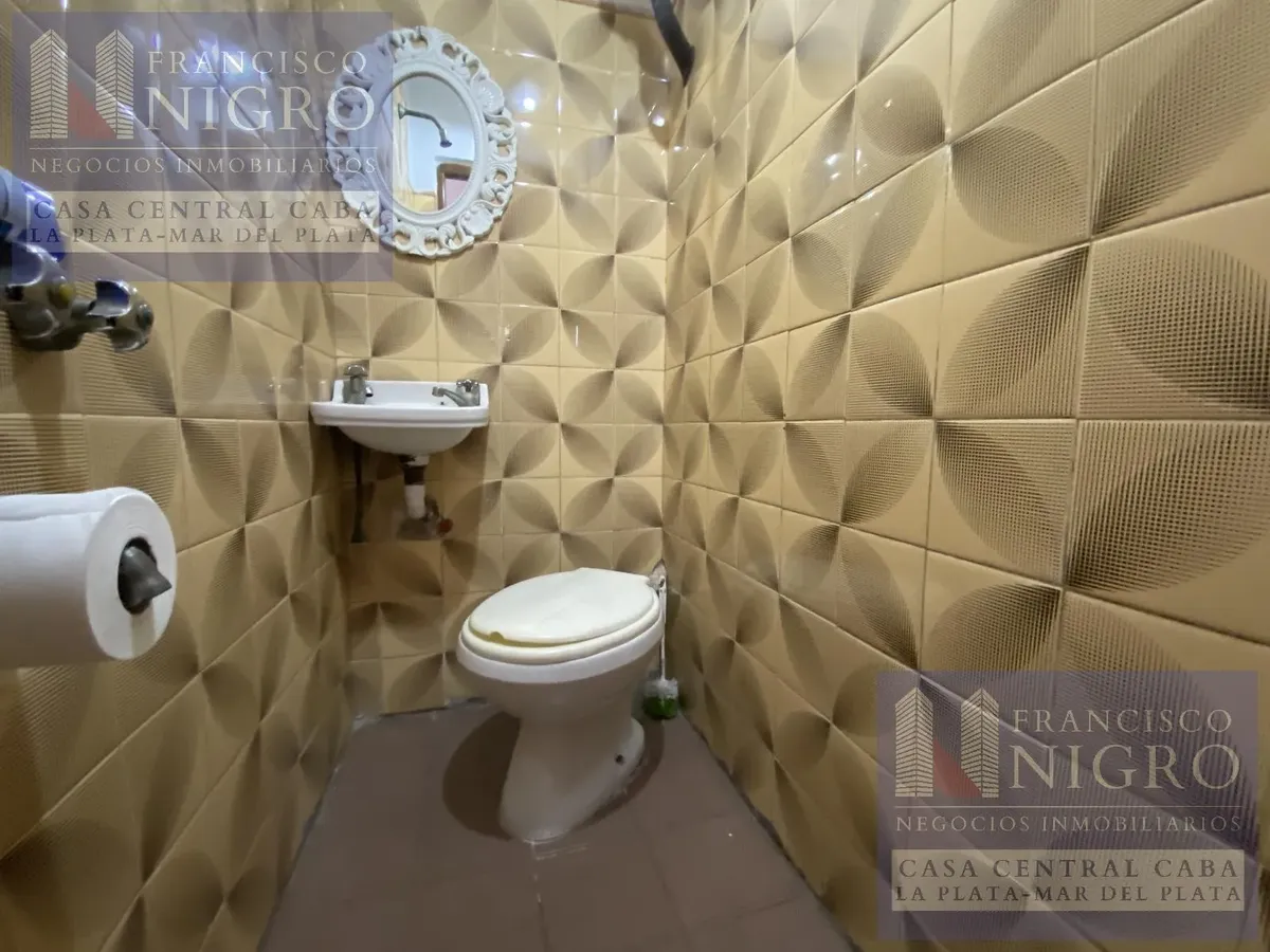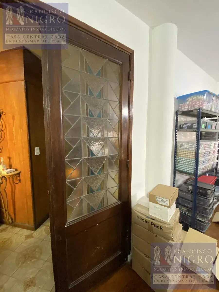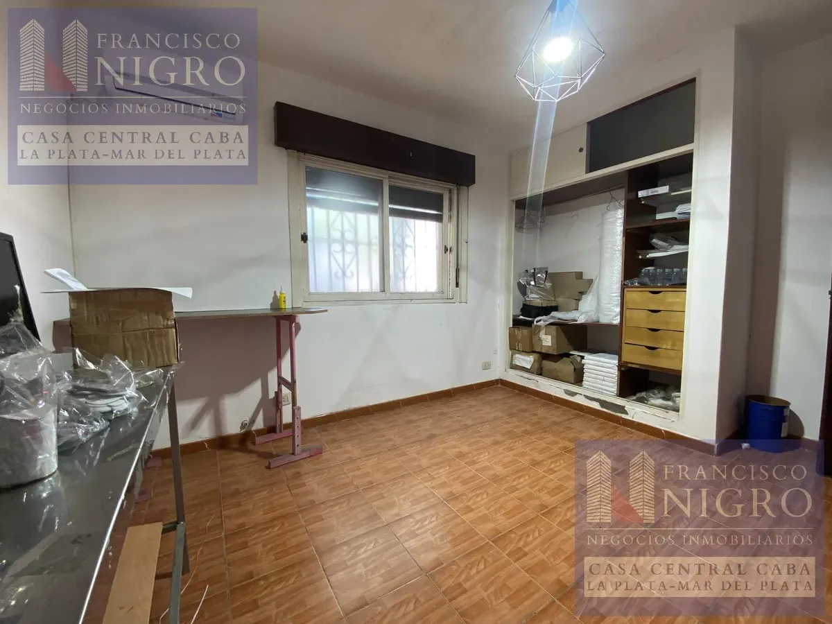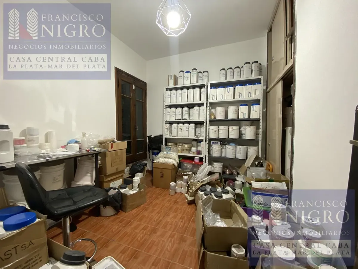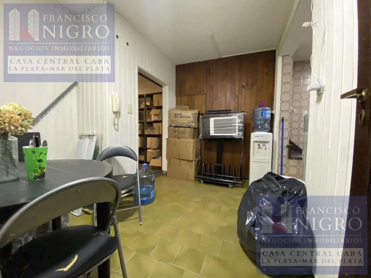 Corner house on 2 floors with a terrace and a grill on Av. San Martin esquina Biarritz in La Paternal, Comuna 15. The layout includes an irregular reception living room, a dining living room facing the ochava, two bedrooms with windows (one to Biarritz with a fitted wardrobe), a full bathroom with a bathtub, a second bedroom window to an interior patio, and a daily eat-in kitchen where the former garage has been converted into a storage room. Upstairs there is a distribution/TV room, a toilet, a