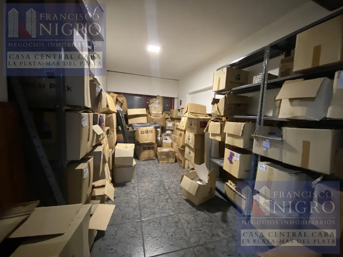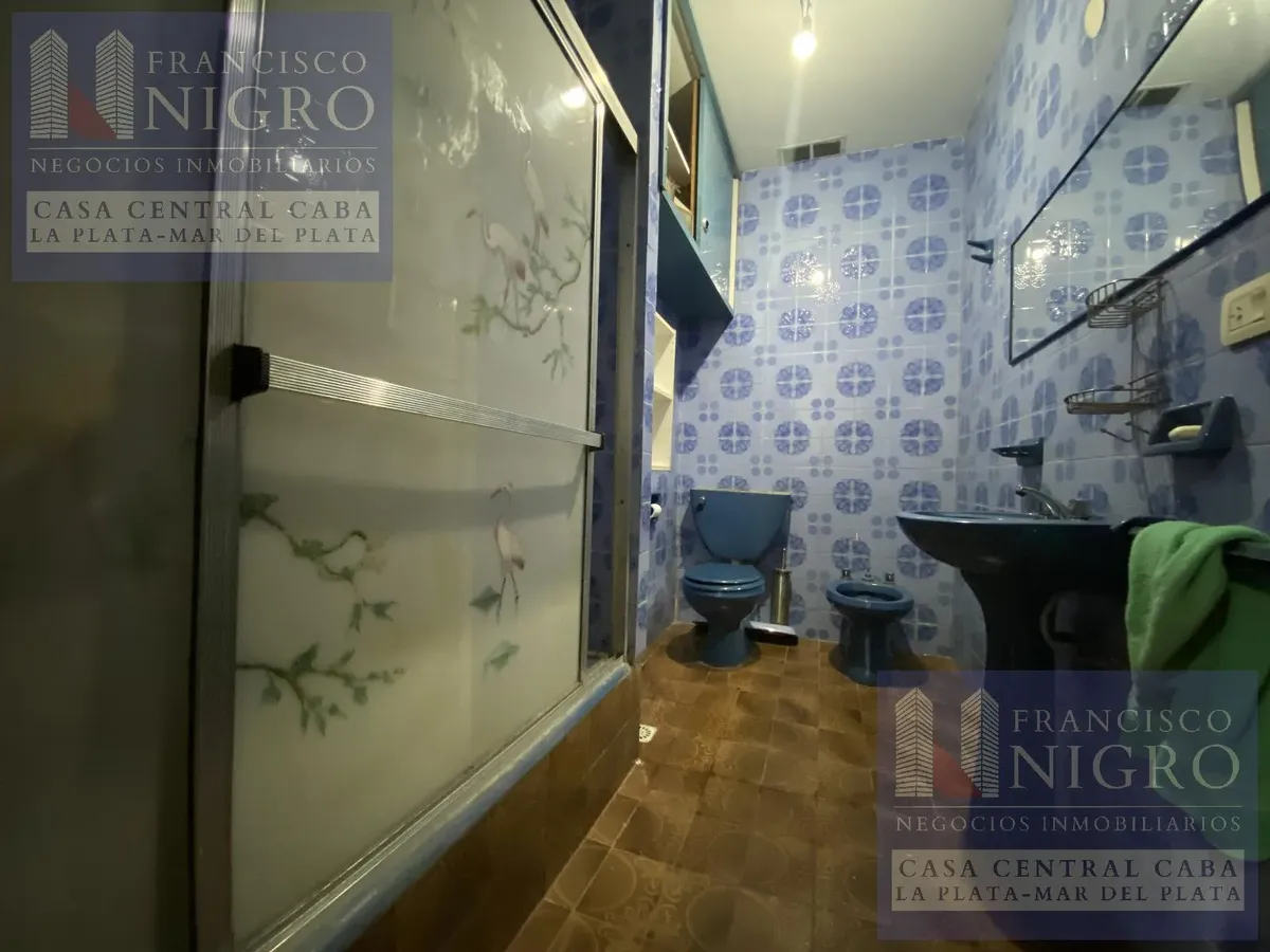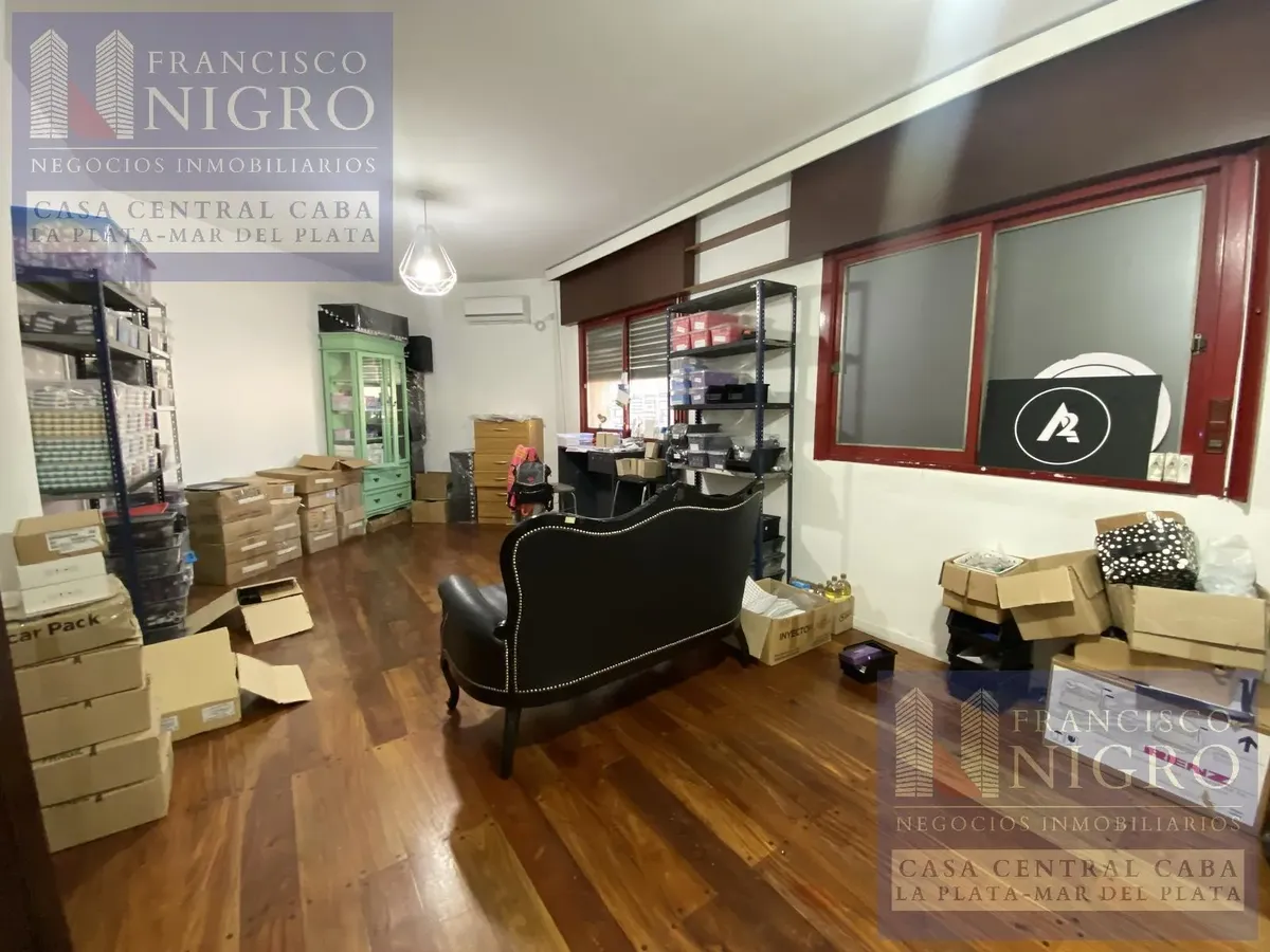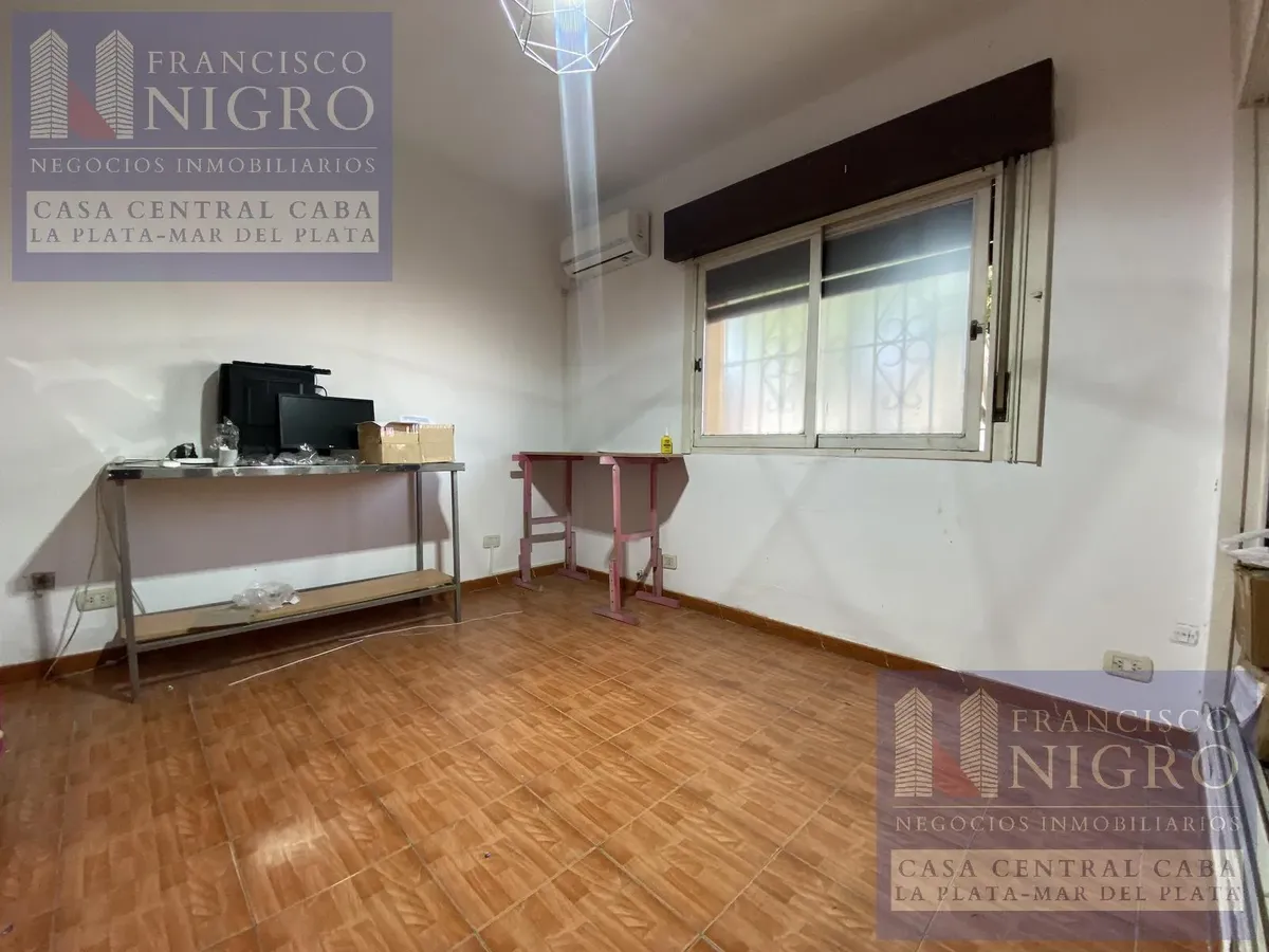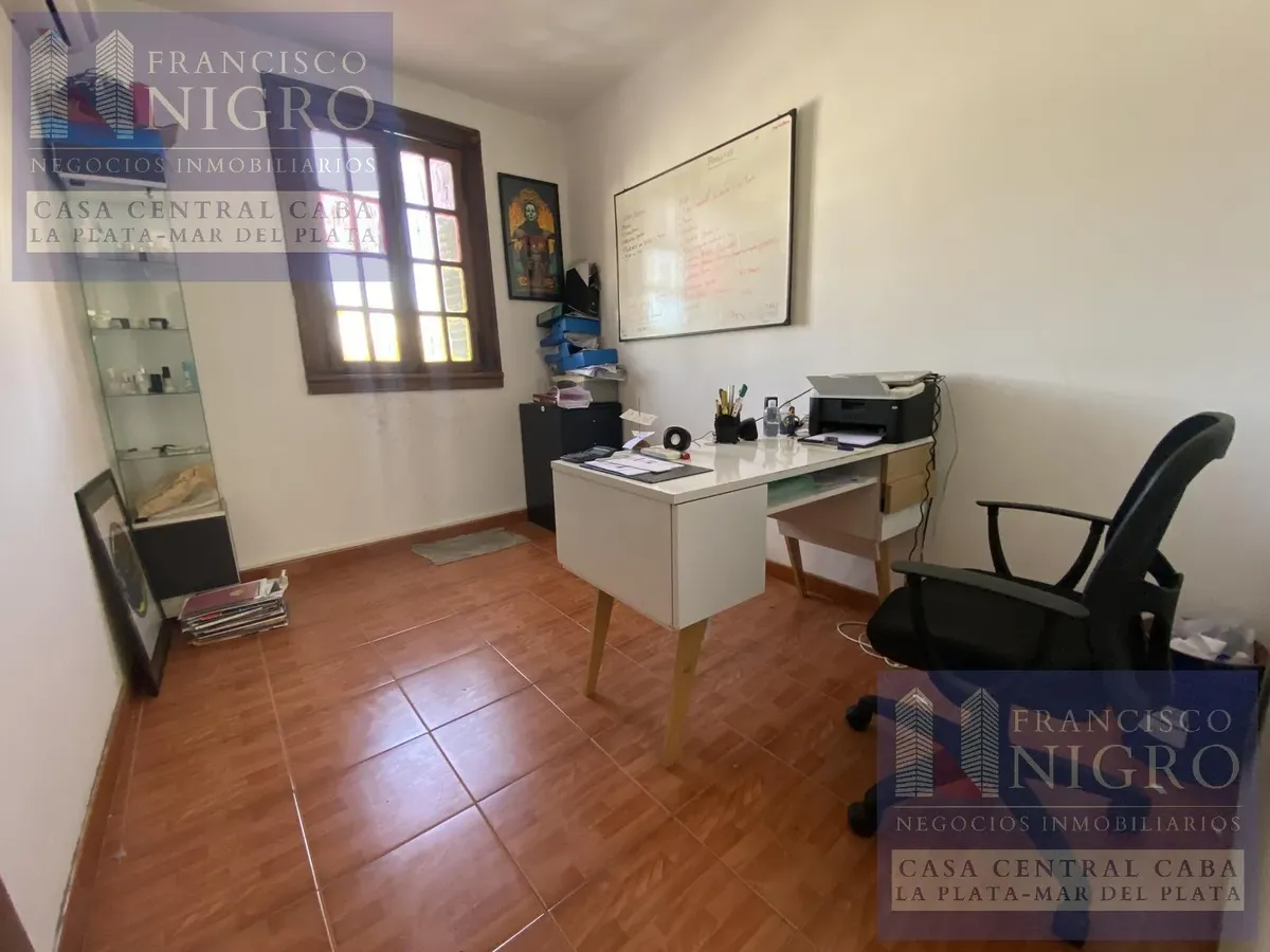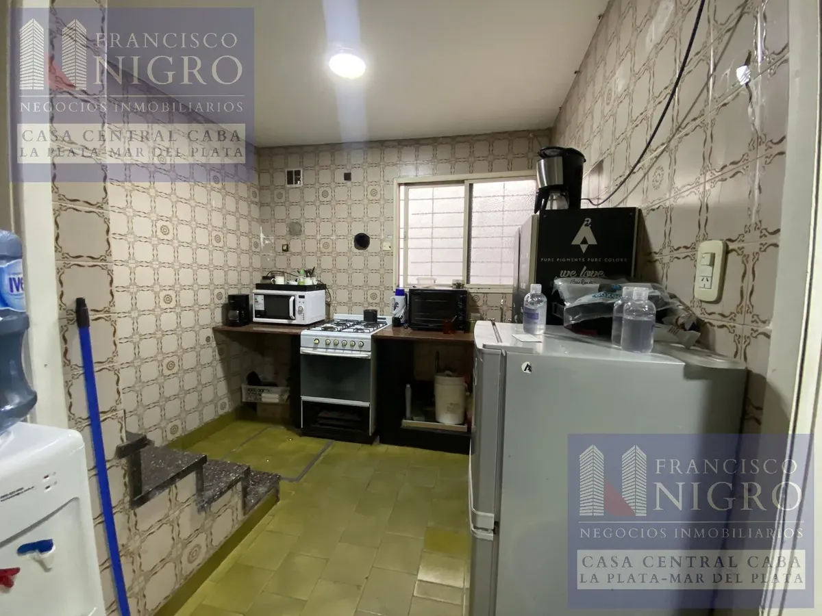 Corner house on 2 floors with a terrace and a grill on Av. San Martin esquina Biarritz in La Paternal, Comuna 15. The layout includes an irregular reception living room, a dining living room facing the ochava, two bedrooms with windows (one to Biarritz with a fitted wardrobe), a full bathroom with a bathtub, a second bedroom window to an interior patio, and a daily eat-in kitchen where the former garage has been converted into a storage room. Upstairs there is a distribution/TV room, a toilet, a
