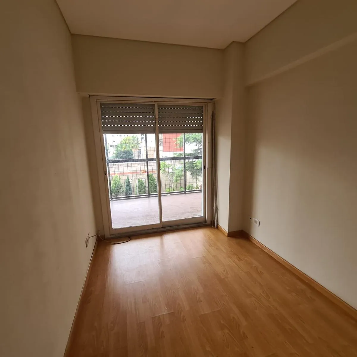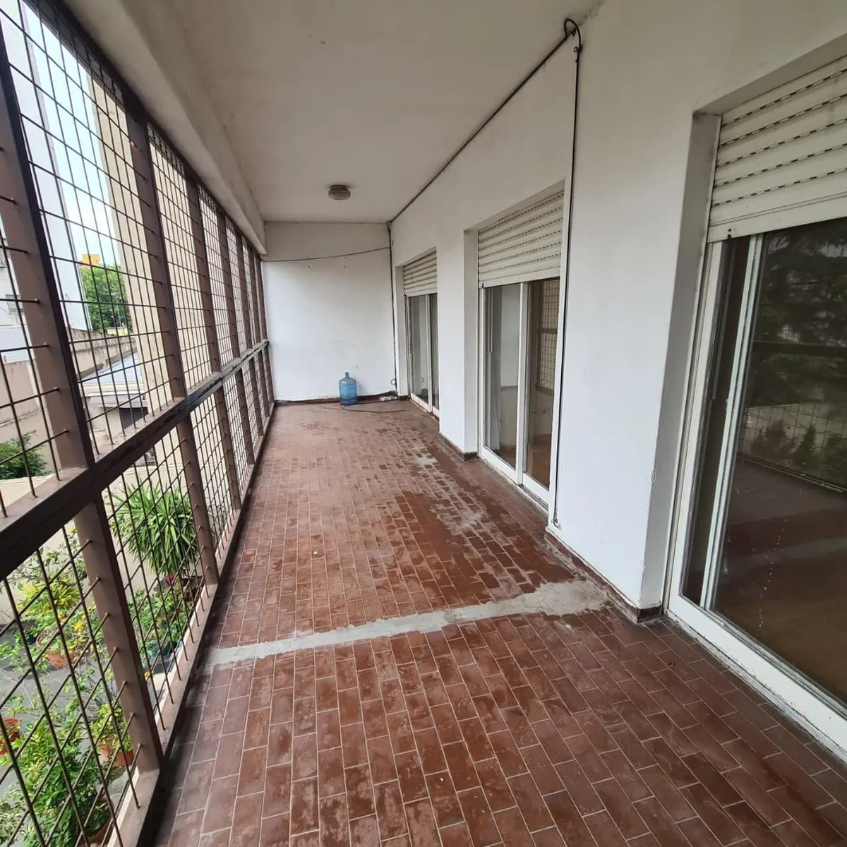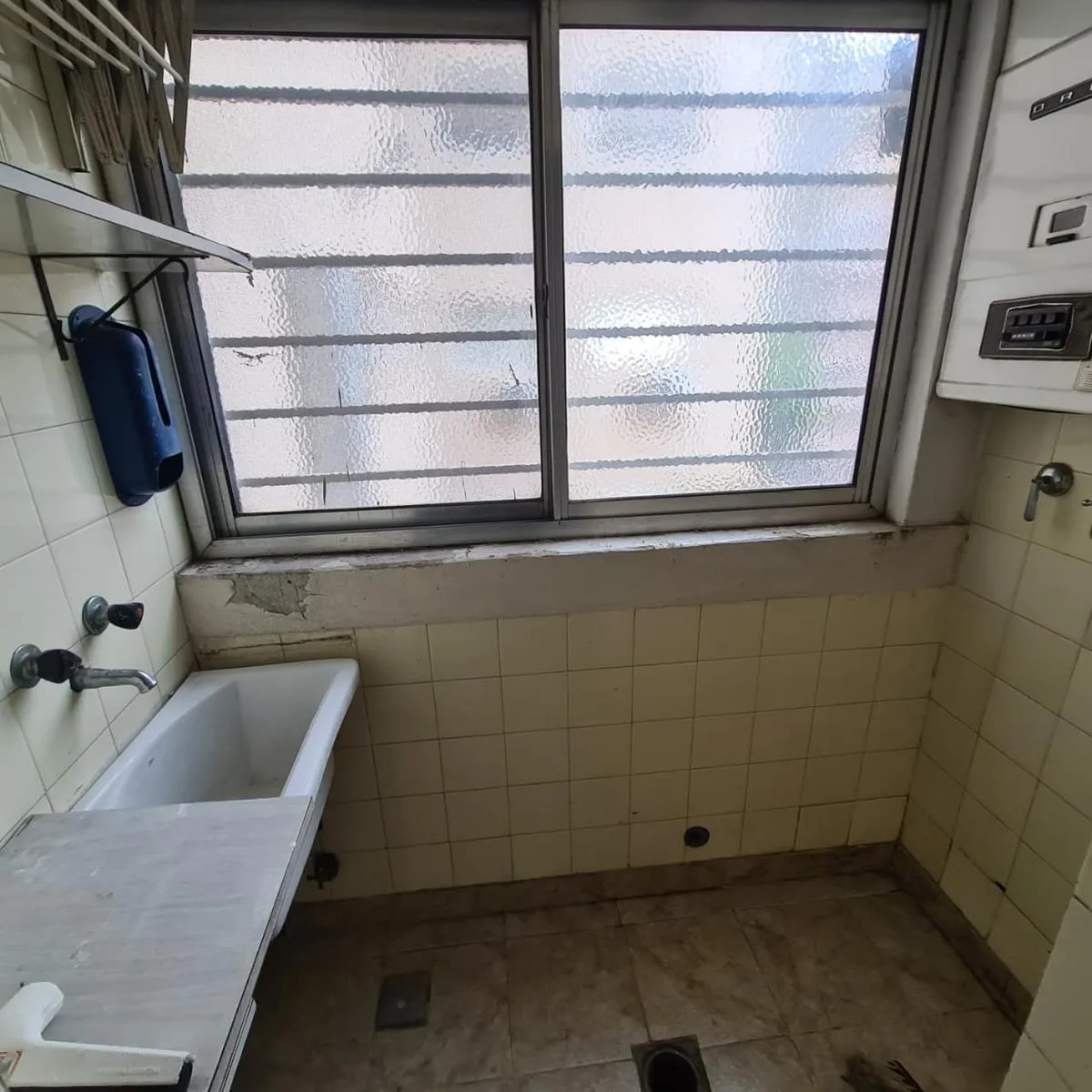 Four-room apartment in an older, category building (about 40 years), with a long balcony on the courtyard side. The unit has a 2.90 x 6.50 m living-dining room with ceramic flooring and direct access to an 8.30 x 1.95 m balcony, plus three bedrooms, three bathrooms (including a toilet) and a separate laundry area. Heating is provided by radiant slab. The building has a communal room (SUM) and the listing states approximate building fees of $200,000, updated quarterly by IPC; the tenant is also r