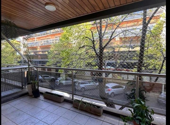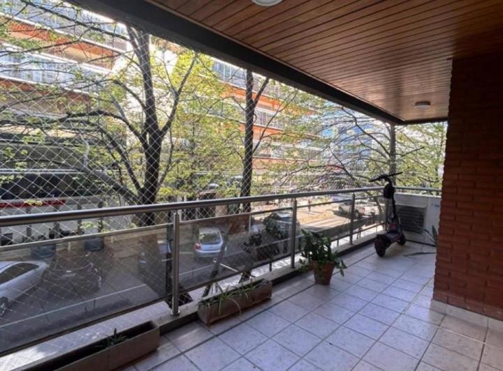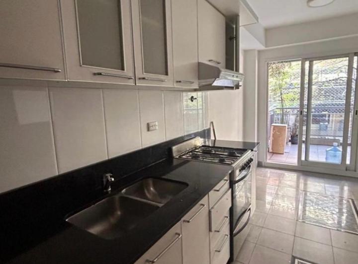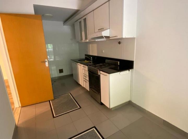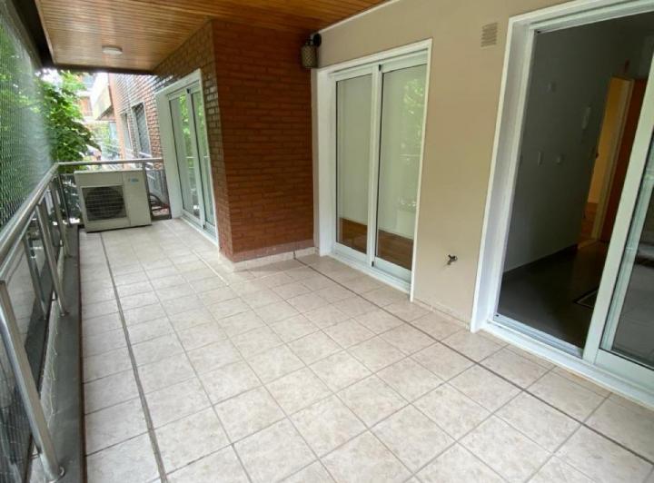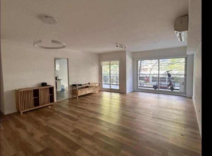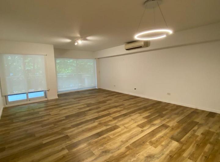 Unfurnished four-room apartment (3 bedrooms) in Puerto Madero. The half-floor unit has a living-dining area, reception toilet, separate kitchen with a daily dining area, a full bathroom, and a primary bedroom en suite with a dressing room. There is a street-facing continuous balcony and an assigned parking space. Building amenities include an outdoor pool with solarium, gym, sauna, communal room (SUM), laundry and 24-hour security.