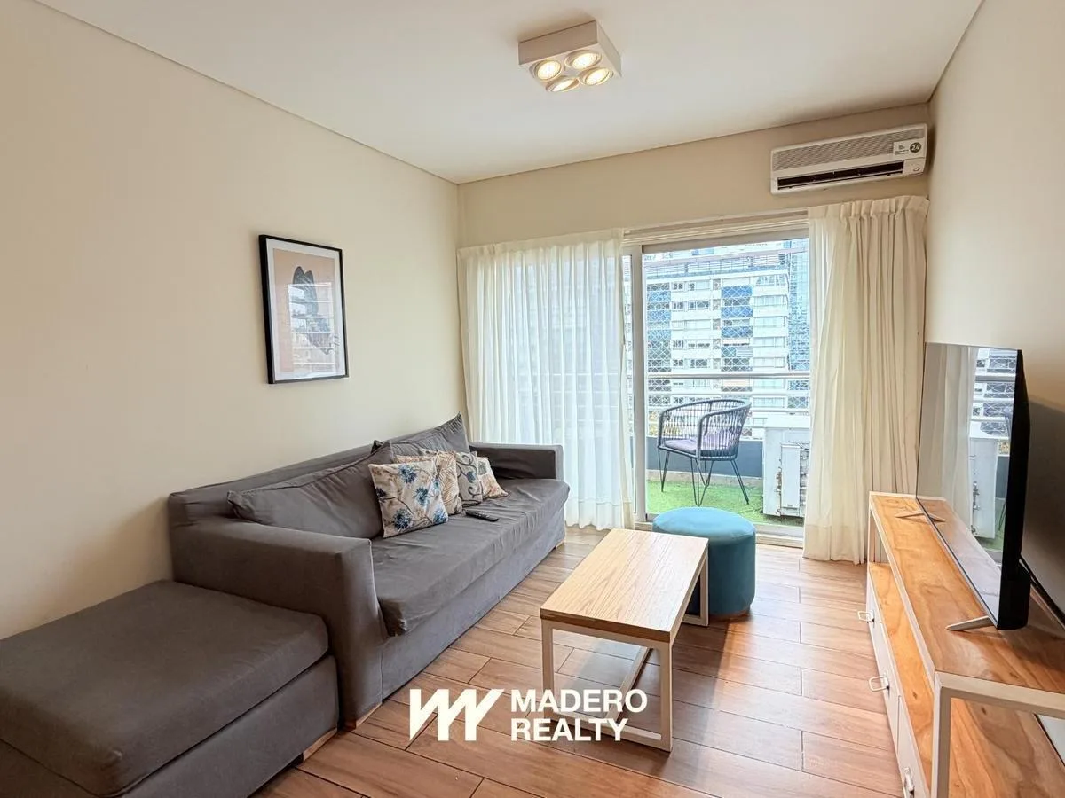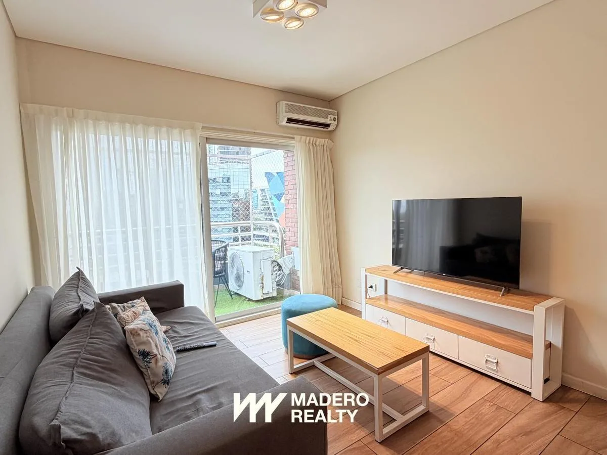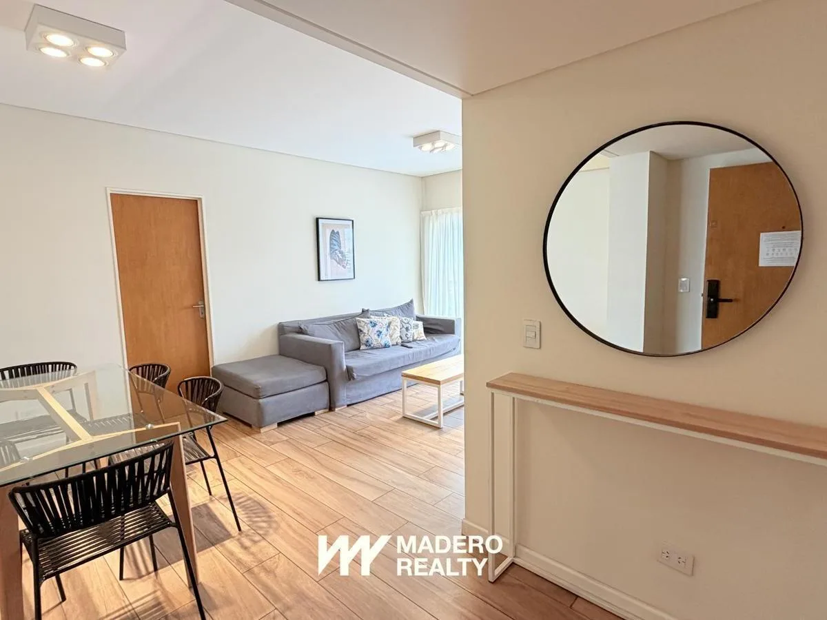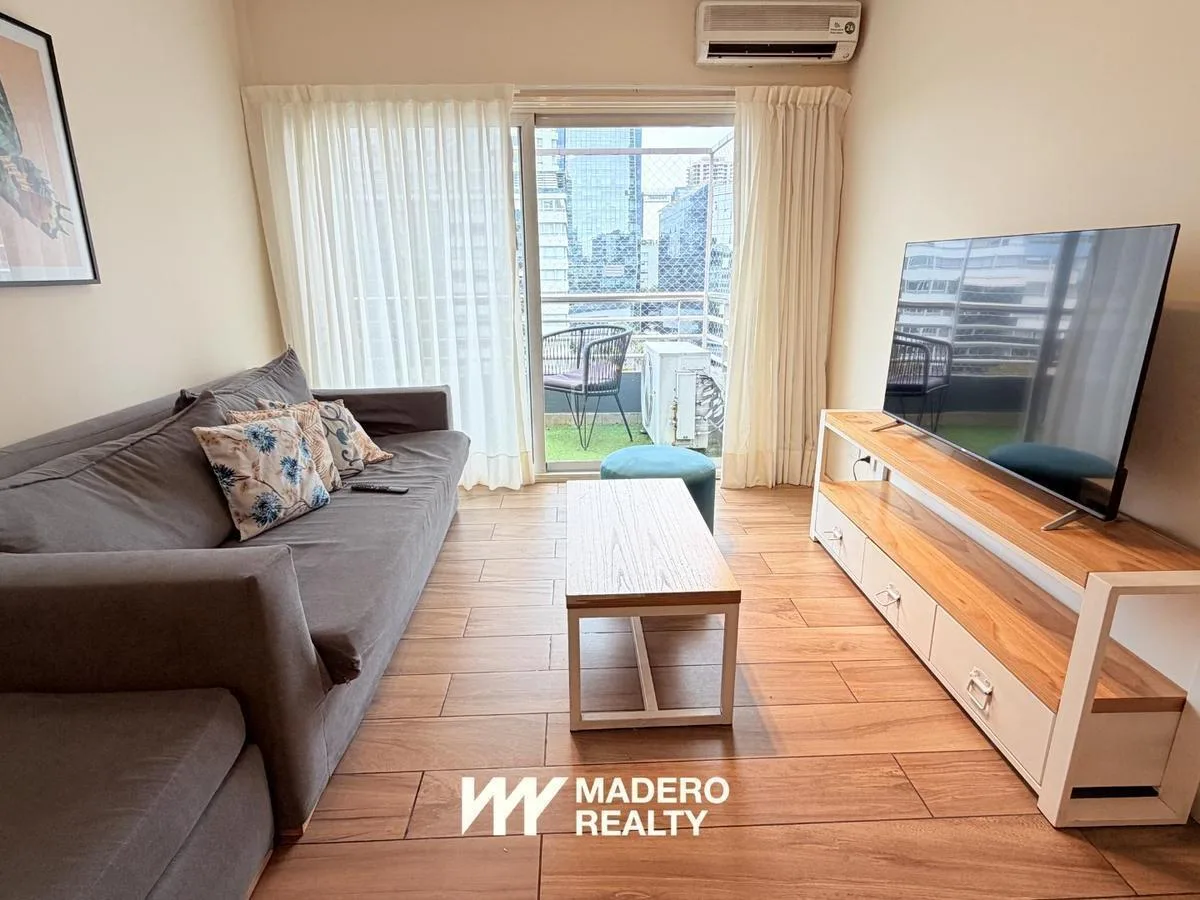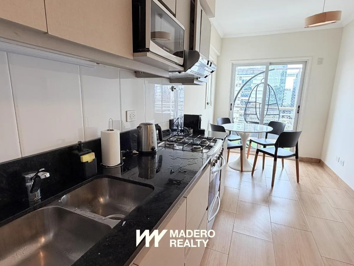 Four-room apartment in Puerto Madero with open views and street-facing balcony. It has 3 bedrooms, one en suite with a full bathroom and walk-in closet, a living-dining room, a separate kitchen with a daily dining area, a full bathroom and a toilette, and 1 assigned parking space. The complex Terrazas del Puerto consists of 6 residential towers on Juana Manso, sharing a landscaped central park with pathways, water features and common areas, plus 2 pools, a fully equipped gym, a spa with a sauna,
