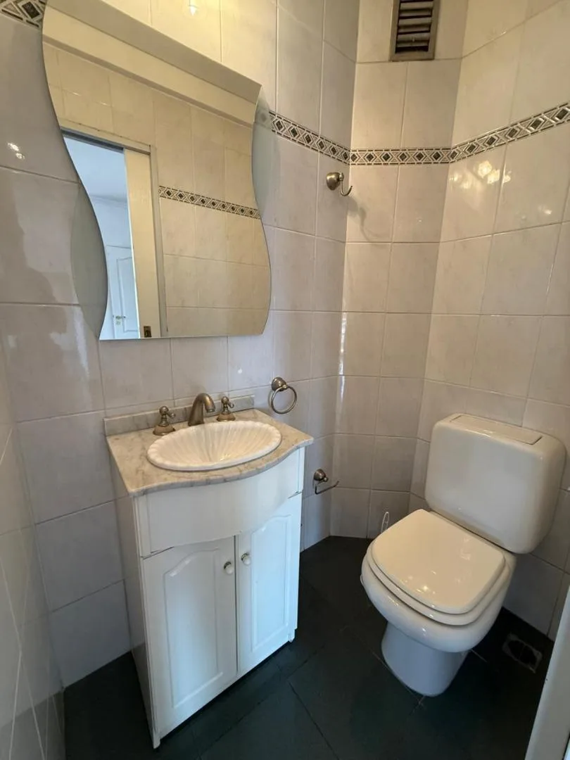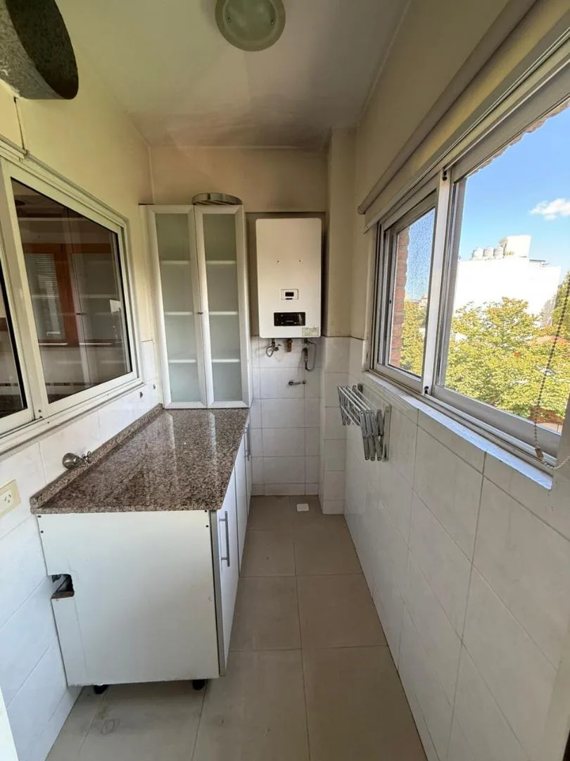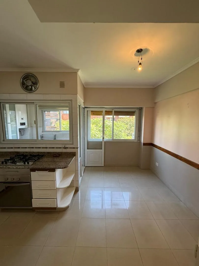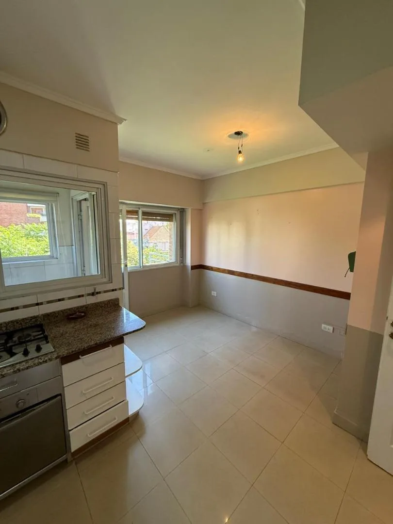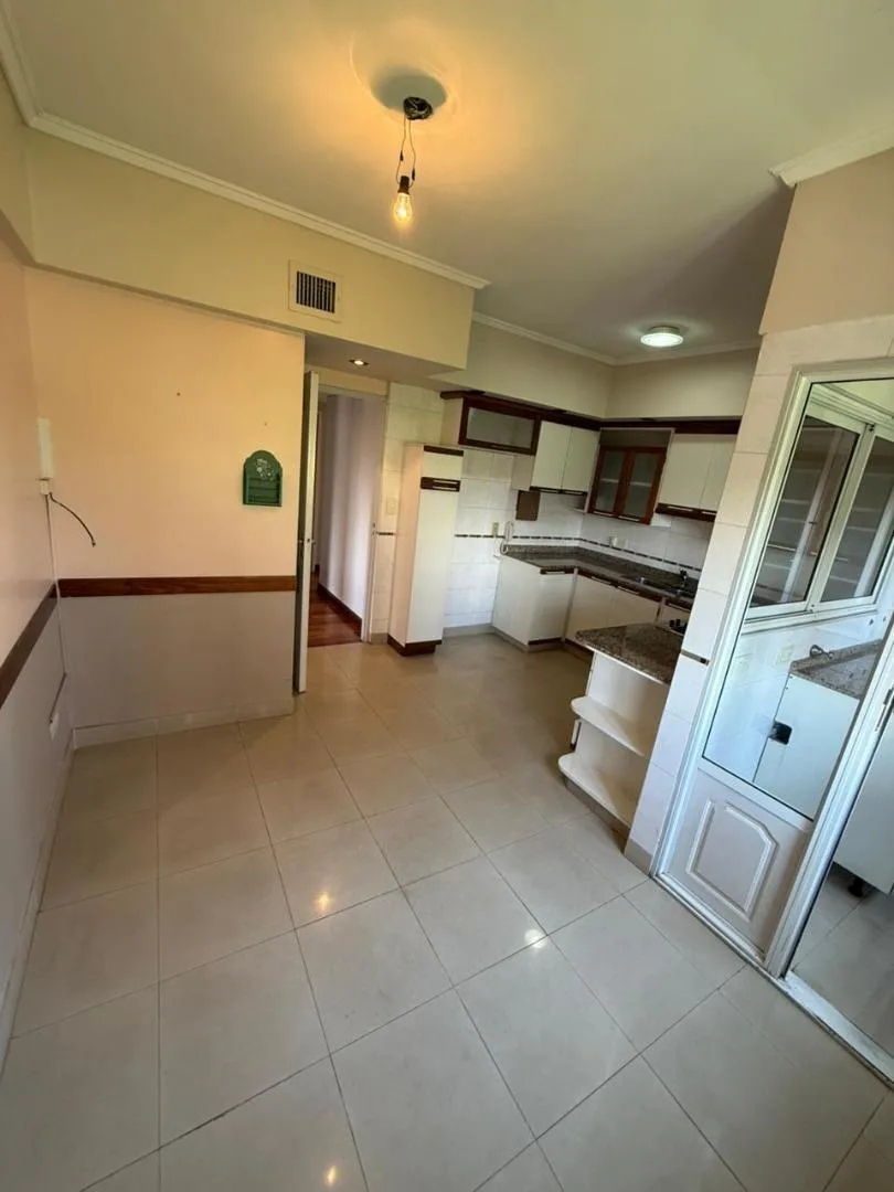 Four-room apartment of 3 bedrooms in Victoria, on Santamarina at 1100, 2nd floor, semipiso. Living-dining room with balcony facing Santamarina, reception toilet, separate eat-in kitchen with countertop, under-counter cabinets and wall units, plus a built-in laundry area. Two bedrooms with closets and access to a second balcony, full bathroom with bathtub, and a primary bedroom with closets and an en-suite full bathroom. The building has a pool and a communal room (SUM) with a grill.