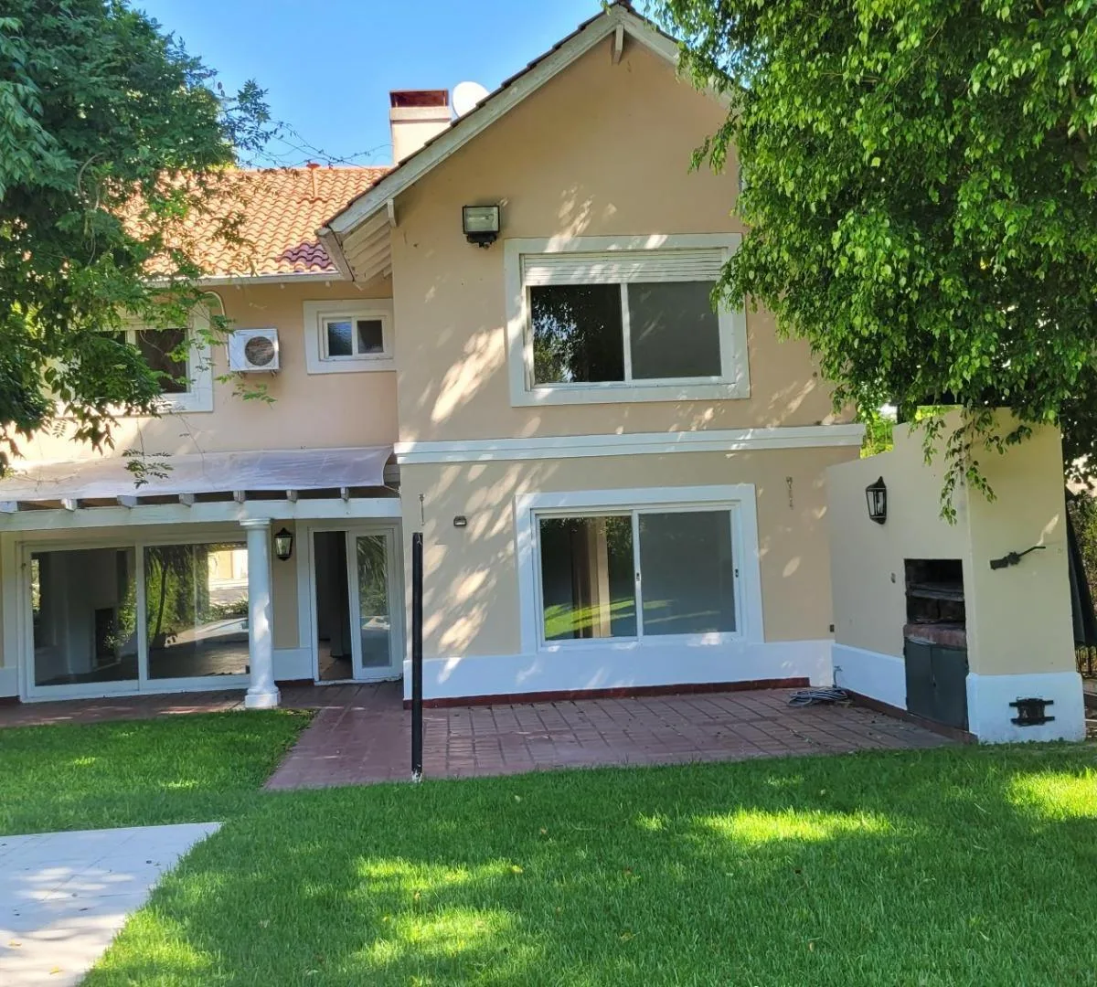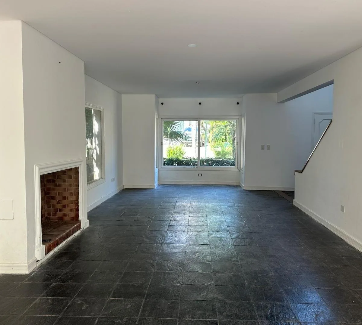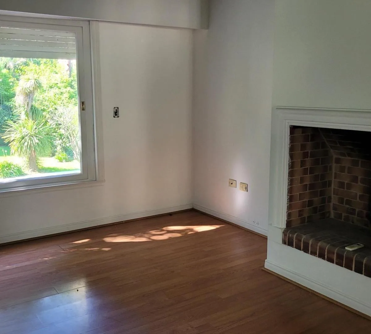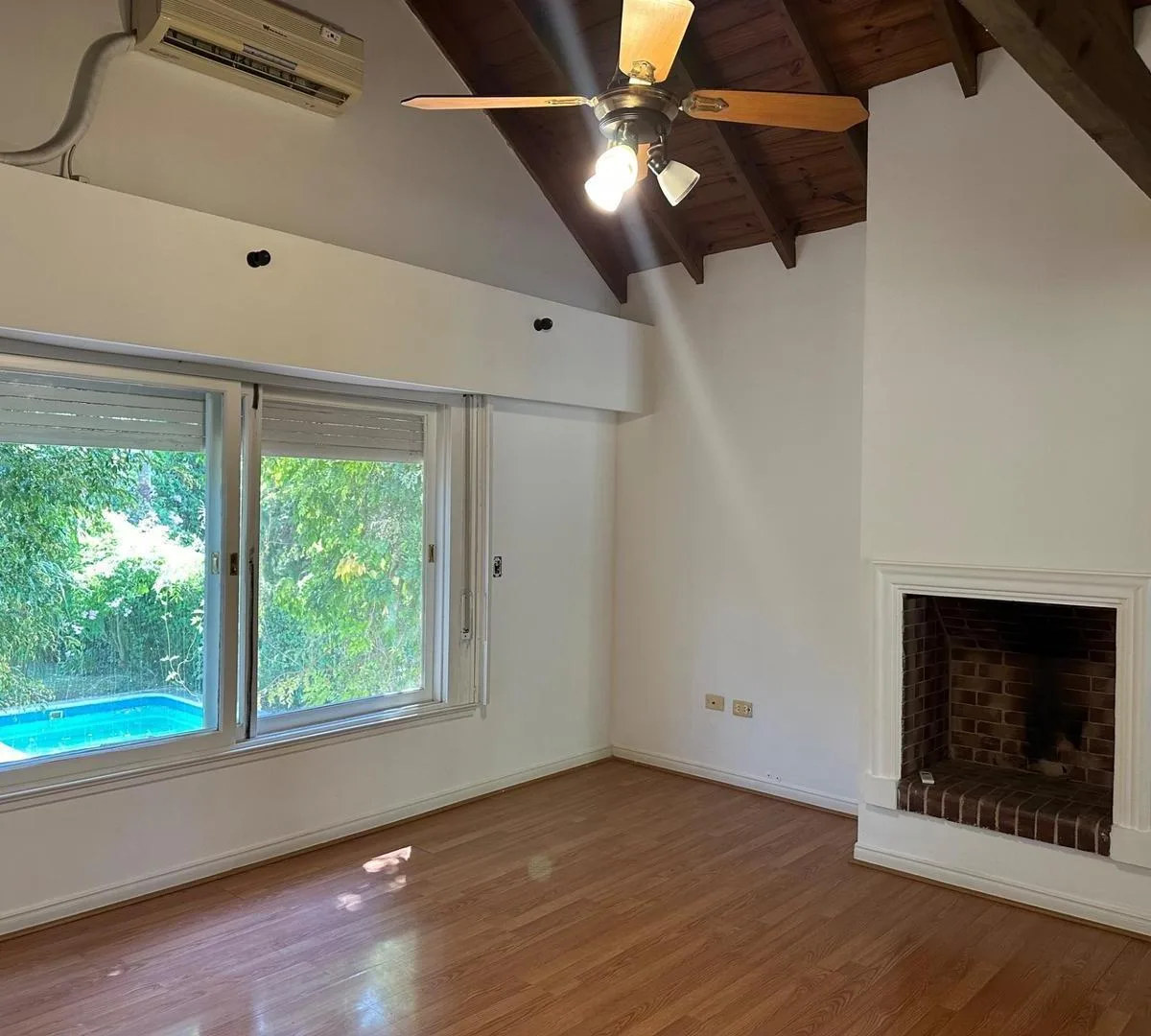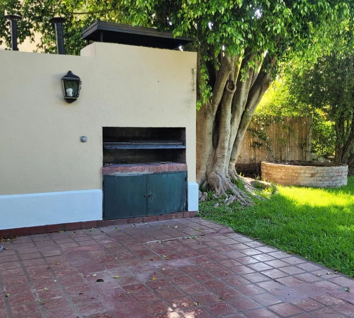 House for rent with 4 rooms in El Boating Club, San Isidro. 3 bedrooms and service quarter, with 2-year contract; unfurnished. Ground floor has an entry hall, powder room, L-shaped living room with double windows and a wood-burning fireplace, dining room overlooking the garden, family room, equipped kitchen, separate laundry with access to the patio, and a service bedroom with a full bathroom and side entrance. Exterior includes a covered gallery with awning, BBQ grill and built-in asador, and a