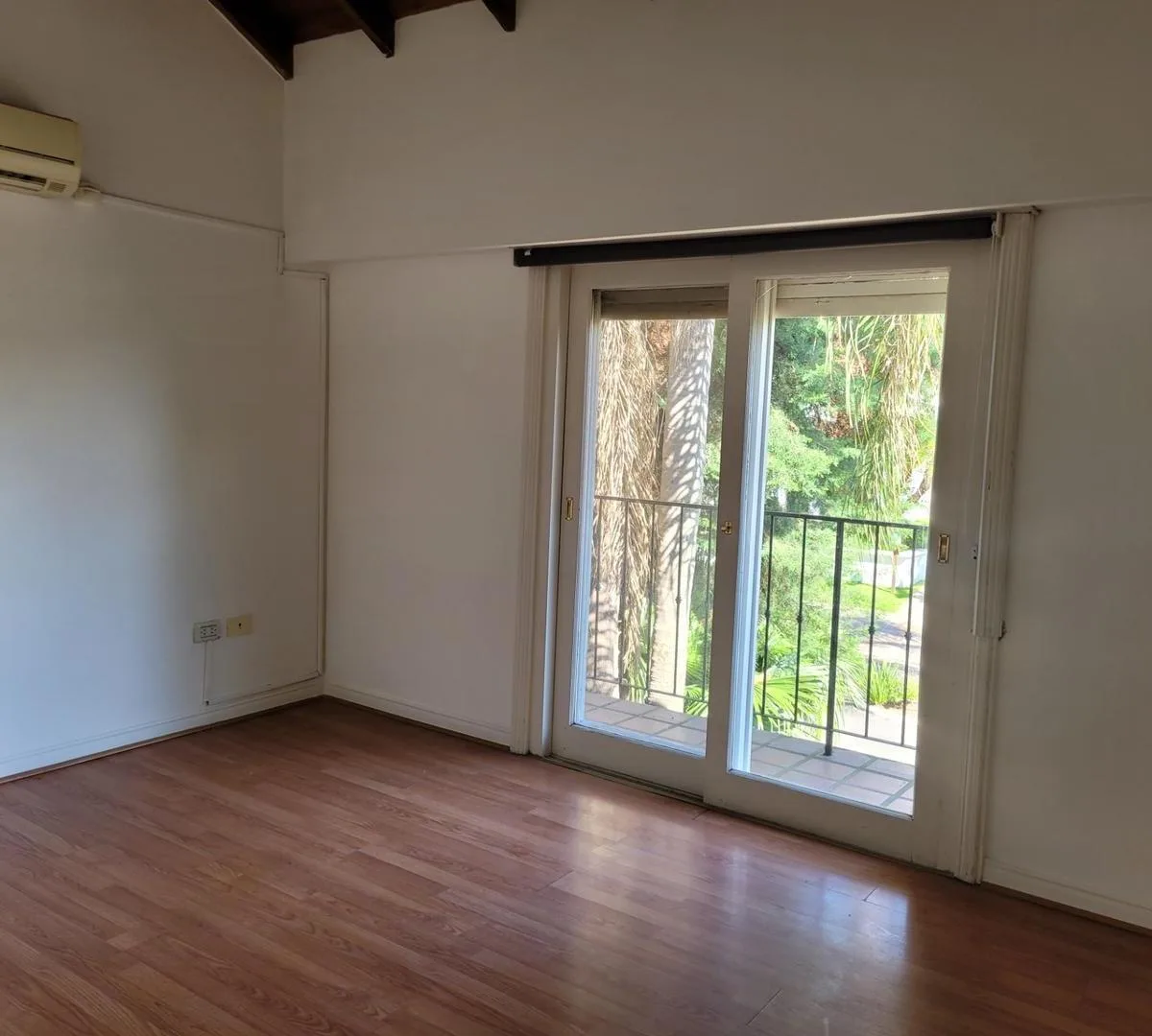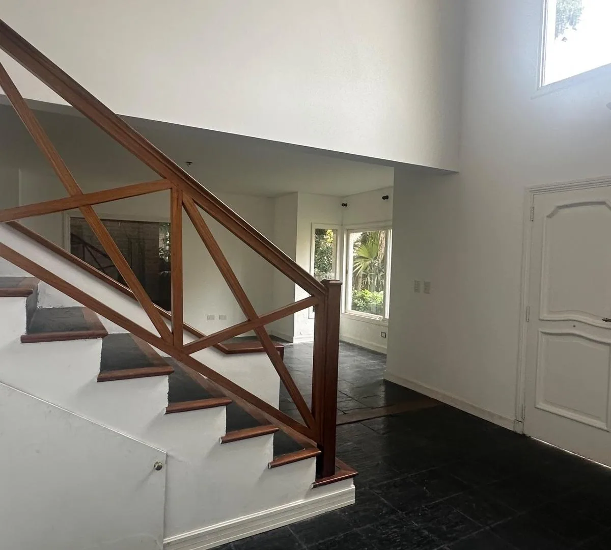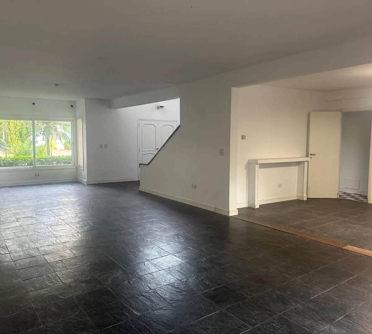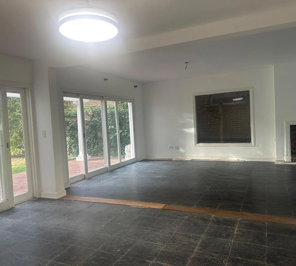 House for rent with 4 rooms in El Boating Club, San Isidro. 3 bedrooms and service quarter, with 2-year contract; unfurnished. Ground floor has an entry hall, powder room, L-shaped living room with double windows and a wood-burning fireplace, dining room overlooking the garden, family room, equipped kitchen, separate laundry with access to the patio, and a service bedroom with a full bathroom and side entrance. Exterior includes a covered gallery with awning, BBQ grill and built-in asador, and a