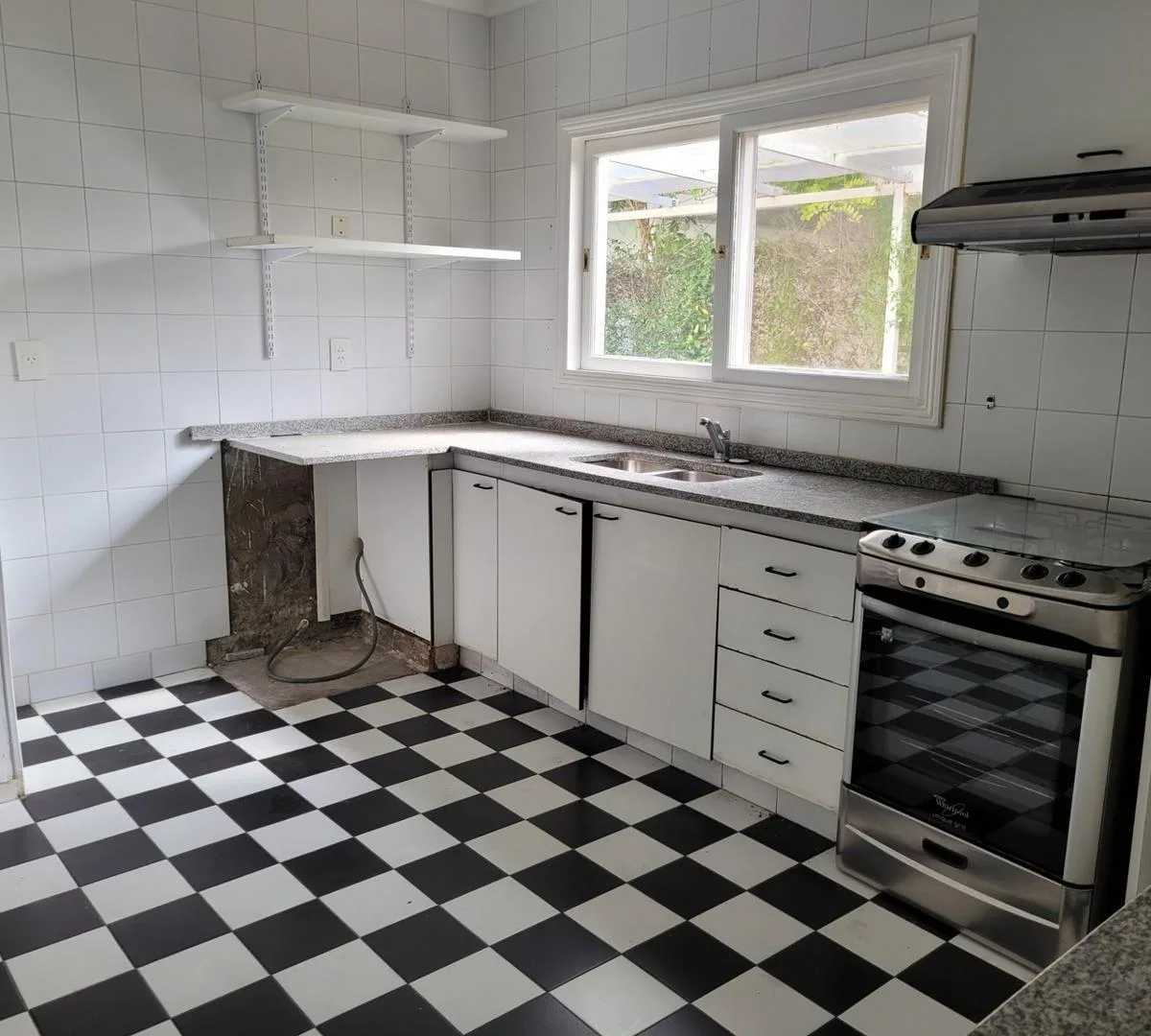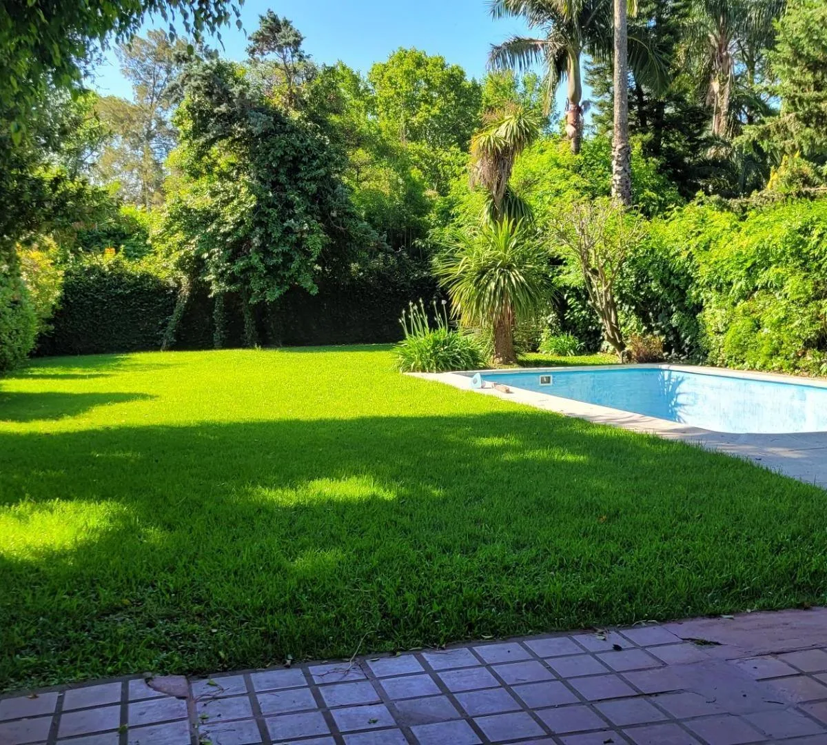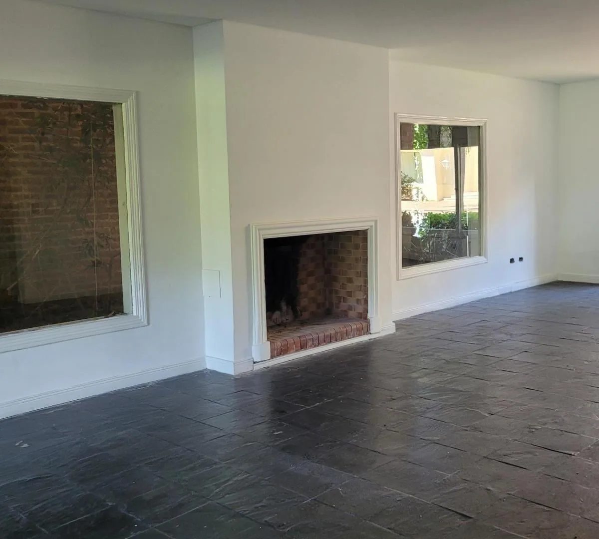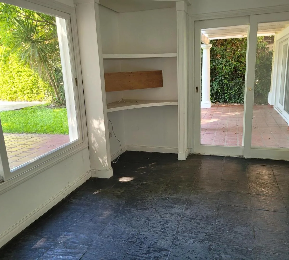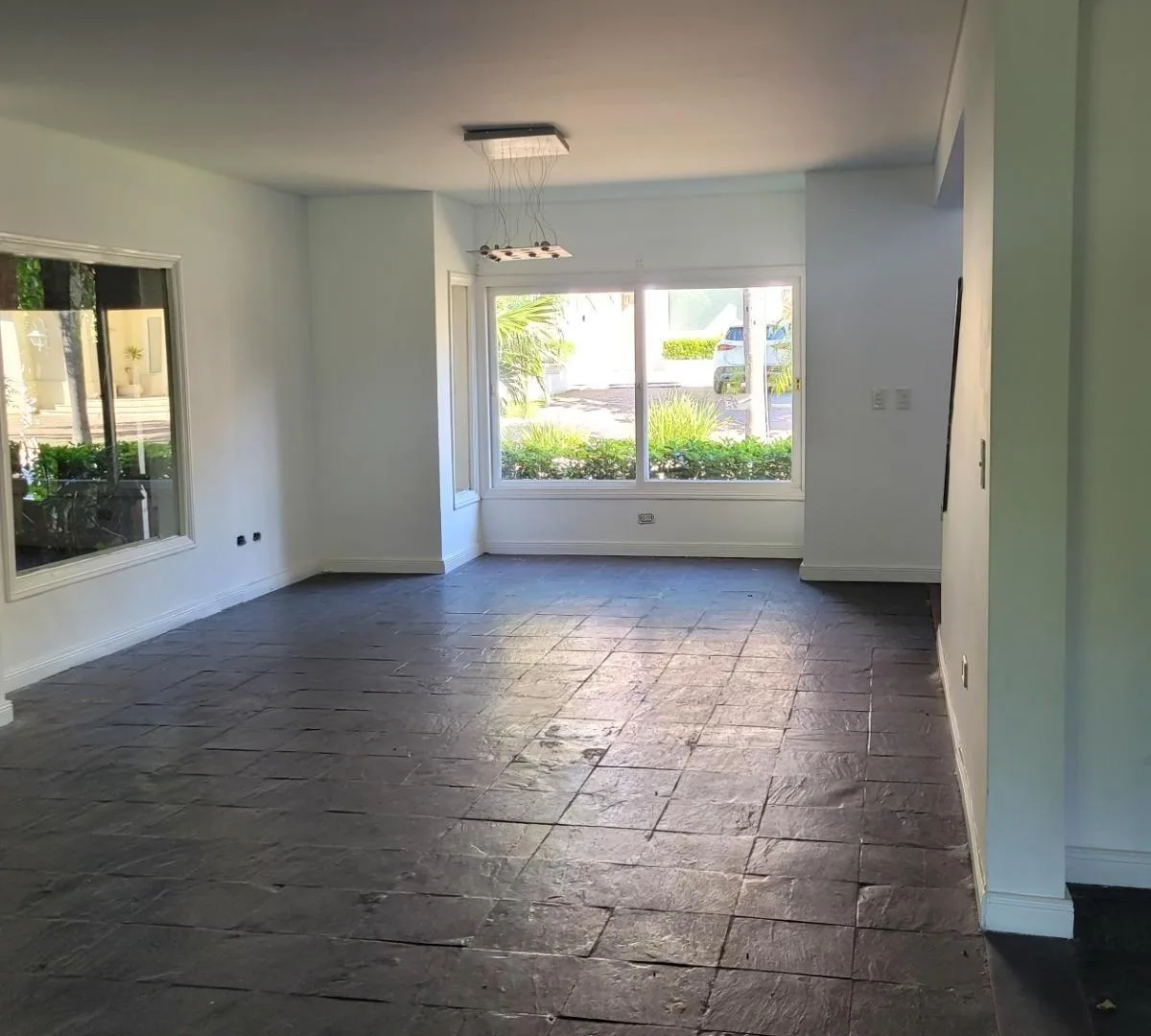 House for rent with 4 rooms in El Boating Club, San Isidro. 3 bedrooms and service quarter, with 2-year contract; unfurnished. Ground floor has an entry hall, powder room, L-shaped living room with double windows and a wood-burning fireplace, dining room overlooking the garden, family room, equipped kitchen, separate laundry with access to the patio, and a service bedroom with a full bathroom and side entrance. Exterior includes a covered gallery with awning, BBQ grill and built-in asador, and a