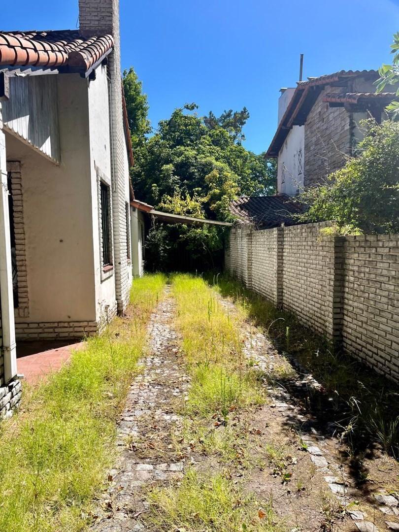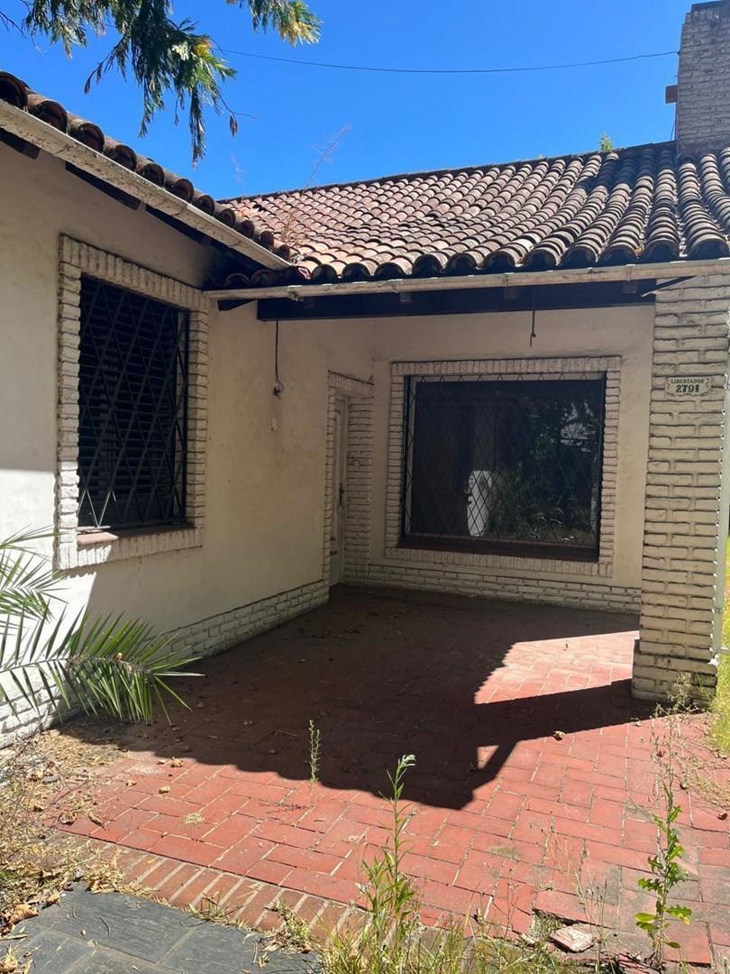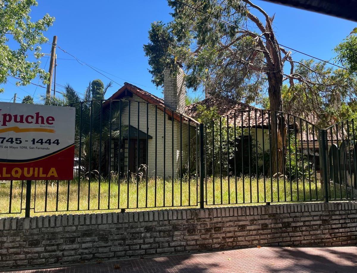 Corner house for rent in San Fernando, Victoria. Built about 70 years ago and to be refurbished, it sits on a 952 m² plot with 361 m² covered area, all on one level. The layout includes a porch, entrance hall, an office, two bedrooms (one en suite with a dressing room and full bathroom), a third bedroom, additional bathroom, a living room with fireplace opening to the dining room, a family room, integrated kitchen with daily dining, a toilet, and a staff unit. Outside there is a quincho with bat