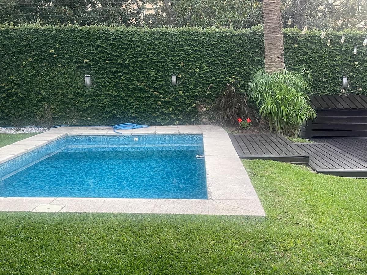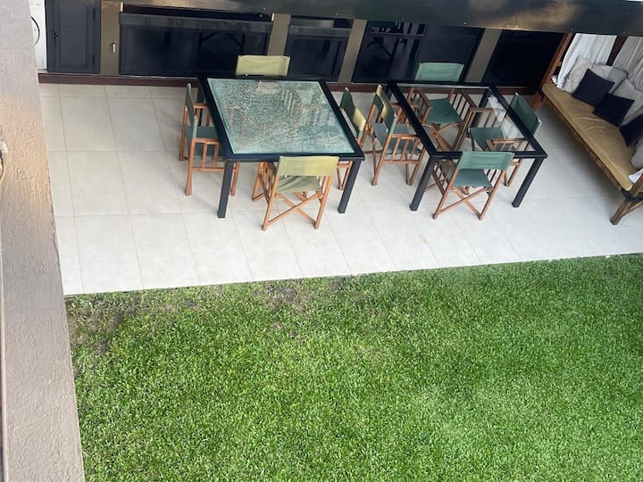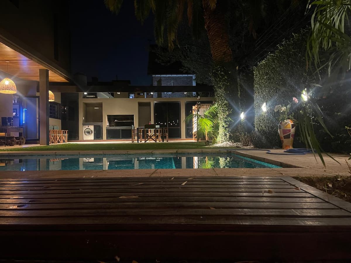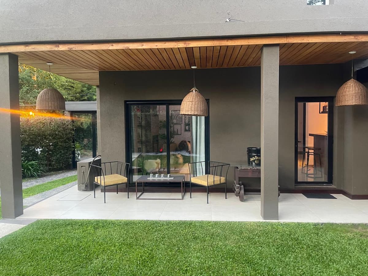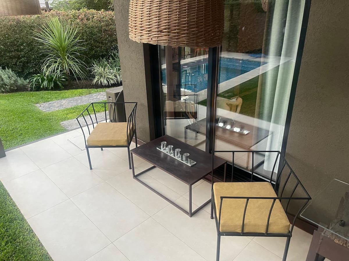 Three-bedroom apartment with 180 m² in Punta Chica. The property has a private garden with a pool, covered BBQ area and outdoor lounging, plus a walk-in setup. Each room includes Smart TV, split air conditioning and a desk area, and the main suite includes a Jacuzzi. Up to 6 people can be accommodated.