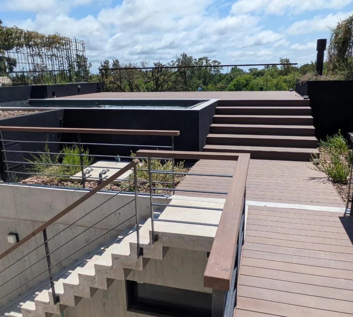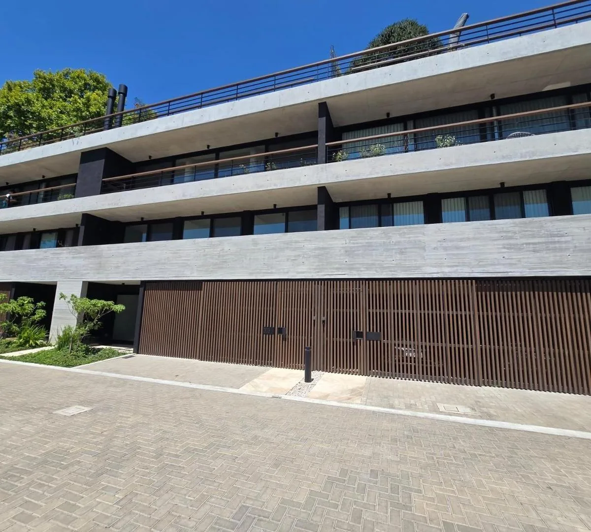 Four-room apartment in Punta Chica, arranged as a penthouse/tríplex across multiple levels. The property is described as being set on a 6,000 m² bluff, with floor-to-ceiling windows and travertine marble floors. There are 3 bedrooms, including a main suite with a dressing room and a jacuzzi, plus a kitchen with an island and a separate family room or office. The upper level has a 100 m² terrace with a private garden, deck and a private pool, and the levels are connected by a private lift and an