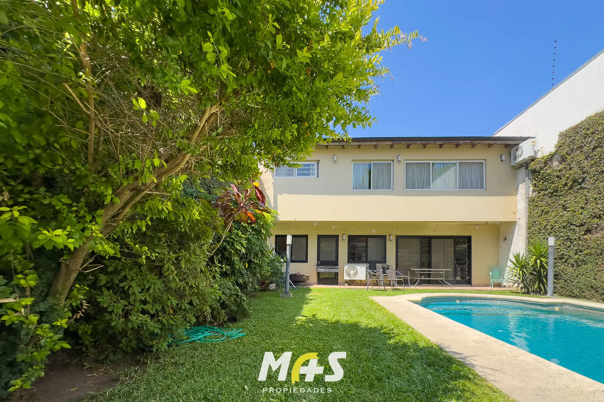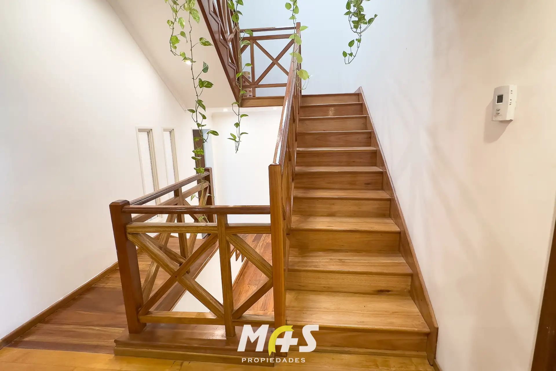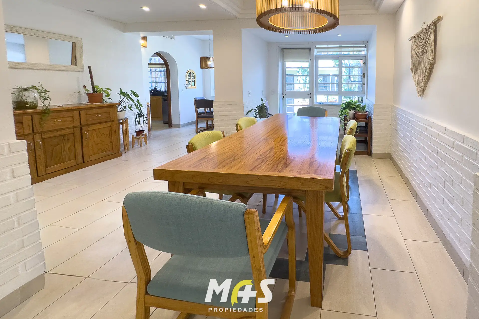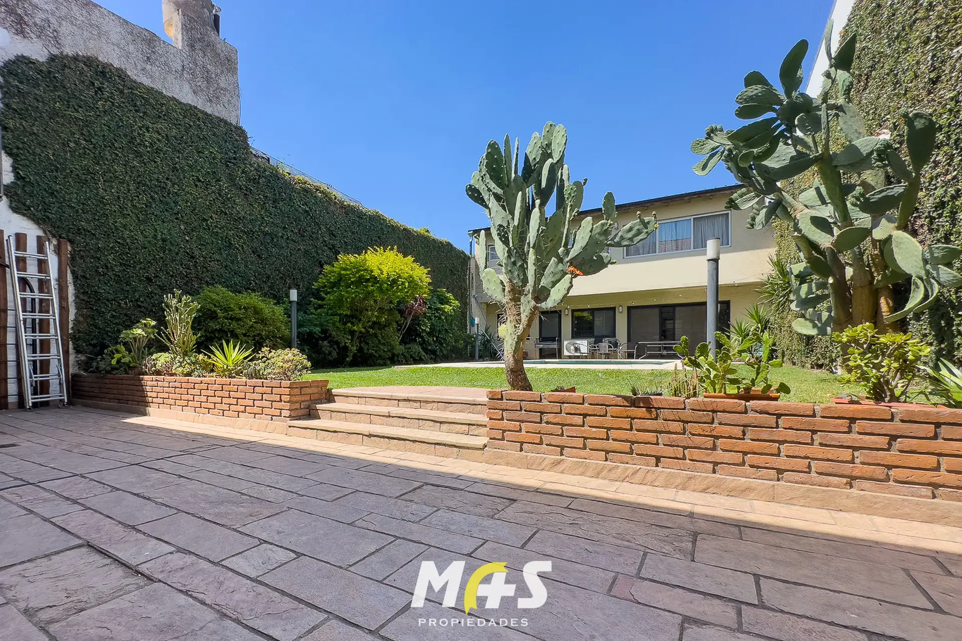 House on a 10 x 37.50 m lot with all rooms set around outdoor space. Ground floor includes a front garden, living-dining room, separate dining room, independent kitchen with views to the garden, toilet, and adjacent laundry area, with kitchen and laundry furnishings in solid wood. Upstairs and mezzanine provide two front bedrooms, a courtyard-facing bedroom, a primary suite with dressing room, a full bathroom, and an additional mezzanine bedroom. The rear features a landscaped garden with an int