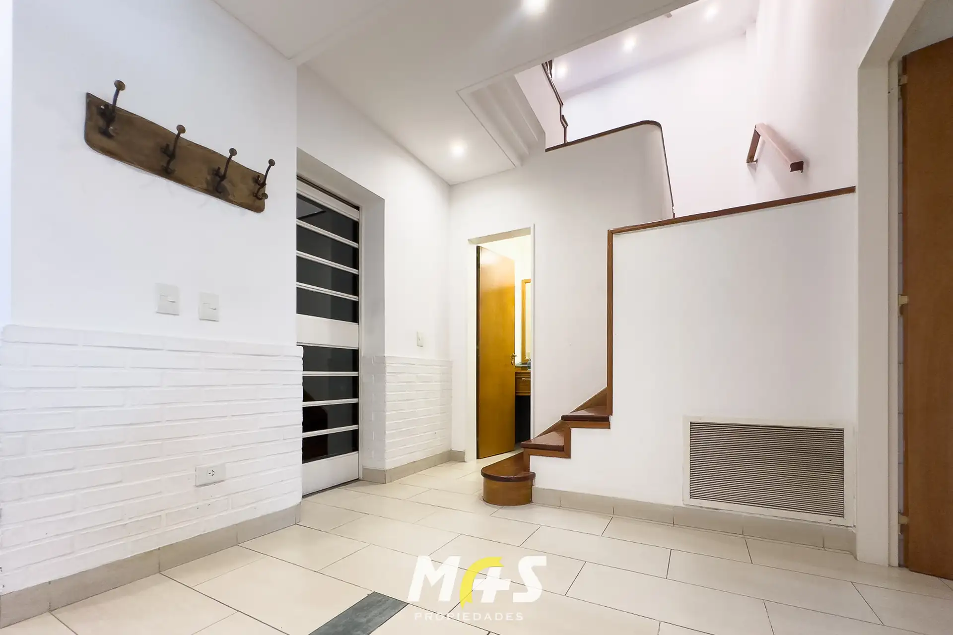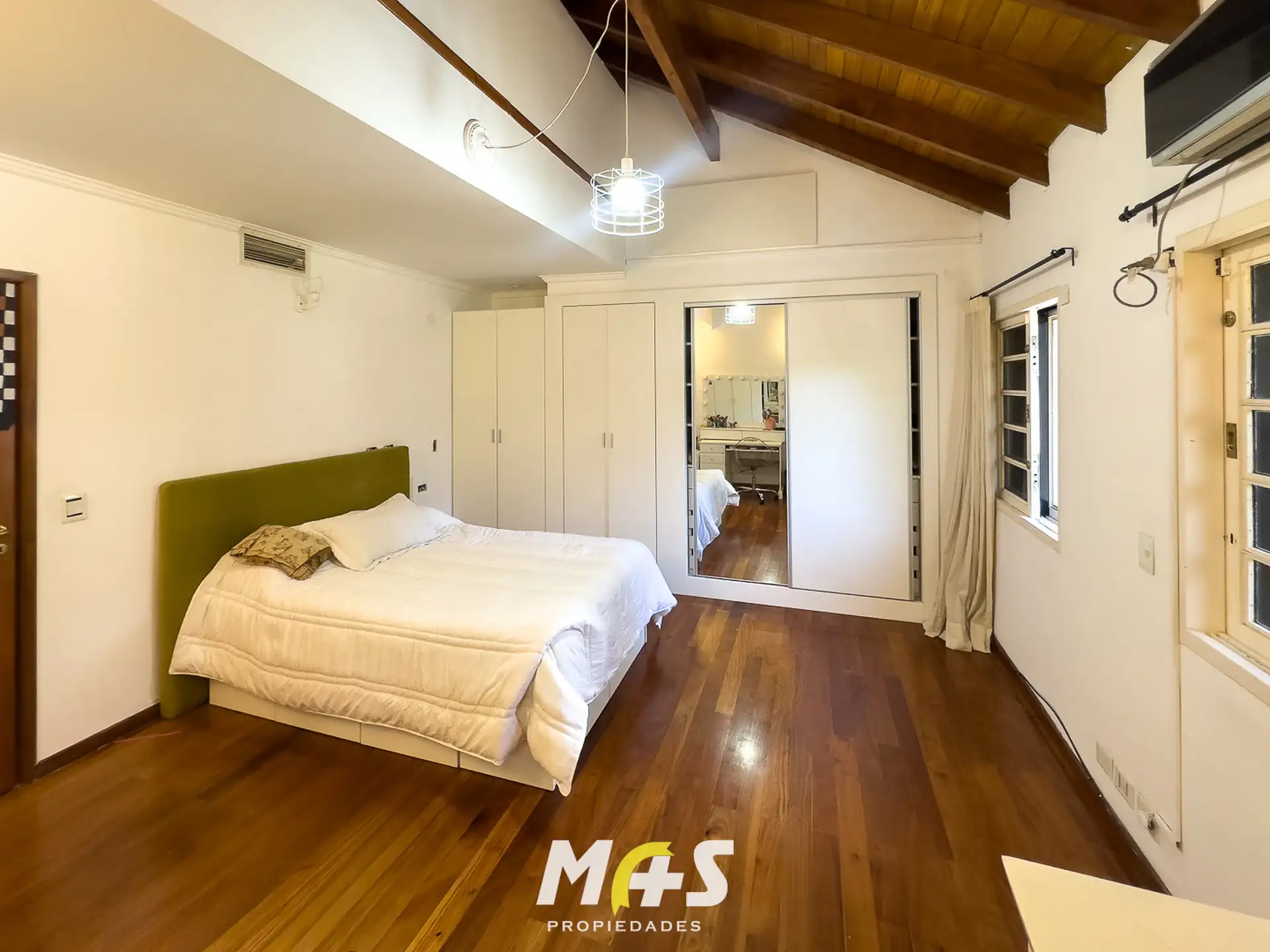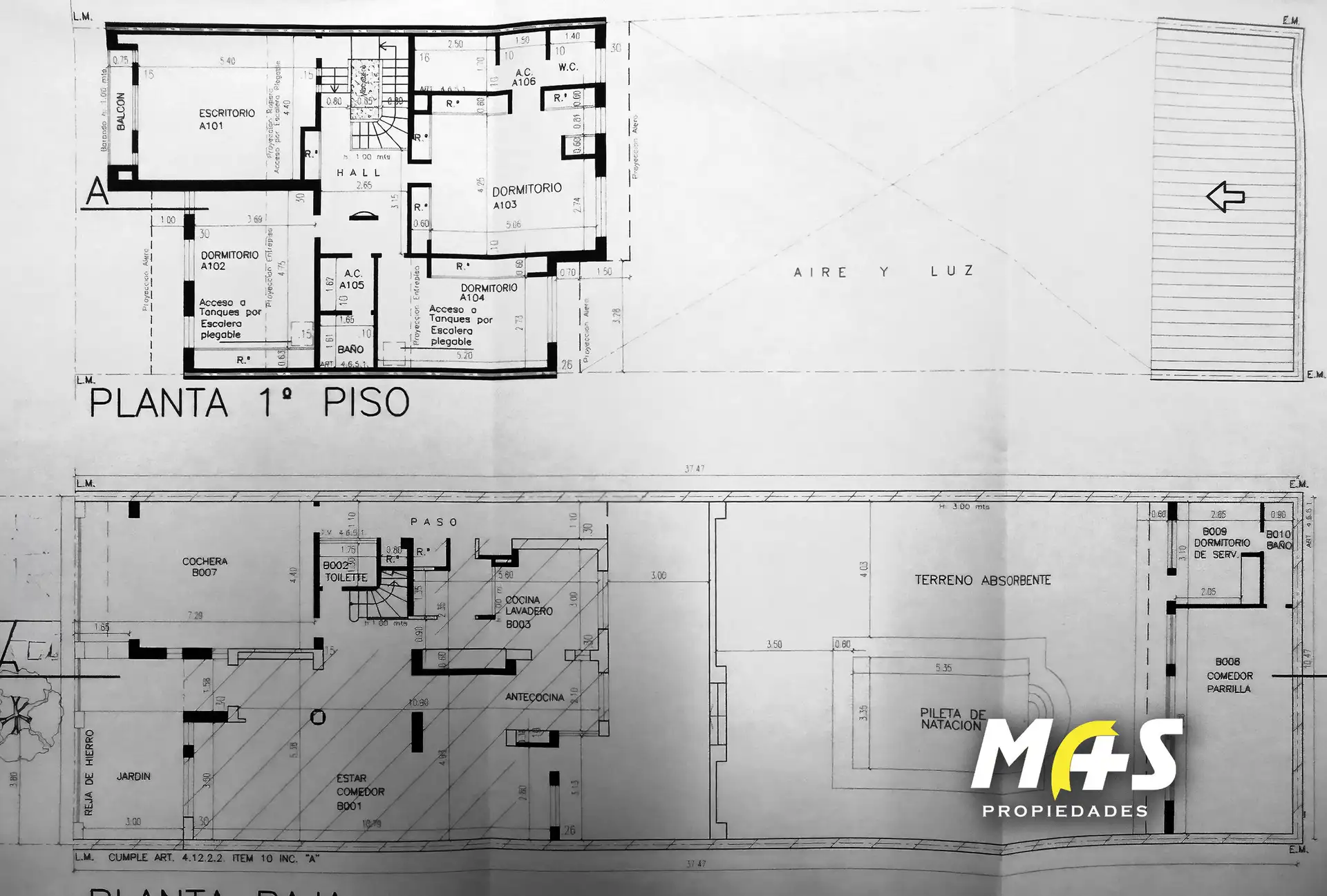 House on a 10 x 37.50 m lot with all rooms set around outdoor space. Ground floor includes a front garden, living-dining room, separate dining room, independent kitchen with views to the garden, toilet, and adjacent laundry area, with kitchen and laundry furnishings in solid wood. Upstairs and mezzanine provide two front bedrooms, a courtyard-facing bedroom, a primary suite with dressing room, a full bathroom, and an additional mezzanine bedroom. The rear features a landscaped garden with an int