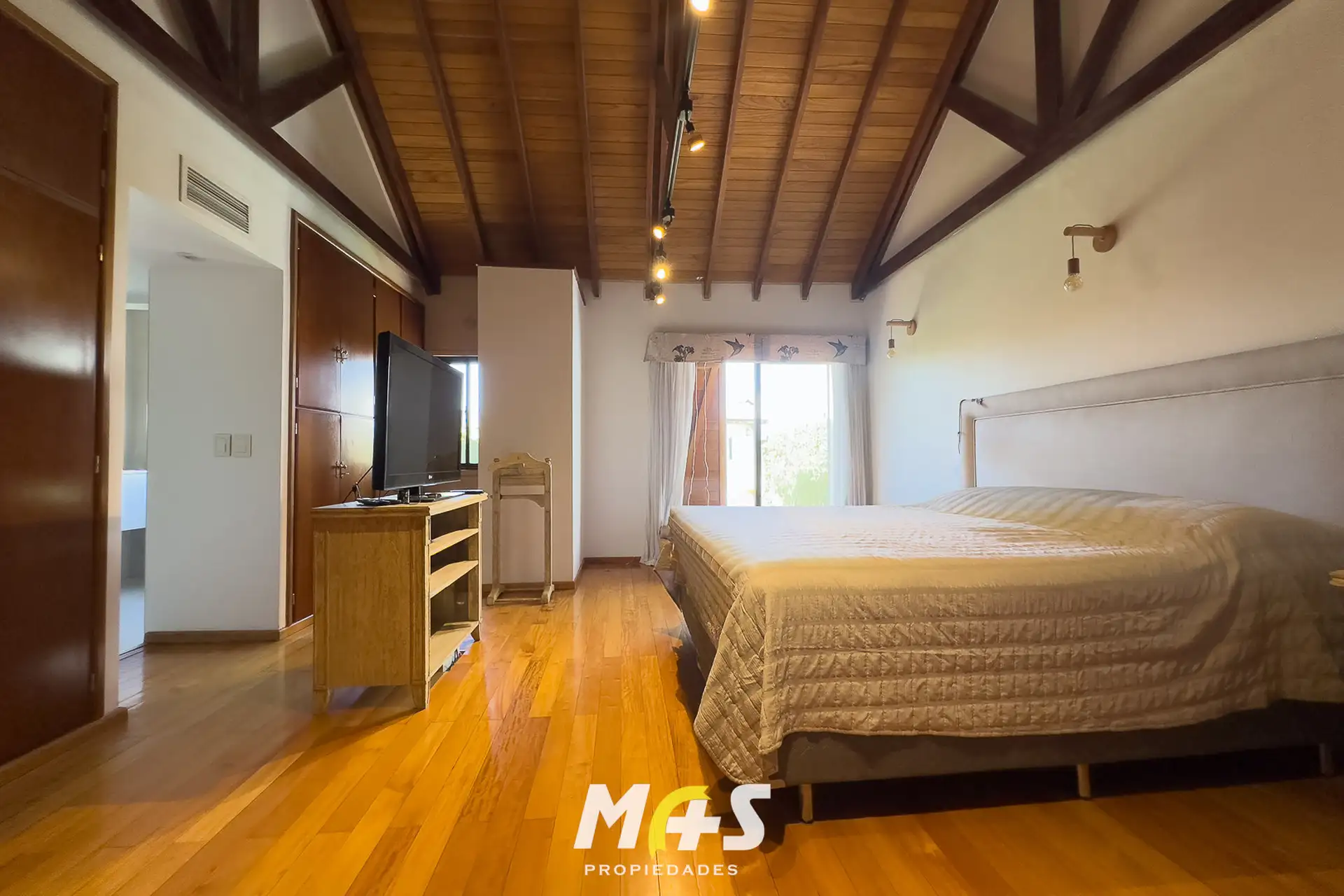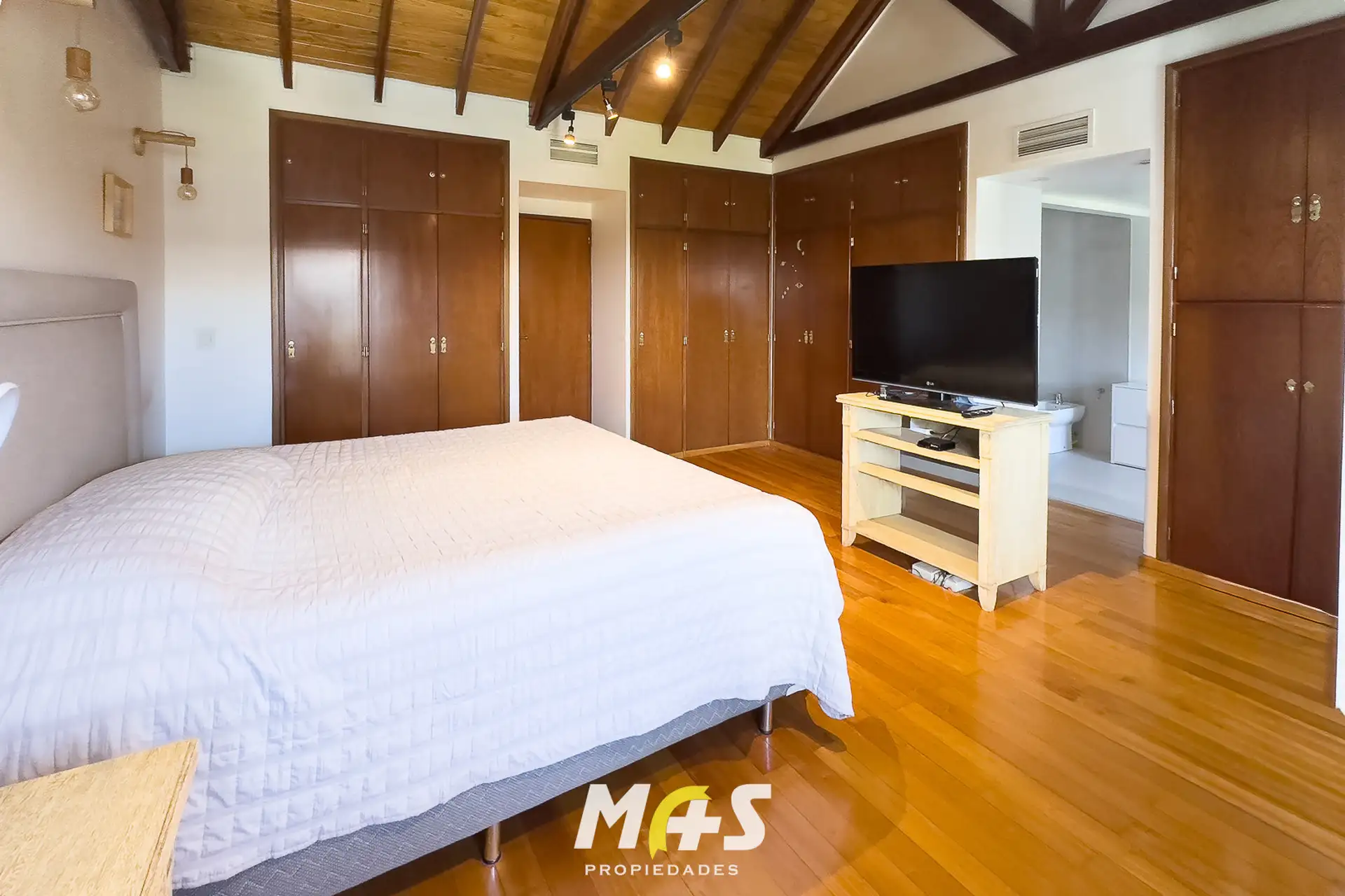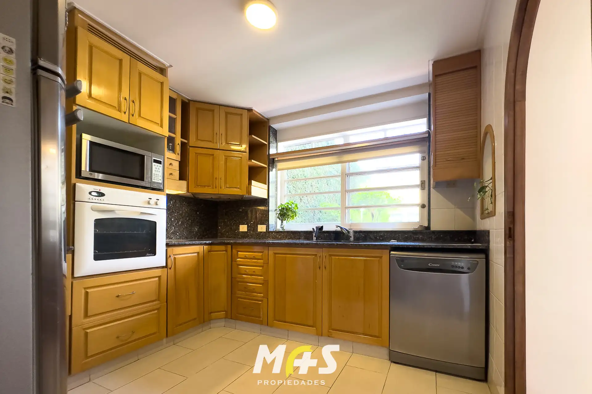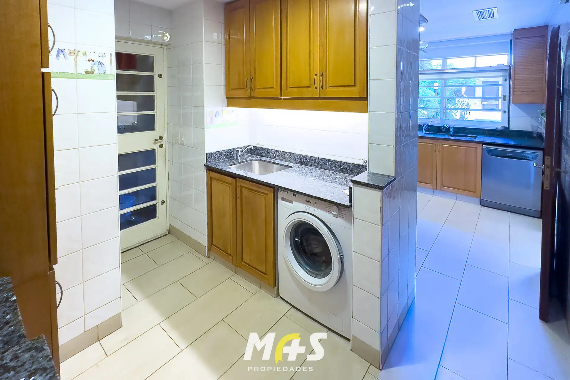 House on a 10 x 37.50 m lot with all rooms set around outdoor space. Ground floor includes a front garden, living-dining room, separate dining room, independent kitchen with views to the garden, toilet, and adjacent laundry area, with kitchen and laundry furnishings in solid wood. Upstairs and mezzanine provide two front bedrooms, a courtyard-facing bedroom, a primary suite with dressing room, a full bathroom, and an additional mezzanine bedroom. The rear features a landscaped garden with an int