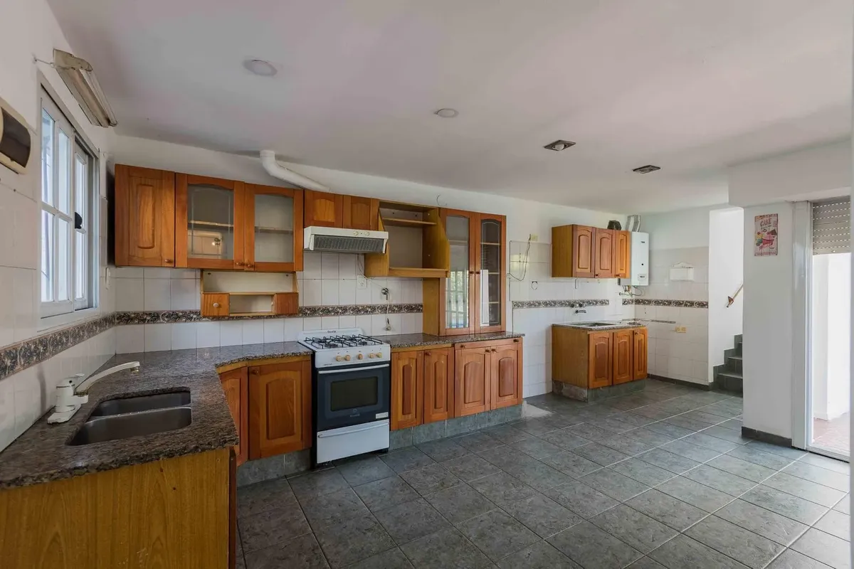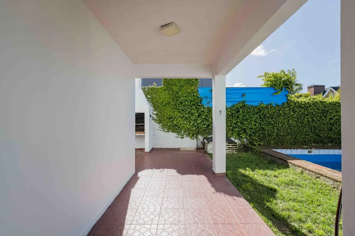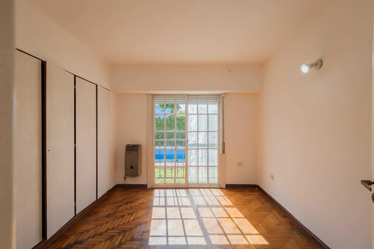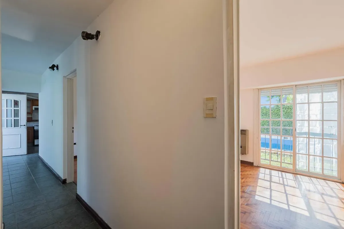Ground-floor and first-floor house in Beccar with 4 bedrooms, a private garden with pool and covered gallery. On the ground floor there is an entry hall, living and dining areas, a guest toilet, 2 bedrooms sharing 1 full bathroom, and a separate kitchen with daily dining space and direct access to the garden. Upstairs there is a master bedroom en suite with a balcony, plus a study or 4th bedroom; the property has heating via balanced flue stoves and a split air-conditioning unit (cooling) in the