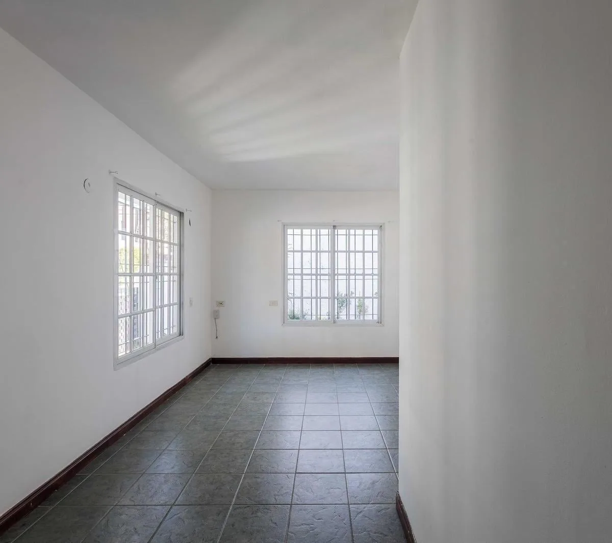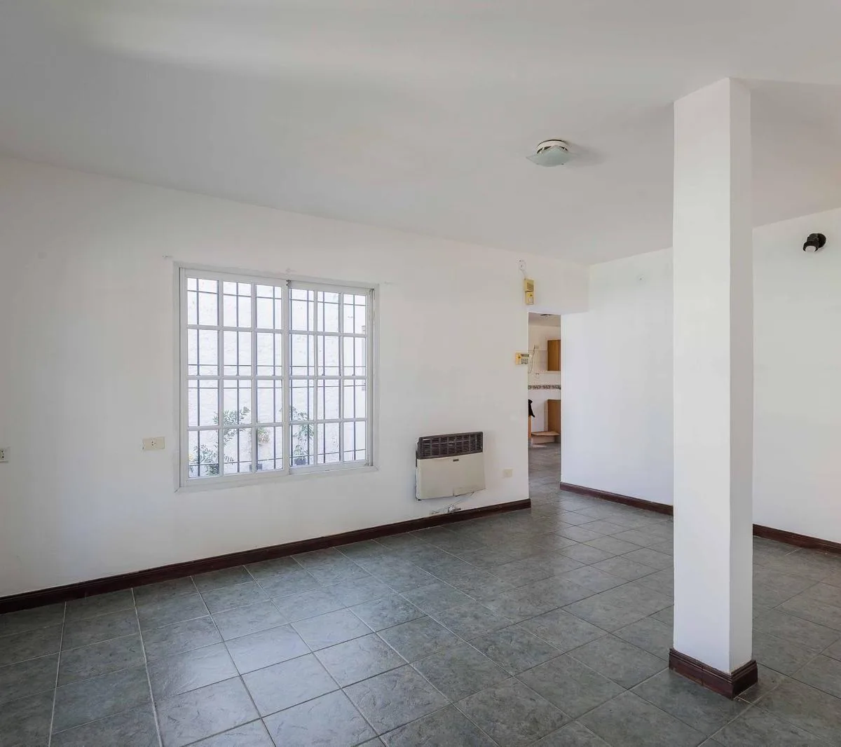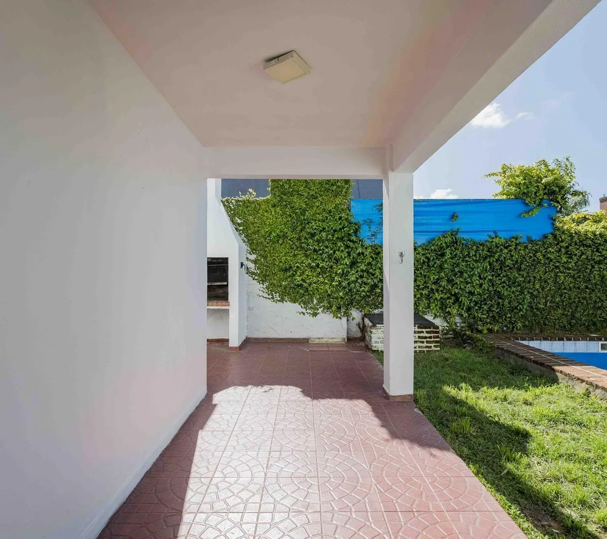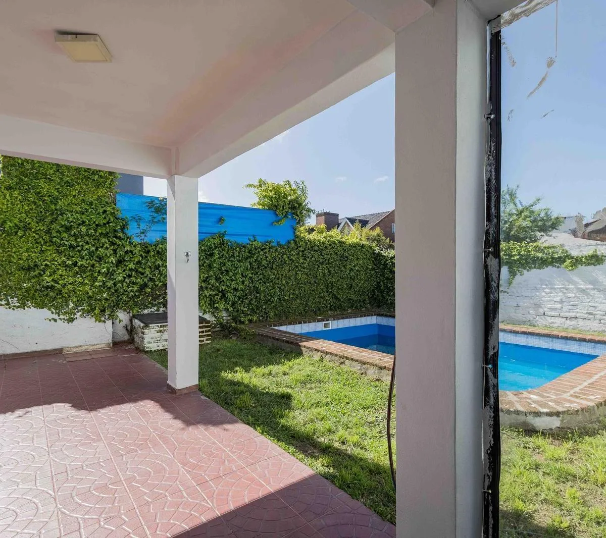 Ground-floor house with a hall, a living and dining area, a guest toilet, and 2 bedrooms that share 1 full bathroom. The kitchen has an independent entrance, a daily dining space, and direct access to the garden. The upper floor has a main en-suite bedroom with access to a balcony, plus an office or 4th bedroom. The property includes a garden with a pool, grill, covered gallery, a storage area (baulera), and parking for 1 vehicle. Heating is provided by balanced flue stoves, with a cold-only spl