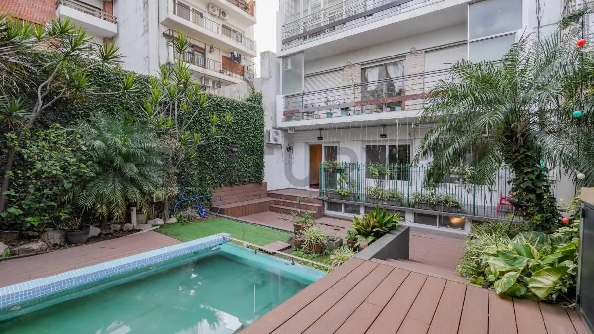 Ground-floor apartment in Caballito with a private patio, grill and pool. The unit includes a receiving hall, a large room with a full bathroom, a renovated fully fitted kitchen and a renovated modern toilet. Three additional bedrooms are in the basement area, with two rooms ventilated to the outside and electric blackout blinds; the main bedroom has a walk-in wardrobe, and all bedrooms share a full bathroom. The property has double-glazed windows (DVH) and a dual boiler, brand Peisa, and it is
