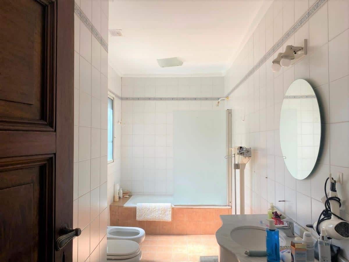 Ground-floor apartment with a reception hall, large living room, guest toilet, fully equipped kitchen, and an en-suite bedroom. The unit includes a laundry room, park area, heated pool, and an equipped gallery with a table, chairs and a grill. Upstairs there is a desk area, an en-suite bathroom with a private terrace, plus three additional bedrooms, one en-suite, and a separate full bathroom.