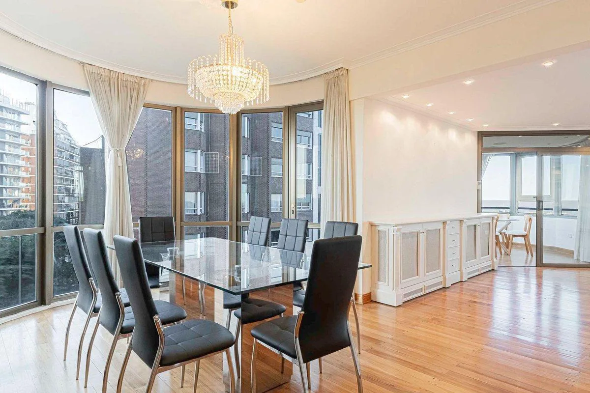 Apartment on the 7th floor in La Lucila (Vicente López), with river-facing balconies. It is furnished and includes a living-dining room, office, 4 bedrooms (2 en suite; the primary suite has a sauna, steam shower, and jacuzzi), a kitchen with new appliances, a daily dining area, service quarters, a laundry room, and a family room. There are 3 bathrooms plus a guest toilet, heating by radiators, air conditioning with splits in all rooms, a high-recovery water heater, central music system, double