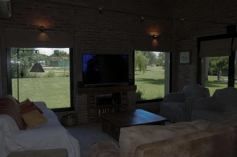 House for rent in the gated community San Facundo, 133 between 485 and 489 (Manuel B. Gonnet, La Plata, Buenos Aires). Built over two floors with an internal layout. The kitchen is in a U-shape with upper and lower cabinets, semi-open to the living-dining area via a breakfast bar, plus a guest toilet. There are four bedrooms, one en suite with a dressing room, and three additional full bathrooms. The property has a covered patio with a grill (parrilla), heated pool, and a hot tub. Radiant floor