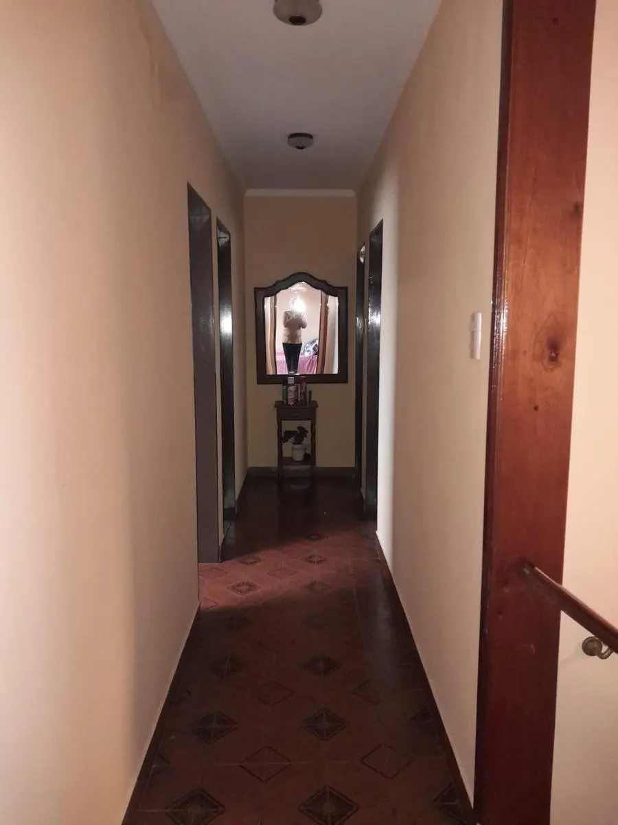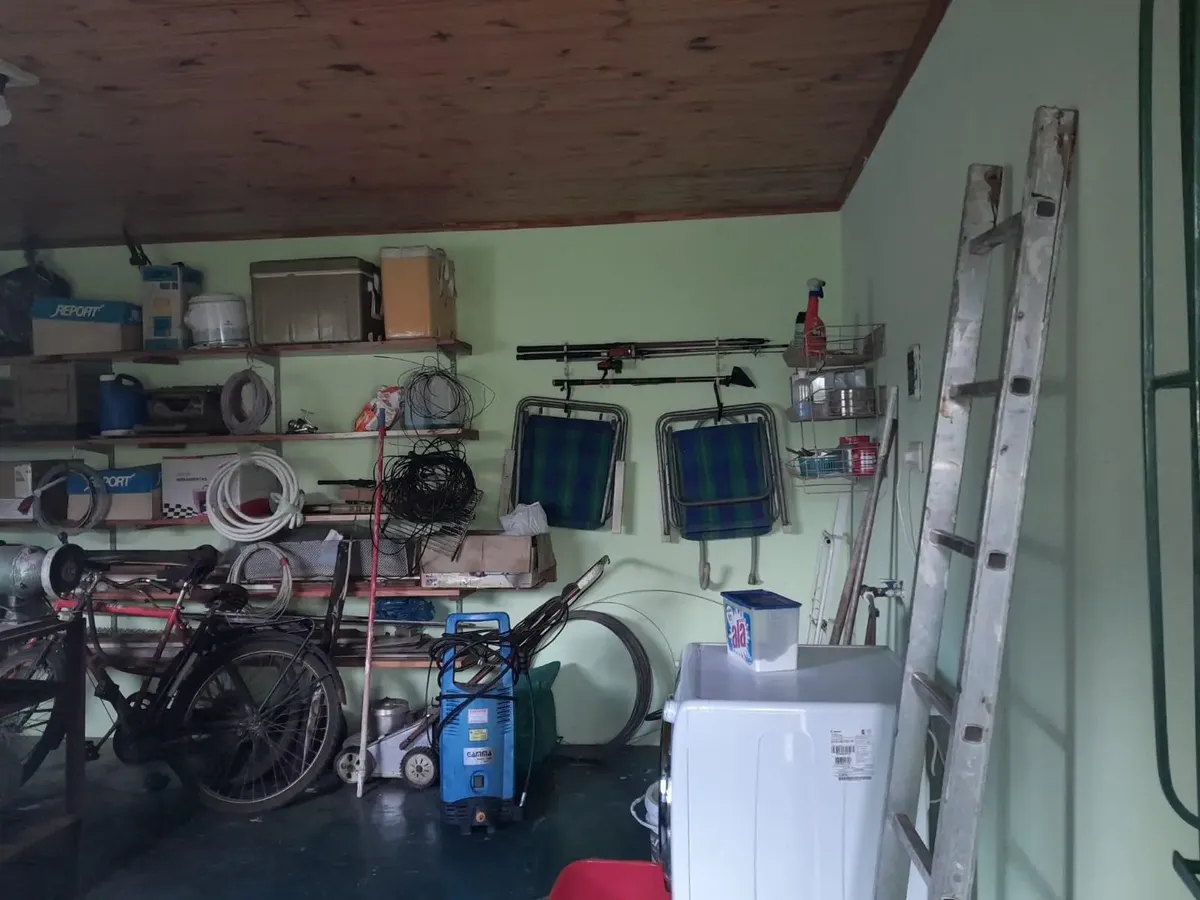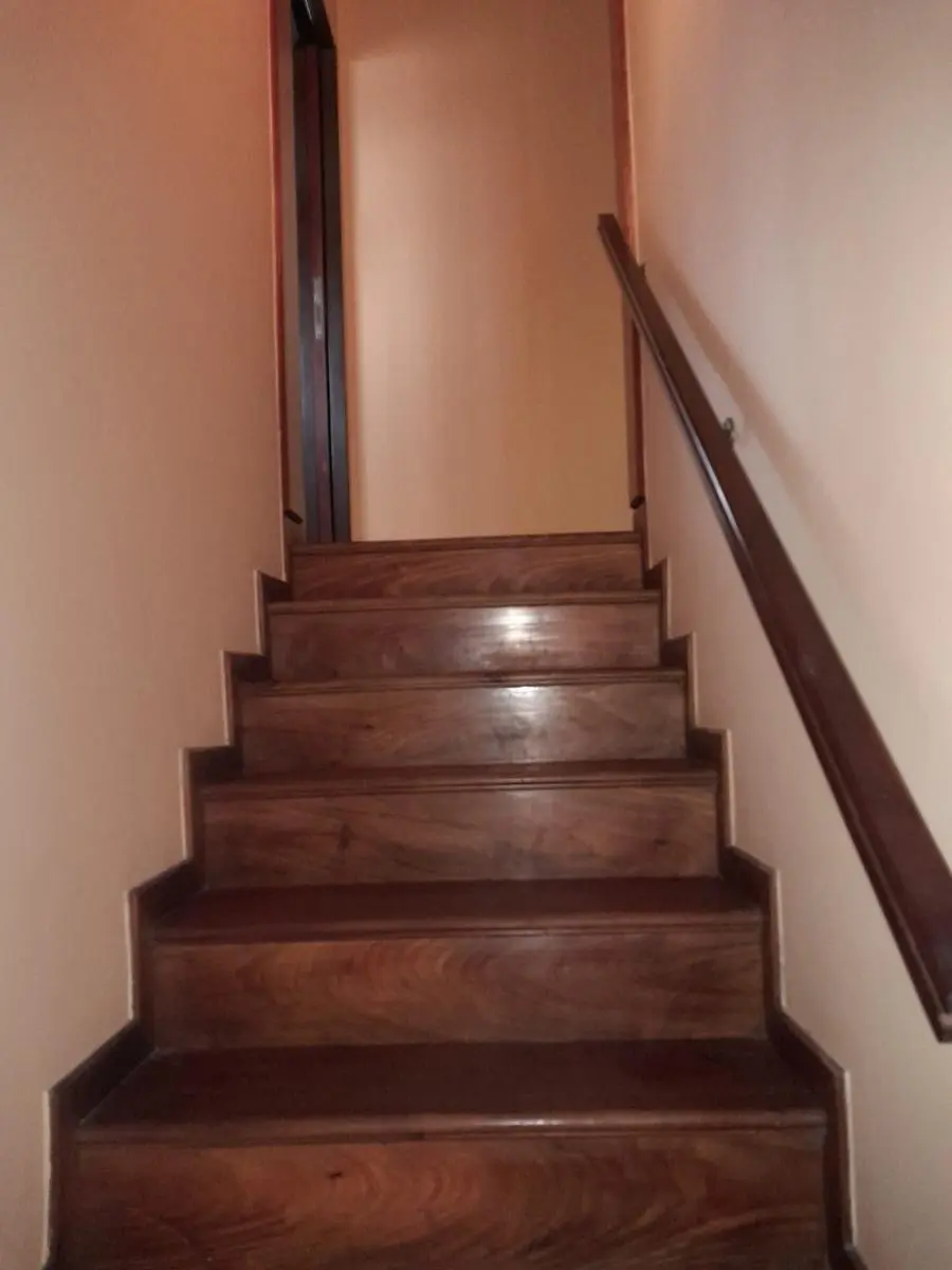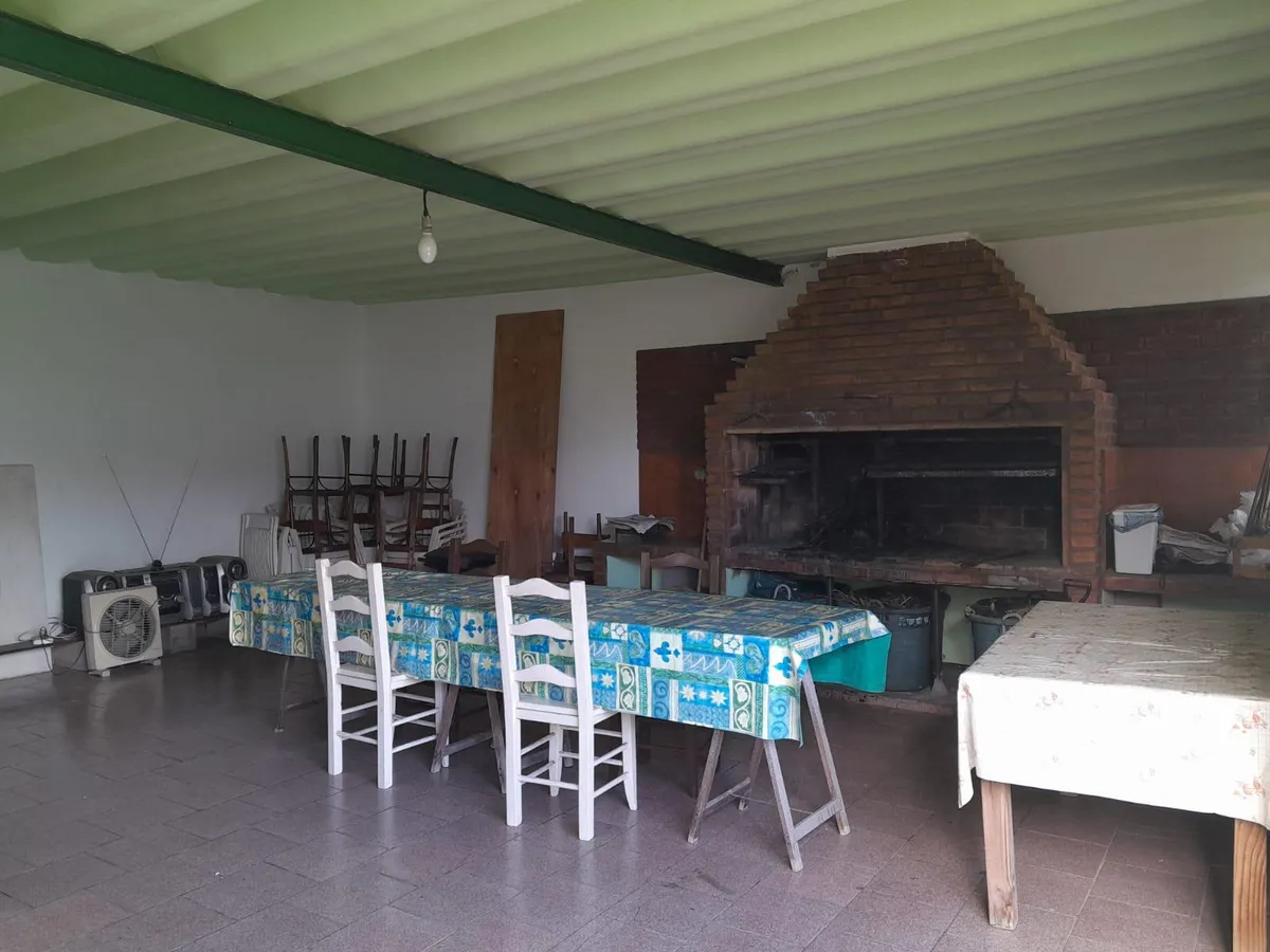 Two-storey chalet-style apartment with 5 rooms. It has 4 bedrooms with built-in wardrobes, 2 bathrooms, a living-dining room with a wood-burning fireplace, and an equipped kitchen. The property includes a main dining room, a parking area with a through driveway for several cars, a front garden with security bars, and a large backyard with a grill and covered BBQ area, plus a bathroom and a grill. In good condition and located in a residential area.