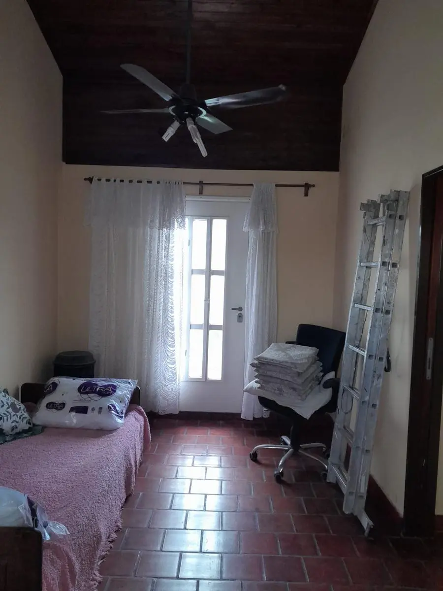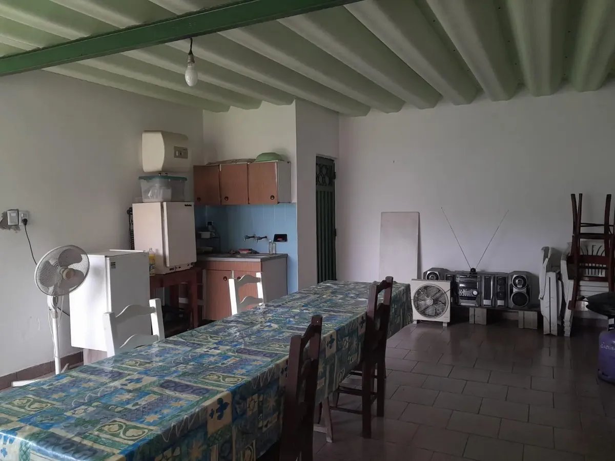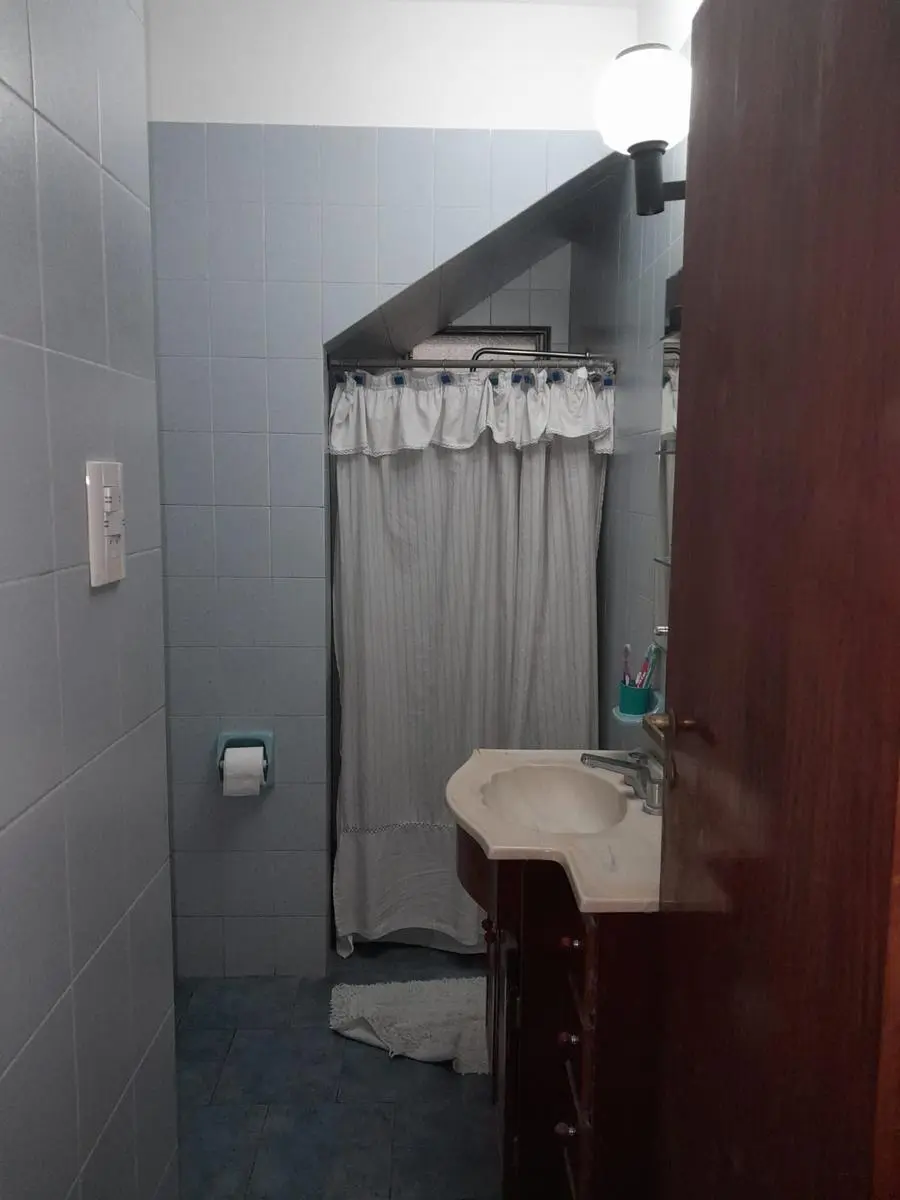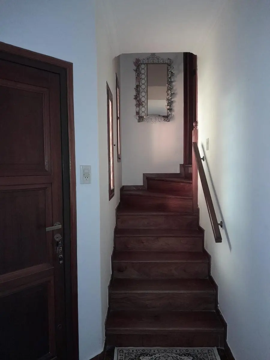 Two-storey chalet-style apartment with 5 rooms. It has 4 bedrooms with built-in wardrobes, 2 bathrooms, a living-dining room with a wood-burning fireplace, and an equipped kitchen. The property includes a main dining room, a parking area with a through driveway for several cars, a front garden with security bars, and a large backyard with a grill and covered BBQ area, plus a bathroom and a grill. In good condition and located in a residential area.