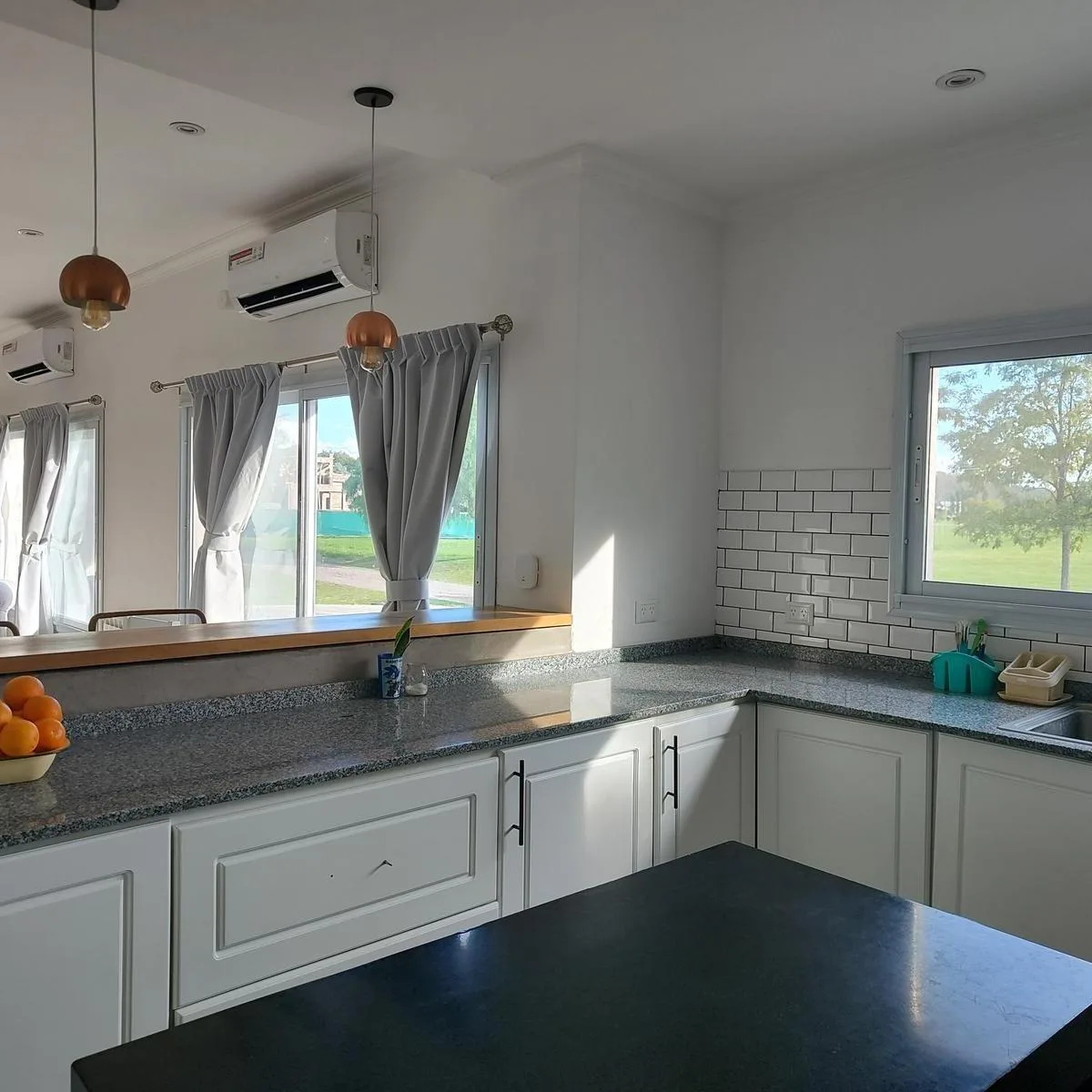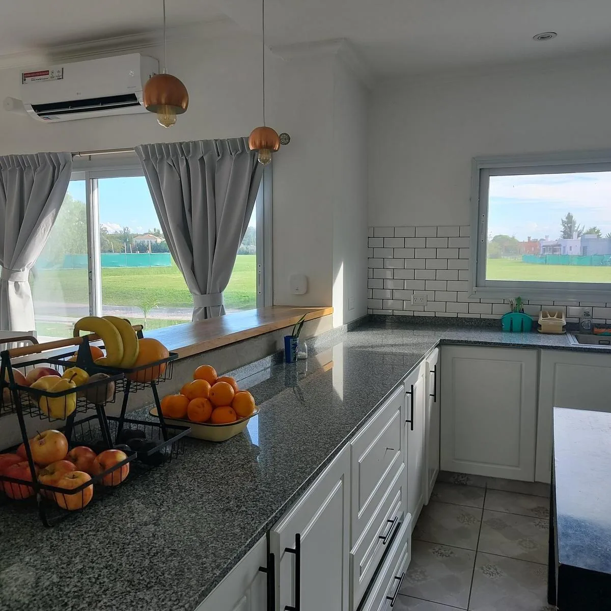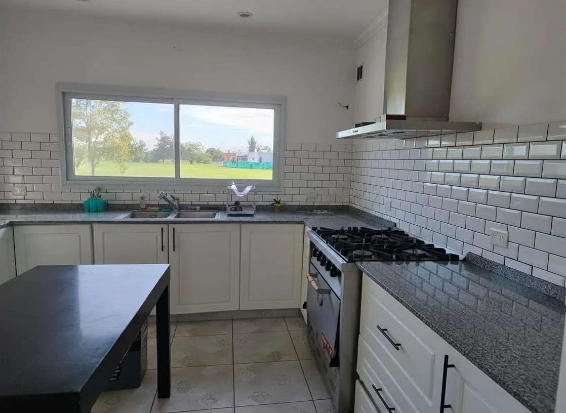 Single-storey house with 6 rooms and 4 bedrooms in La Elina, for permanent rental. Entry hall leads to a living-dining area with an integrated kitchen. The home includes a master bedroom with en-suite bathroom and dressing room, 2 additional bedrooms with closets, 2 full bathrooms, a laundry area, and covered parking for 2 cars. Outdoor features include a grill-equipped quincho and a pool on a 2000 m² lot.
