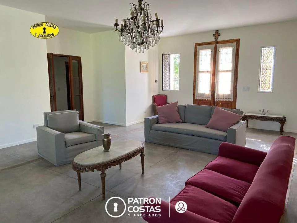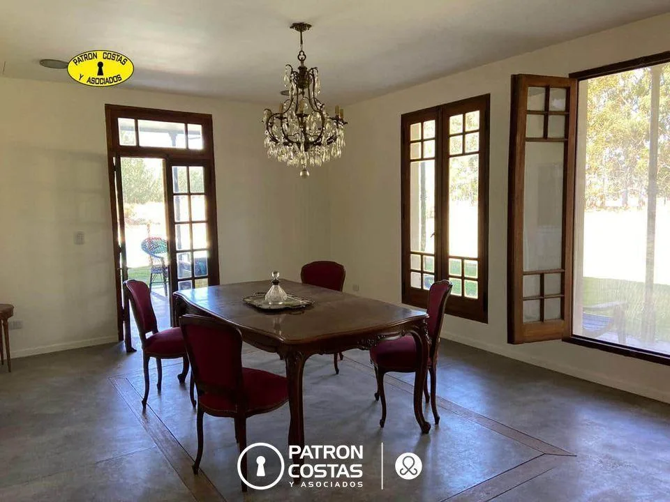 House for rent in La Colina Golf & Polo, on 5,000 m² total. The property has 4 bedrooms, all with en-suite bathrooms. A large L-shaped living-dining room includes a wood-burning fireplace, with a separate office or living area, and a dining kitchen connected to a gallery with a grill. There is also a service room and laundry area, with heating via radiators and hot/cold split air conditioning in most rooms, plus an 8 x 12 m pool.