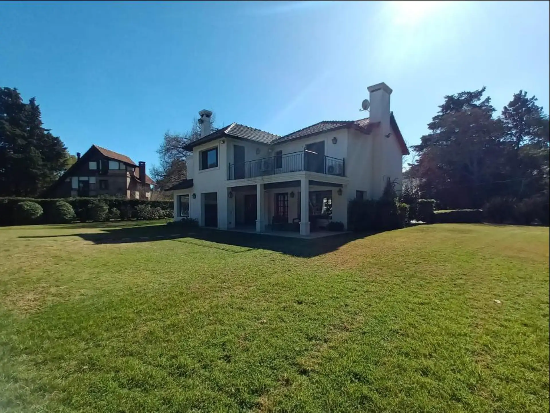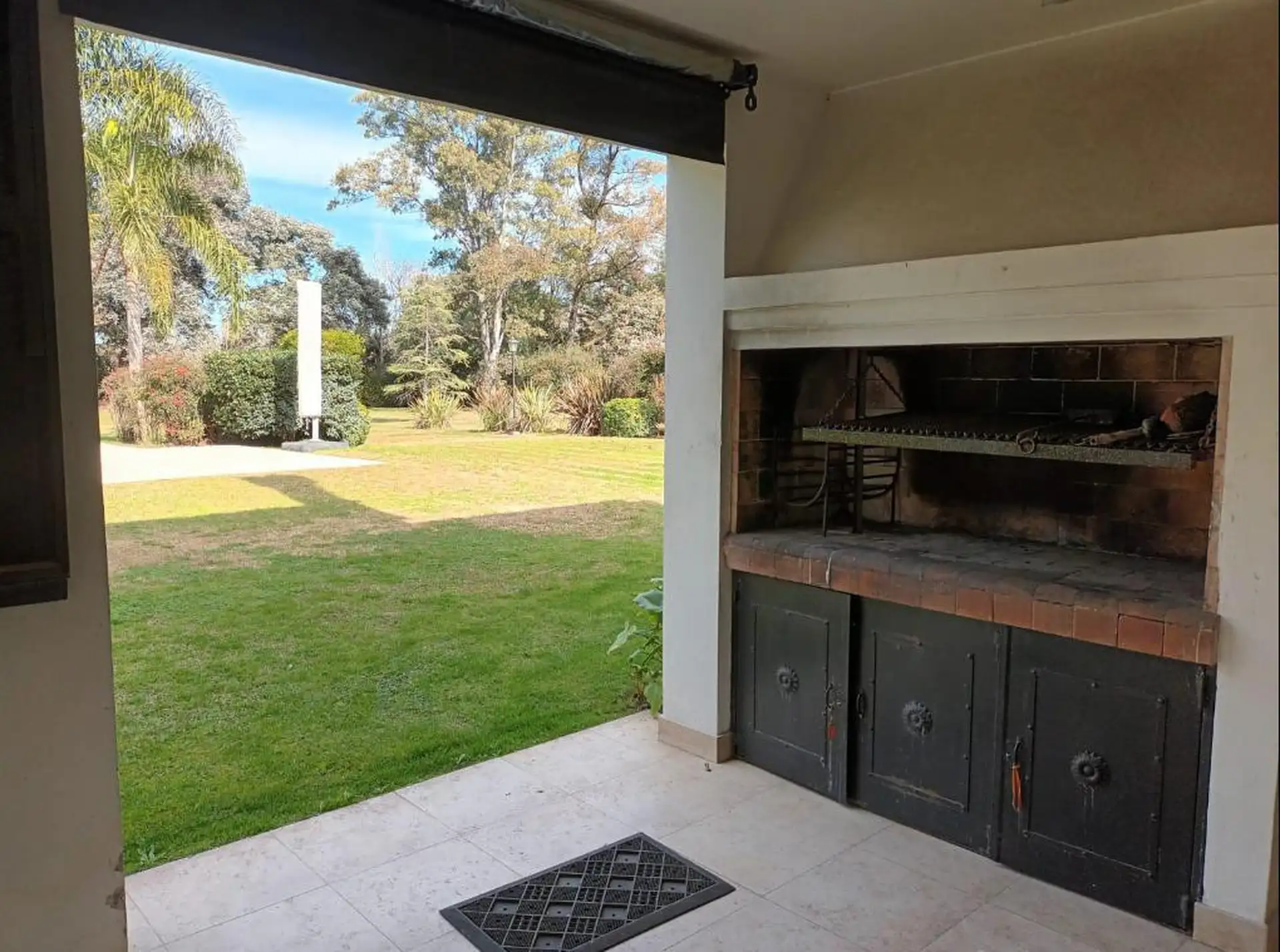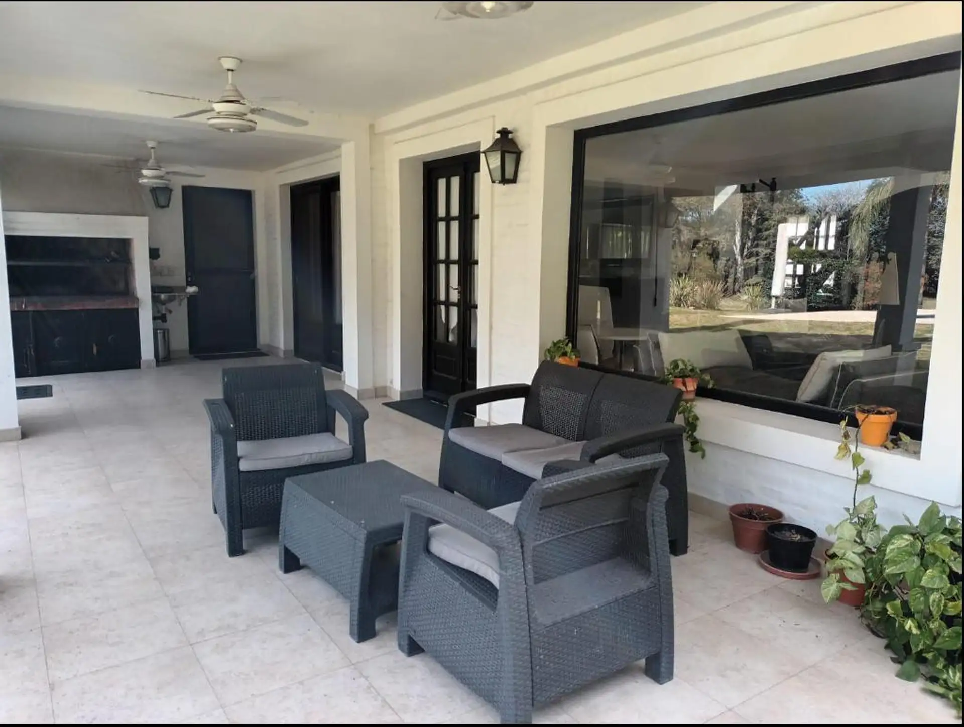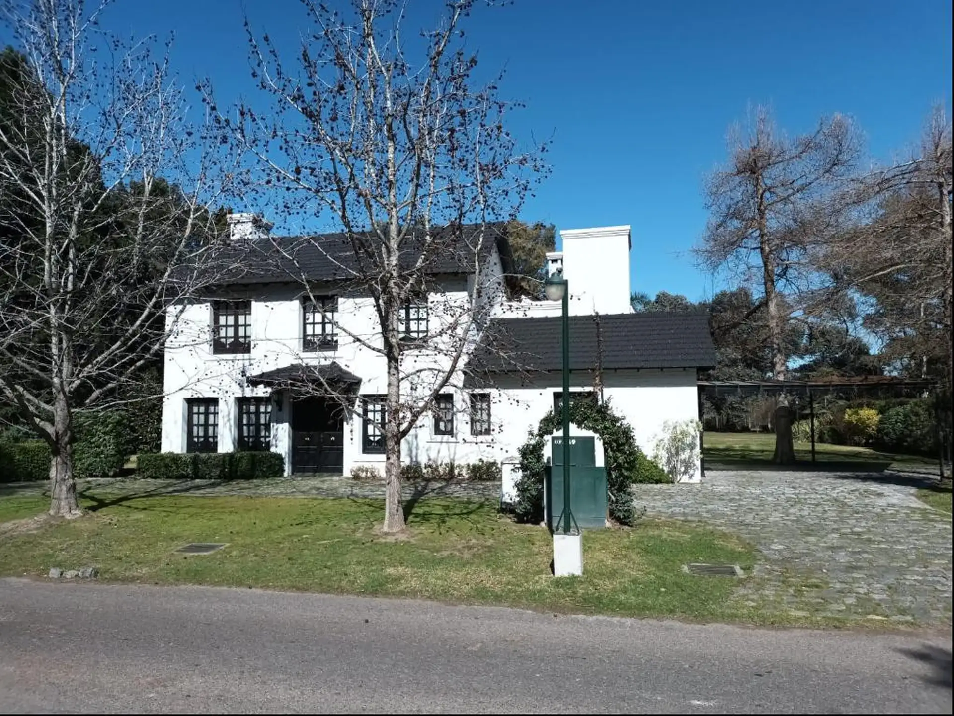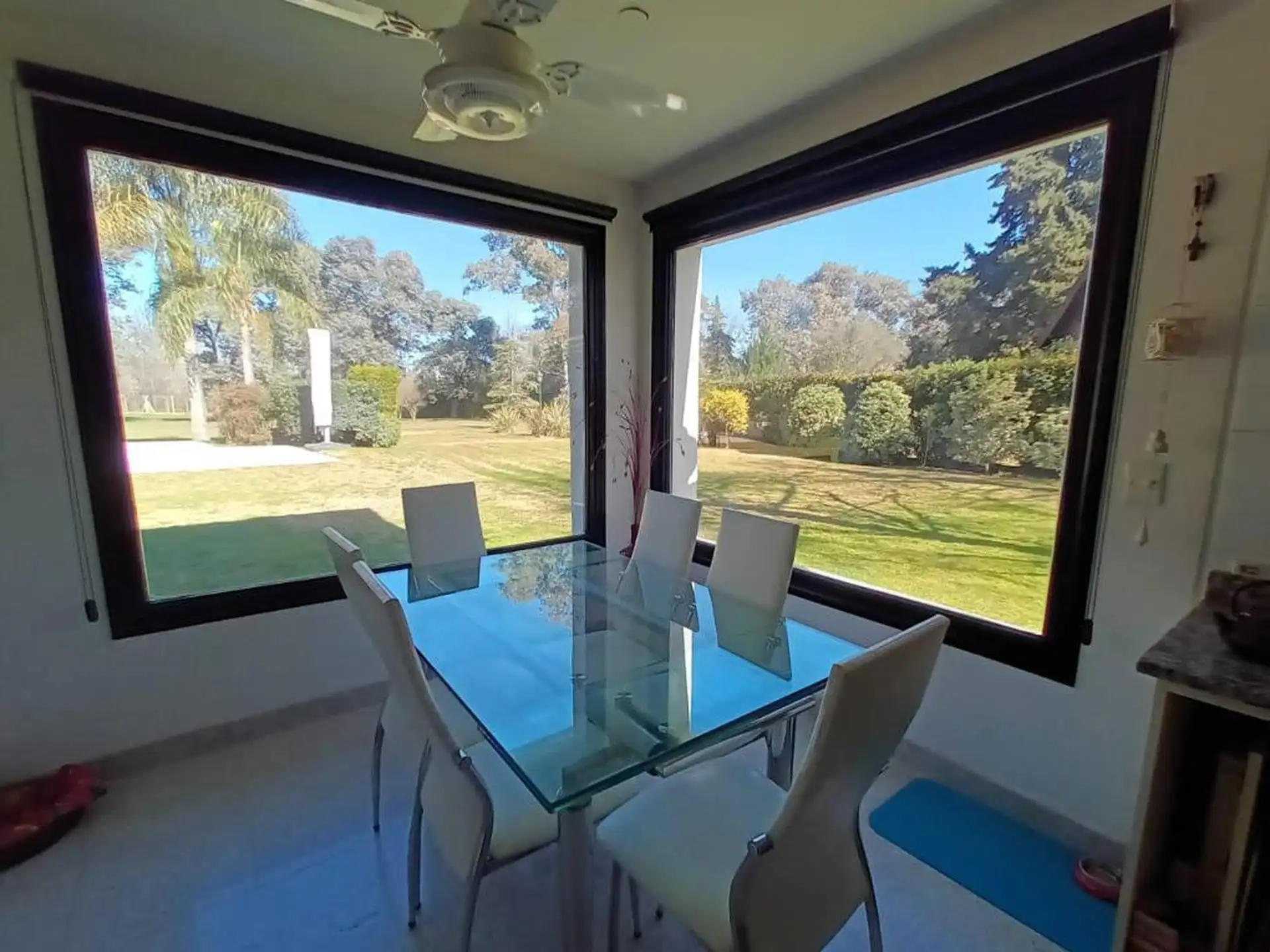 Two-storey chalet-style house on an internal lot of 1,800 m² in Club de Golf Praderas de Luján, Luján, Buenos Aires Province. On the ground floor it has a large living-dining room with windows, direct access to a gallery with a grill, a main dining room, a modern kitchen with double oven and dishwasher, a breakfast nook overlooking the garden, a separate laundry room, a reception hall with a guest toilet, and a ground-floor suite that could be used as a guest room. Upstairs there is a distributi