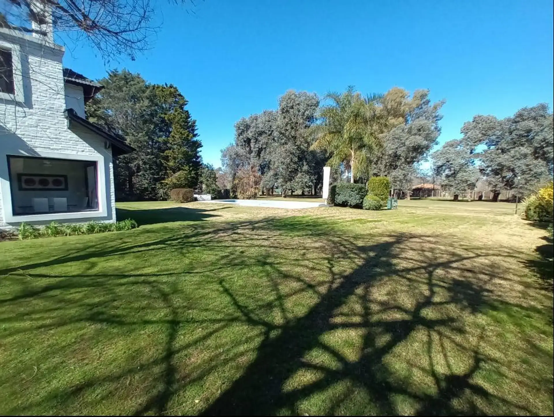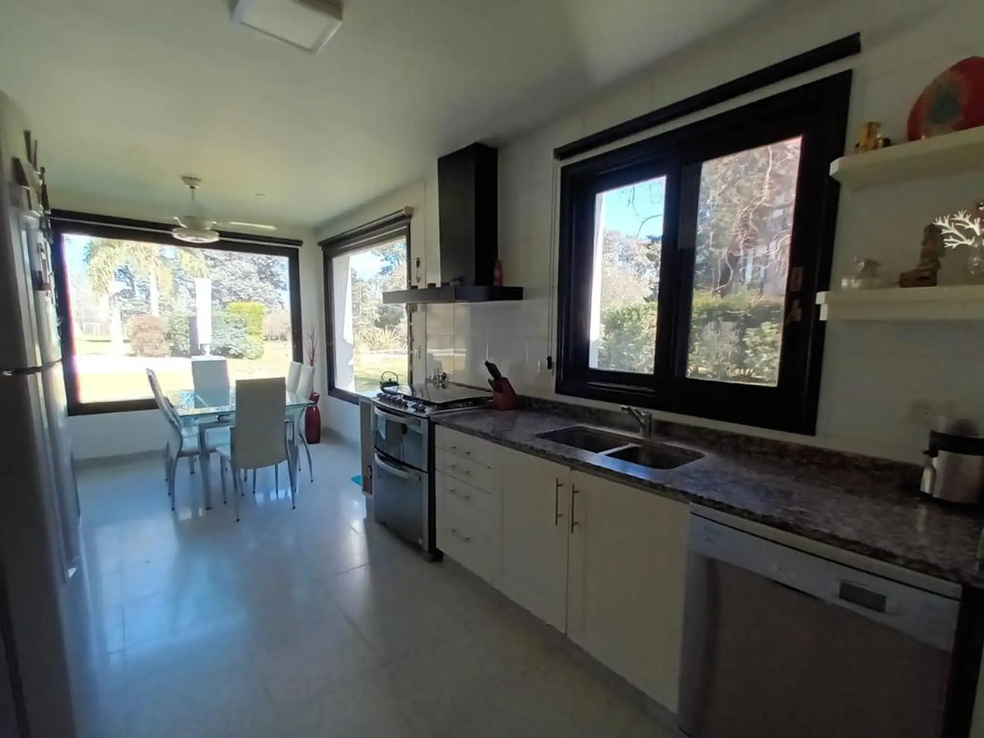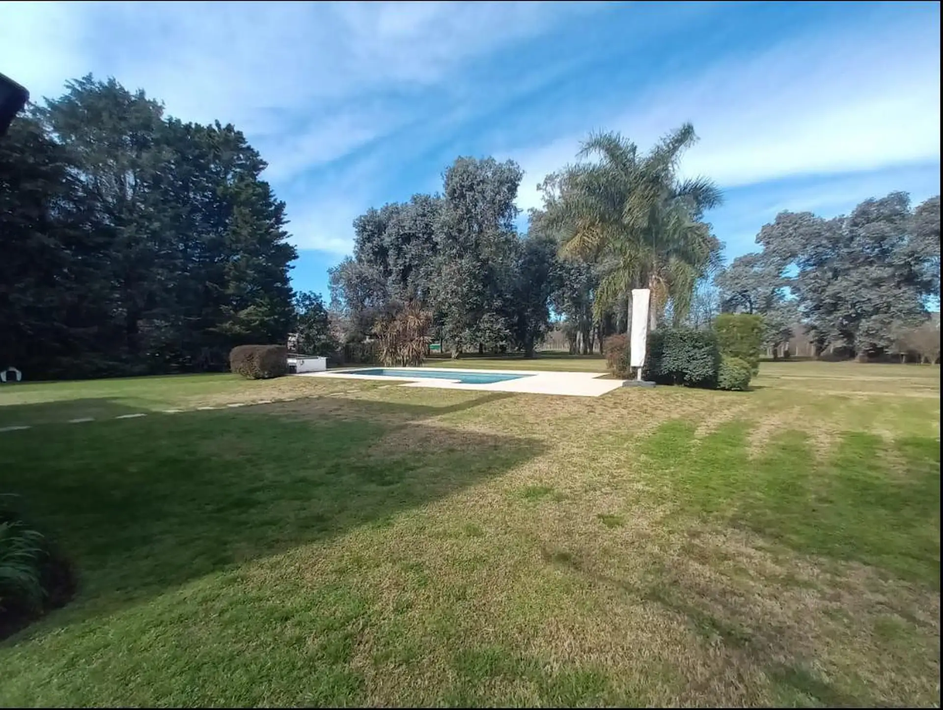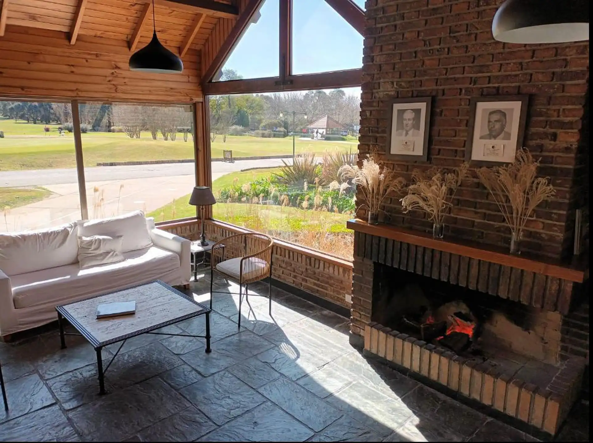 Two-storey chalet-style house on an internal lot of 1,800 m² in Club de Golf Praderas de Luján, Luján, Buenos Aires Province. On the ground floor it has a large living-dining room with windows, direct access to a gallery with a grill, a main dining room, a modern kitchen with double oven and dishwasher, a breakfast nook overlooking the garden, a separate laundry room, a reception hall with a guest toilet, and a ground-floor suite that could be used as a guest room. Upstairs there is a distributi