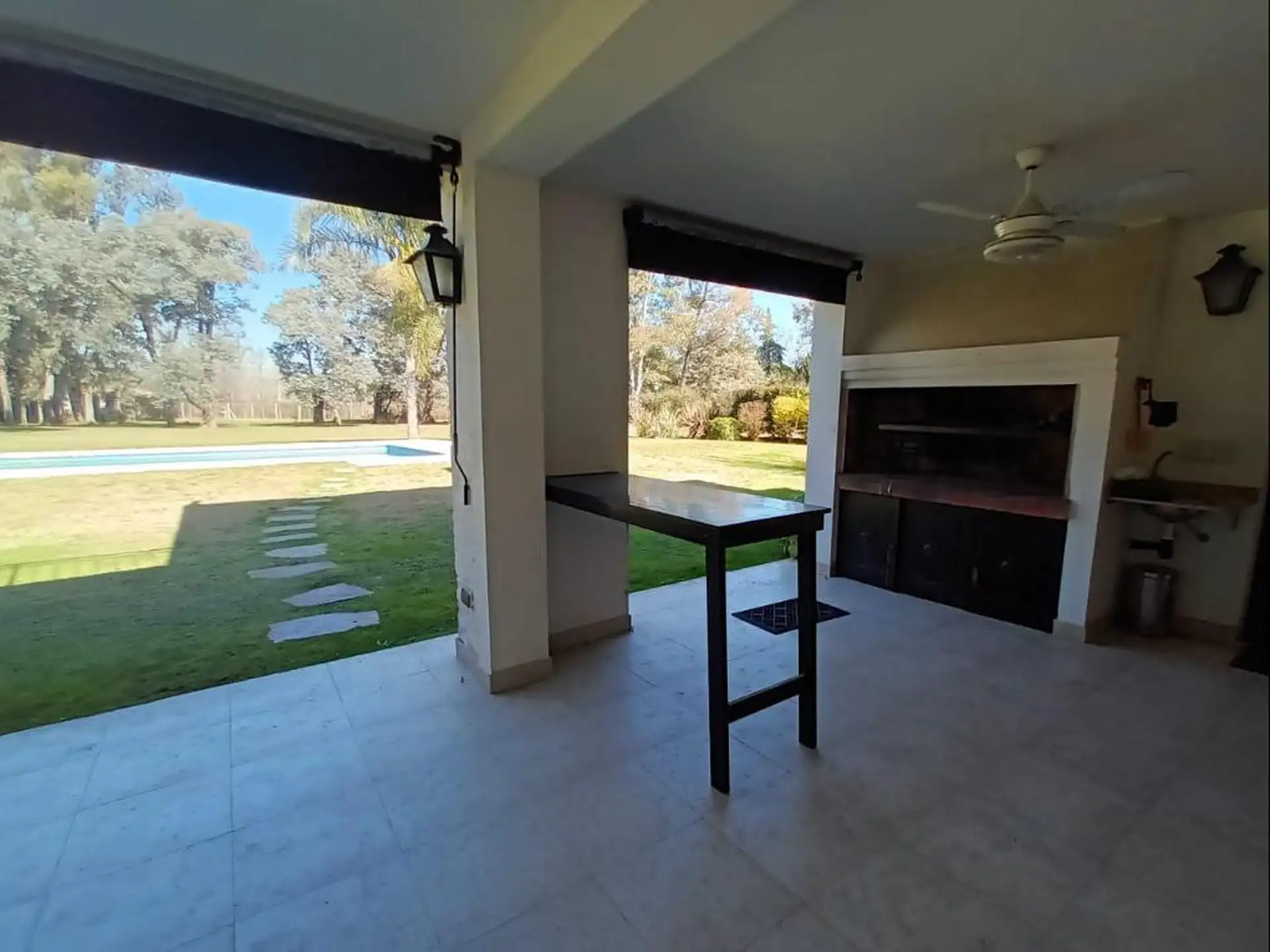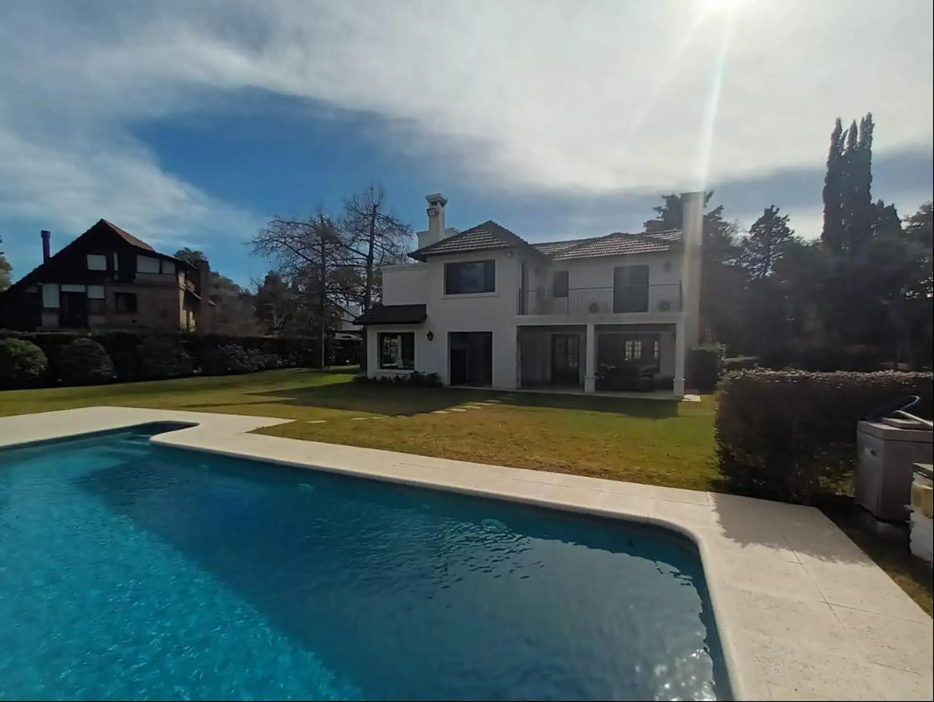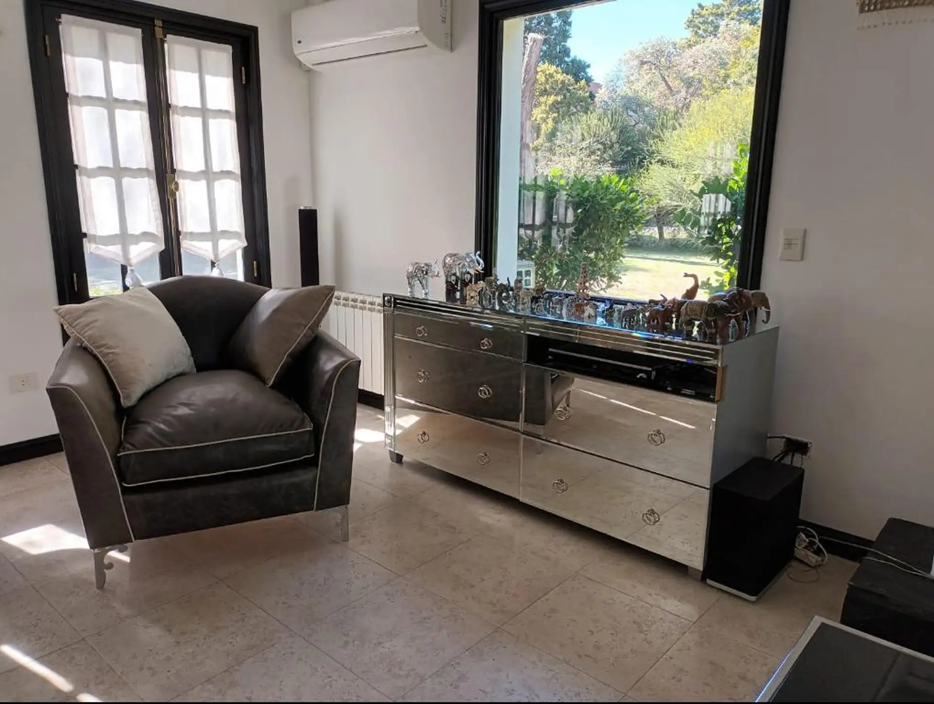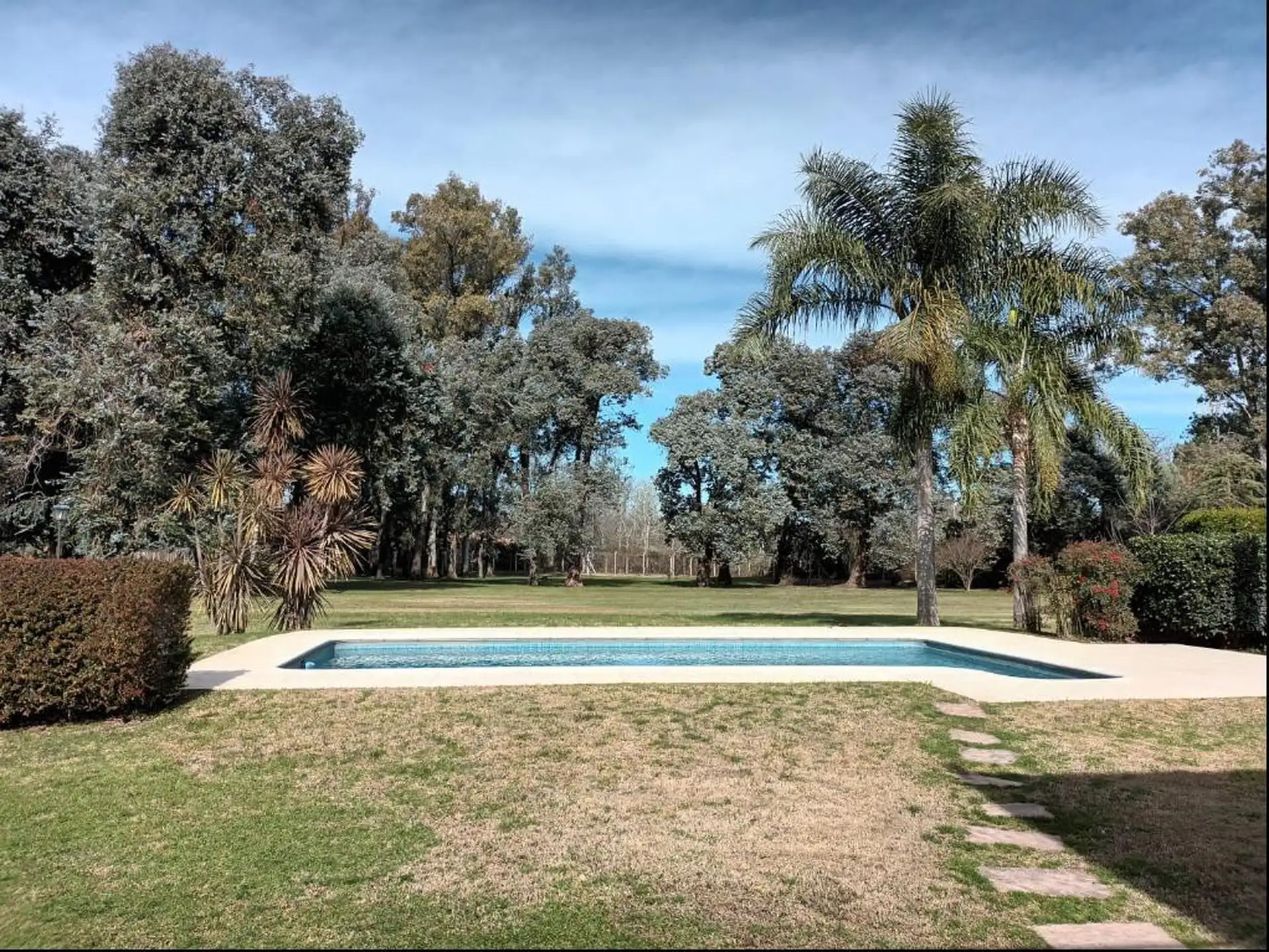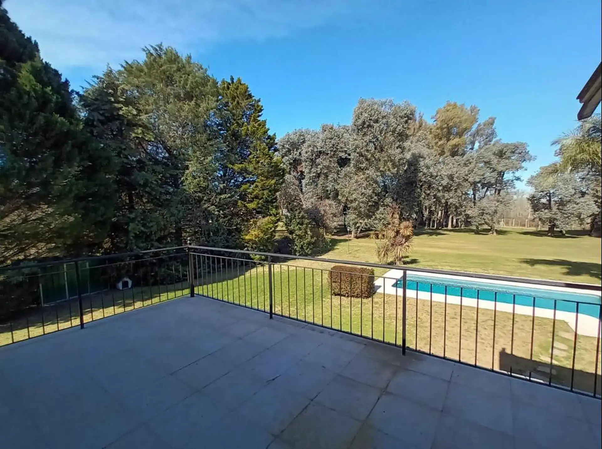 Two-storey chalet-style house on an internal lot of 1,800 m² in Club de Golf Praderas de Luján, Luján, Buenos Aires Province. On the ground floor it has a large living-dining room with windows, direct access to a gallery with a grill, a main dining room, a modern kitchen with double oven and dishwasher, a breakfast nook overlooking the garden, a separate laundry room, a reception hall with a guest toilet, and a ground-floor suite that could be used as a guest room. Upstairs there is a distributi