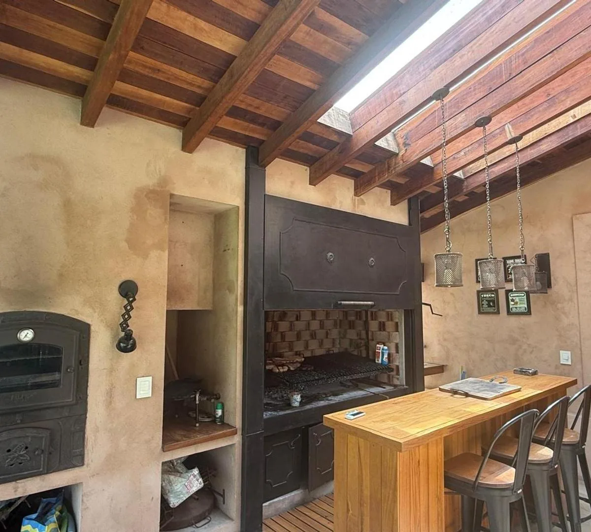 Four-bedroom house, 8 years old, with 400 m² covered, in front of Plaza "El caracol". Ground floor includes a living-dining room with wood-burning fireplace, a fully fitted eat-in kitchen with Italian professional cooking equipment, service and main entrances, a laundry area, a guest bedroom, a complete bathroom, a reception toilet, and a games room with a cinema projection. A large covered gallery with bar, incense-wood ceilings, grill, wood oven and hob, plus a complete bathroom for the rear a