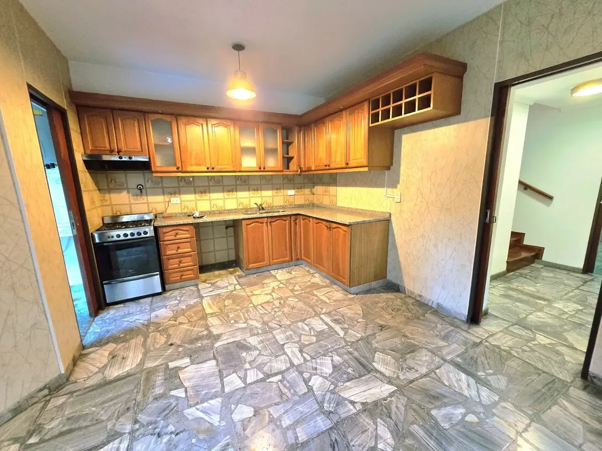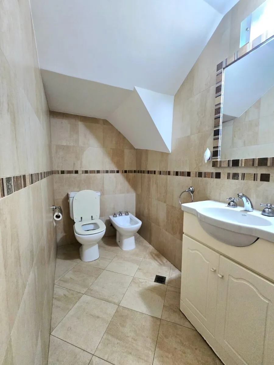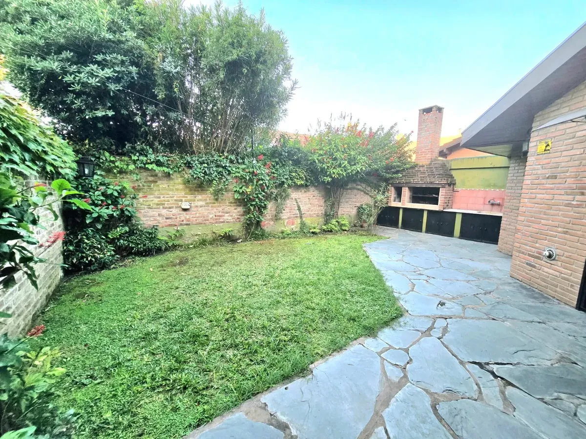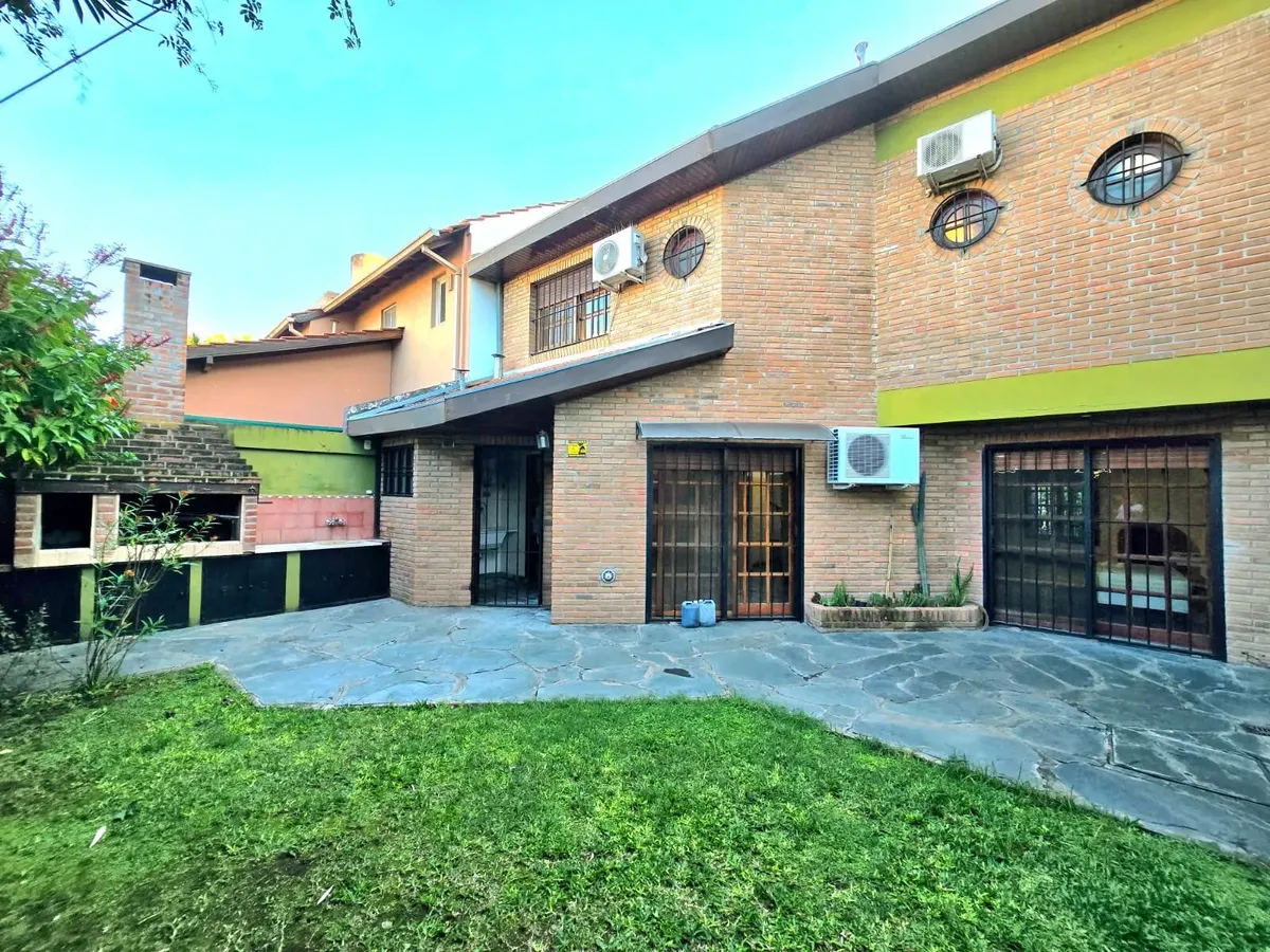 Front house for rent in Martínez with a garden and a covered/BBQ area. Total area 250.86 m², comprising 162.75 m² covered plus 14.62 m² semi-covered and 73.49 m² uncovered. Layout includes a ground-floor garage, living-dining room, daily dining kitchen, separate laundry room, and a reception toilet, plus a garden with grill. On the first floor there are 4 bedrooms, with the principal bedroom in suite with a dressing area, and a full second bathroom. The second floor has an attic suitable for a p