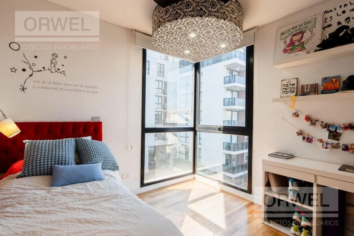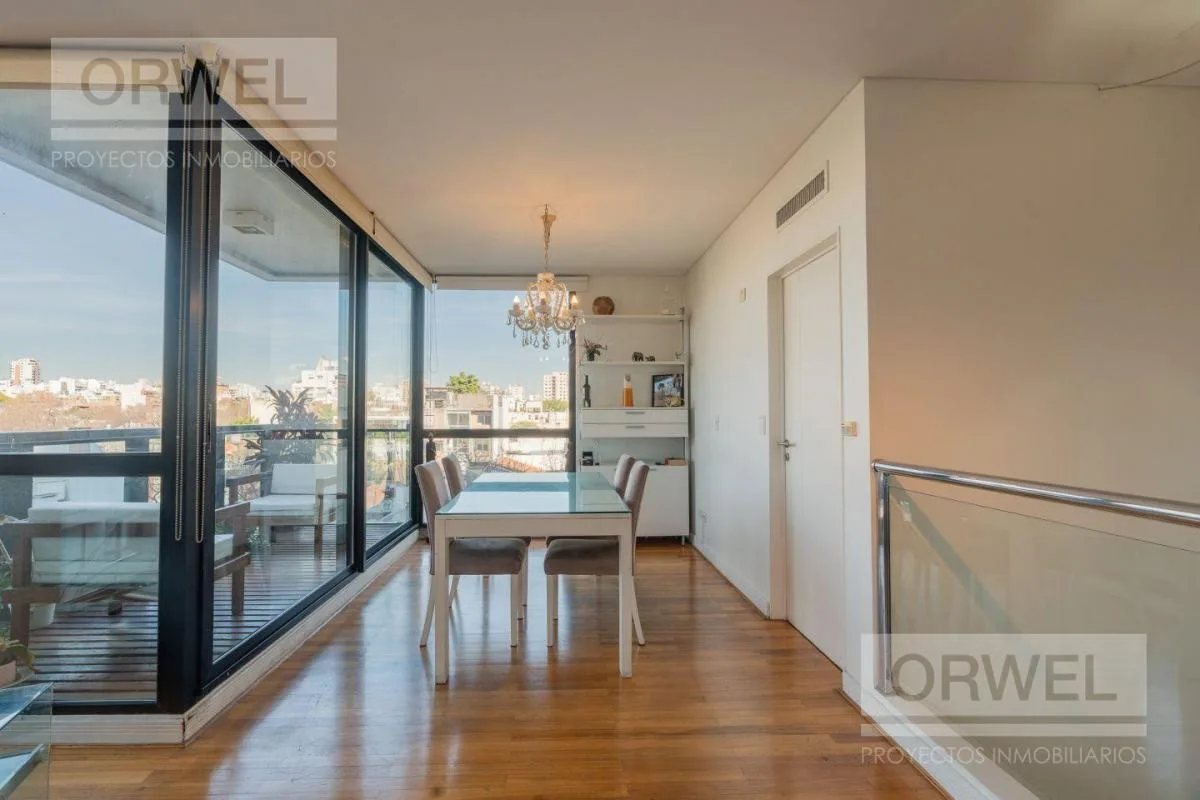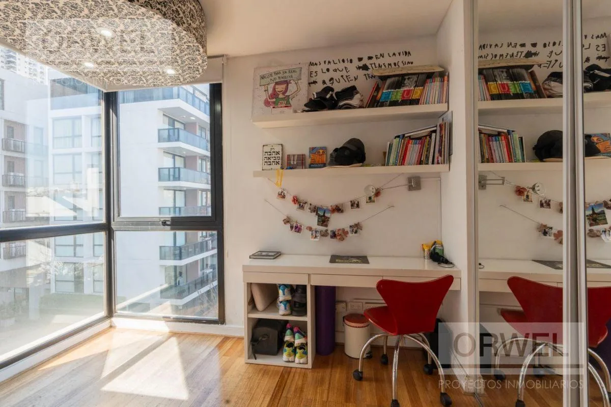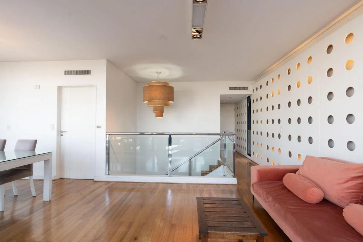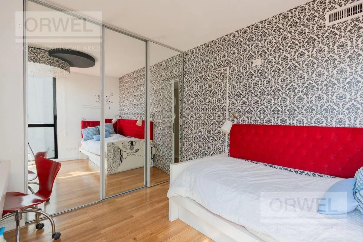 Duplex apartment in Núñez across floors 3 and 4. The layout includes 4 bedrooms, 3 bathrooms, a reception toilet, and two living areas. It has 2 assigned parking spaces, can be rented furnished or unfurnished, and includes a balcony with decking, hardwood floors, and double-door floor-to-ceiling windows. The independent kitchen has grey granite countertops, porcelain tiles, connection for a dishwasher, and a separate laundry area with staff room or study. The complex has 24-hour security, a comm