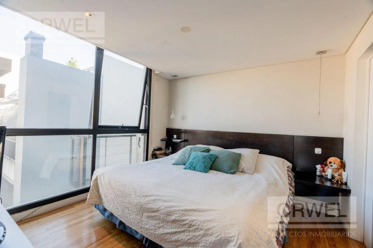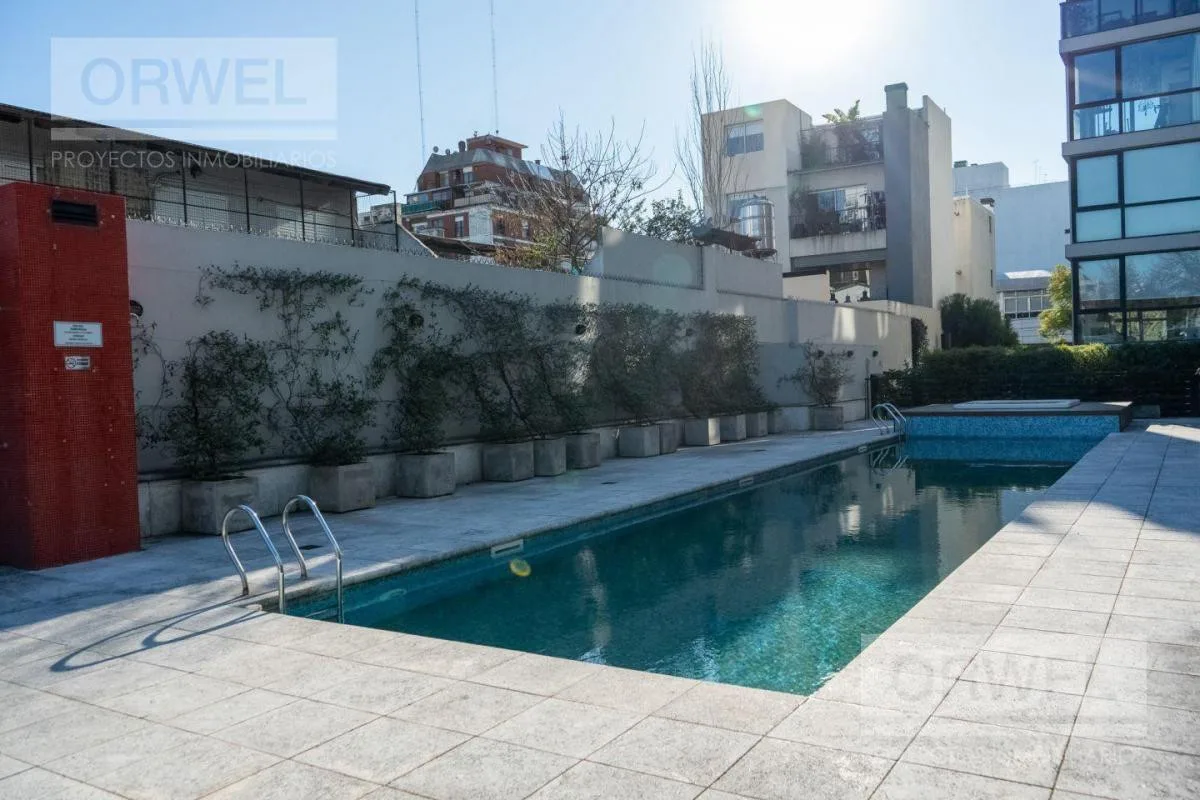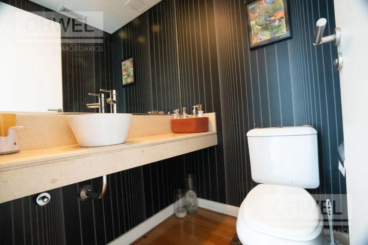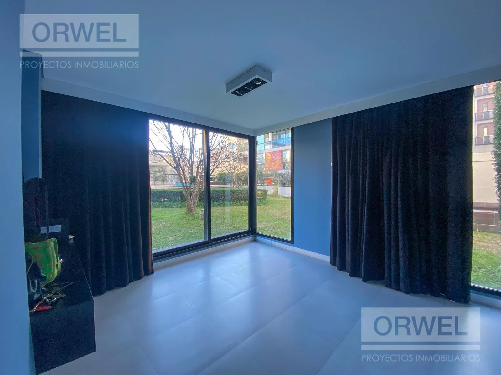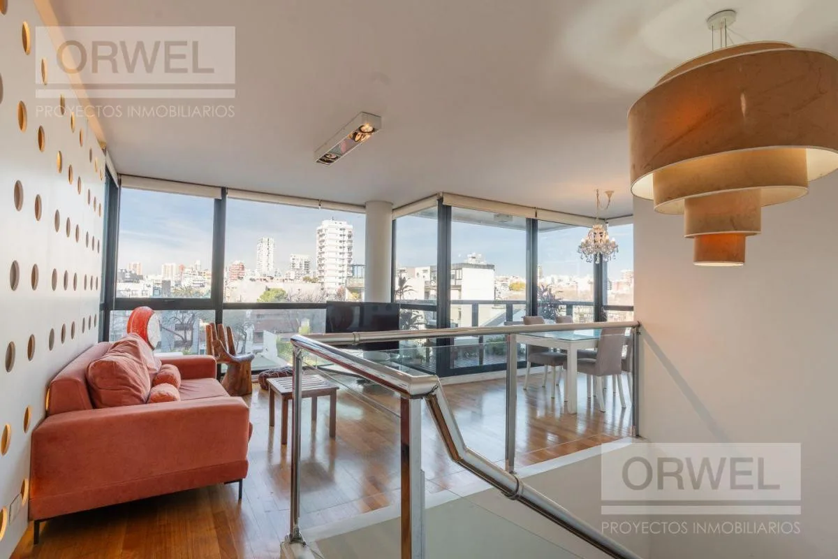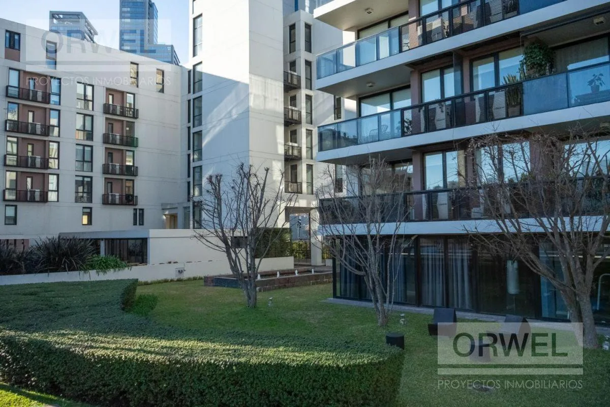 Duplex apartment in Núñez across floors 3 and 4. The layout includes 4 bedrooms, 3 bathrooms, a reception toilet, and two living areas. It has 2 assigned parking spaces, can be rented furnished or unfurnished, and includes a balcony with decking, hardwood floors, and double-door floor-to-ceiling windows. The independent kitchen has grey granite countertops, porcelain tiles, connection for a dishwasher, and a separate laundry area with staff room or study. The complex has 24-hour security, a comm
