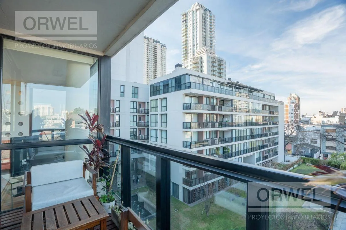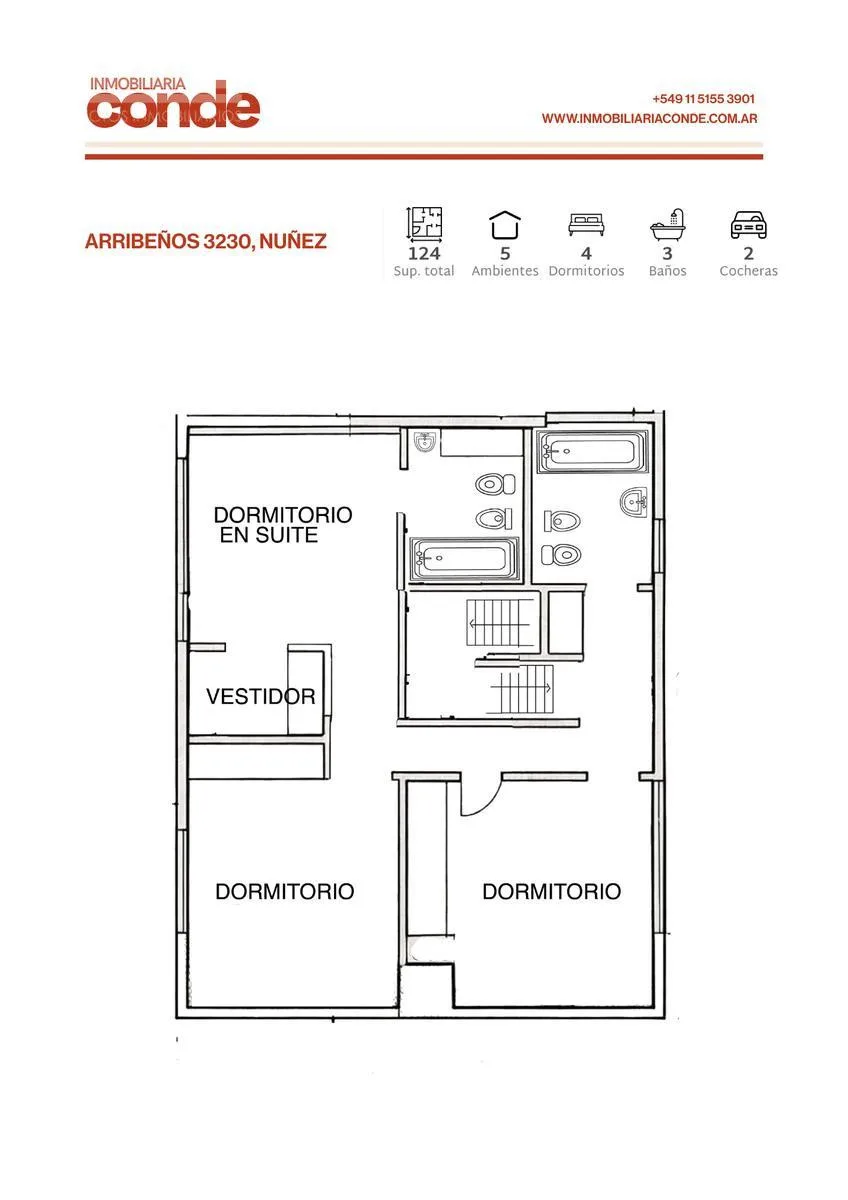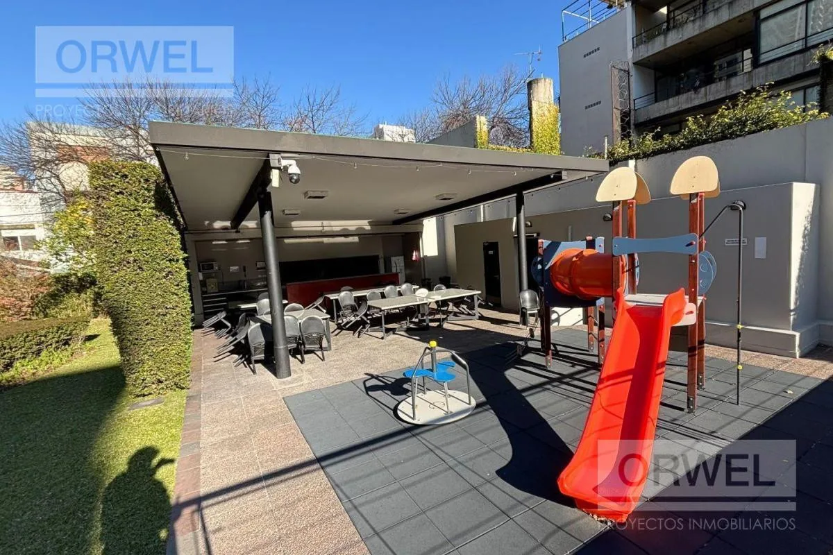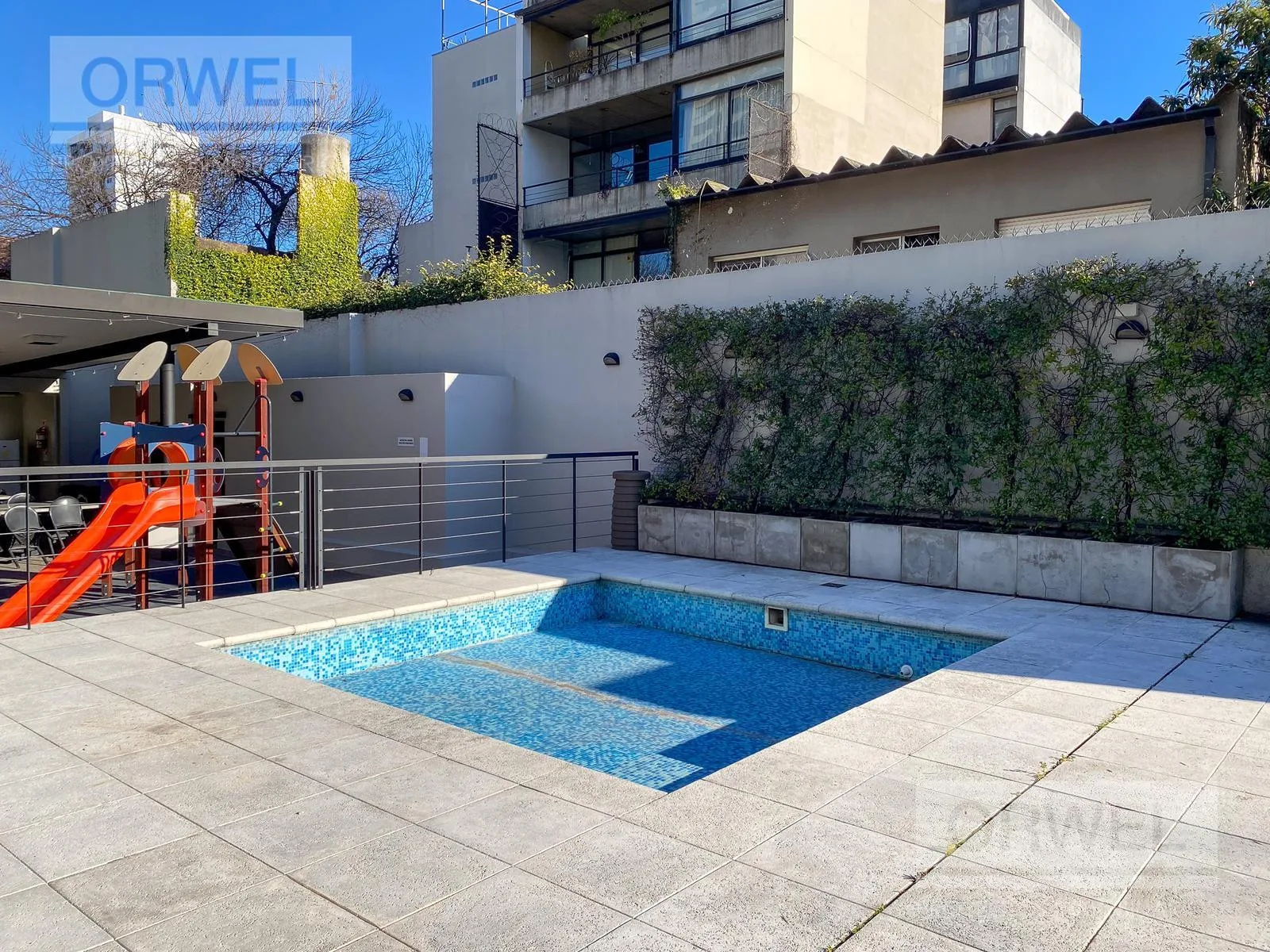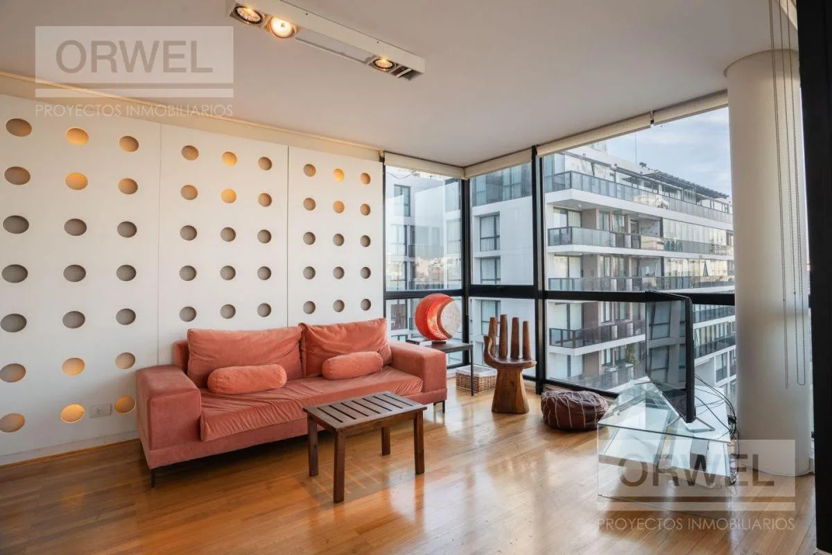 Duplex apartment in Núñez across floors 3 and 4. The layout includes 4 bedrooms, 3 bathrooms, a reception toilet, and two living areas. It has 2 assigned parking spaces, can be rented furnished or unfurnished, and includes a balcony with decking, hardwood floors, and double-door floor-to-ceiling windows. The independent kitchen has grey granite countertops, porcelain tiles, connection for a dishwasher, and a separate laundry area with staff room or study. The complex has 24-hour security, a comm