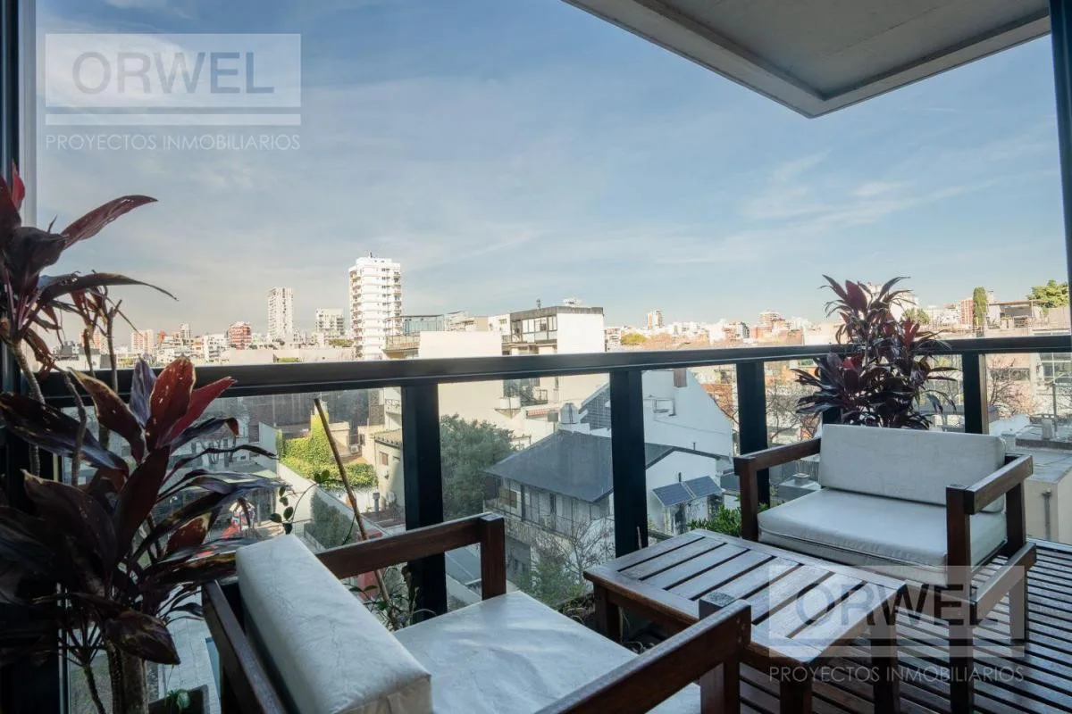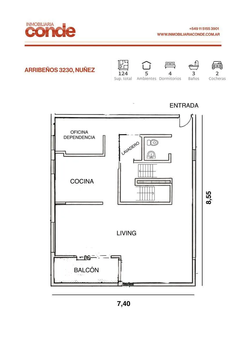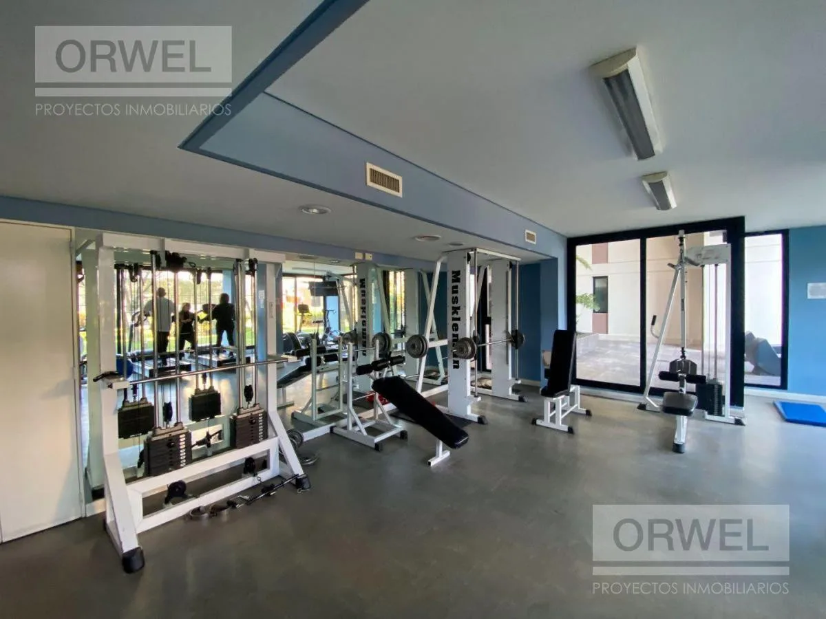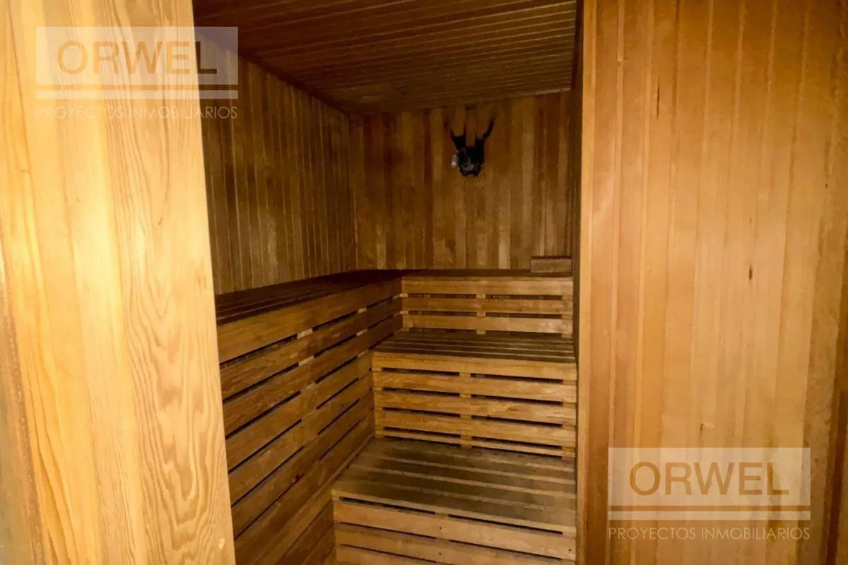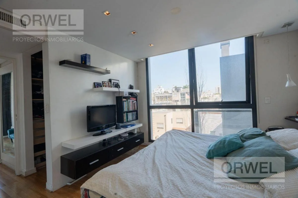 Duplex apartment in Núñez across floors 3 and 4. The layout includes 4 bedrooms, 3 bathrooms, a reception toilet, and two living areas. It has 2 assigned parking spaces, can be rented furnished or unfurnished, and includes a balcony with decking, hardwood floors, and double-door floor-to-ceiling windows. The independent kitchen has grey granite countertops, porcelain tiles, connection for a dishwasher, and a separate laundry area with staff room or study. The complex has 24-hour security, a comm