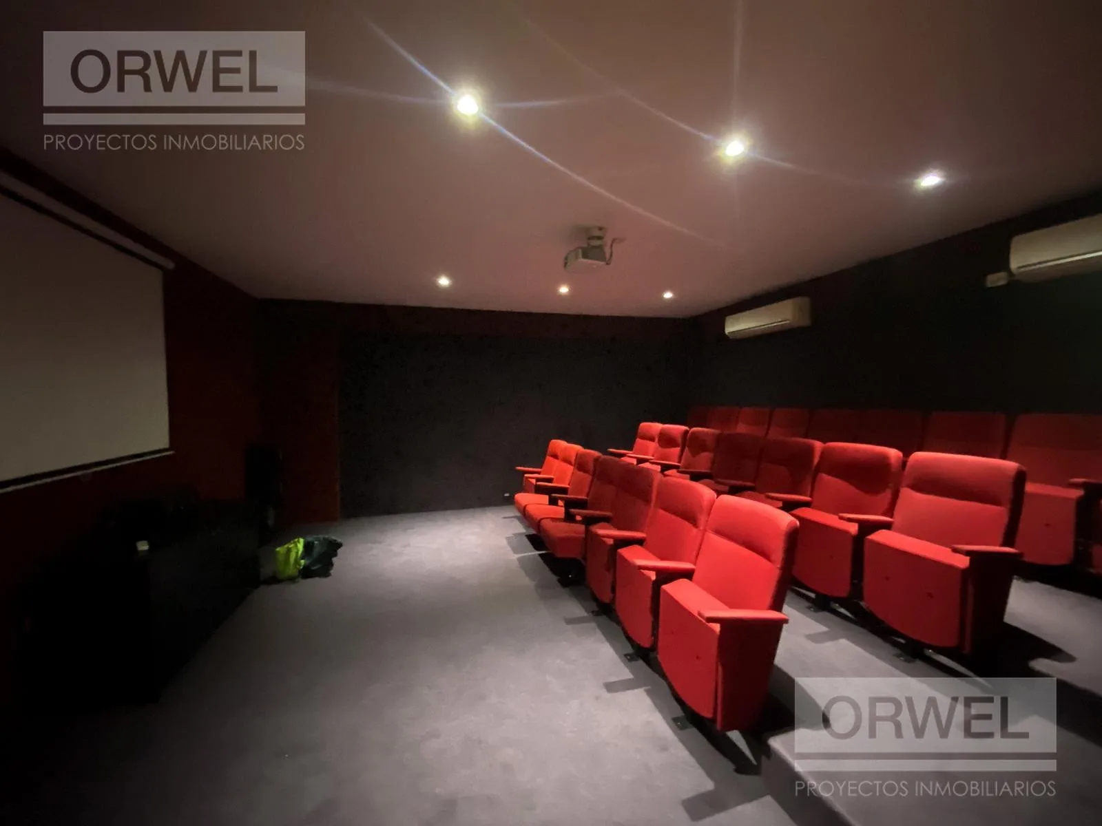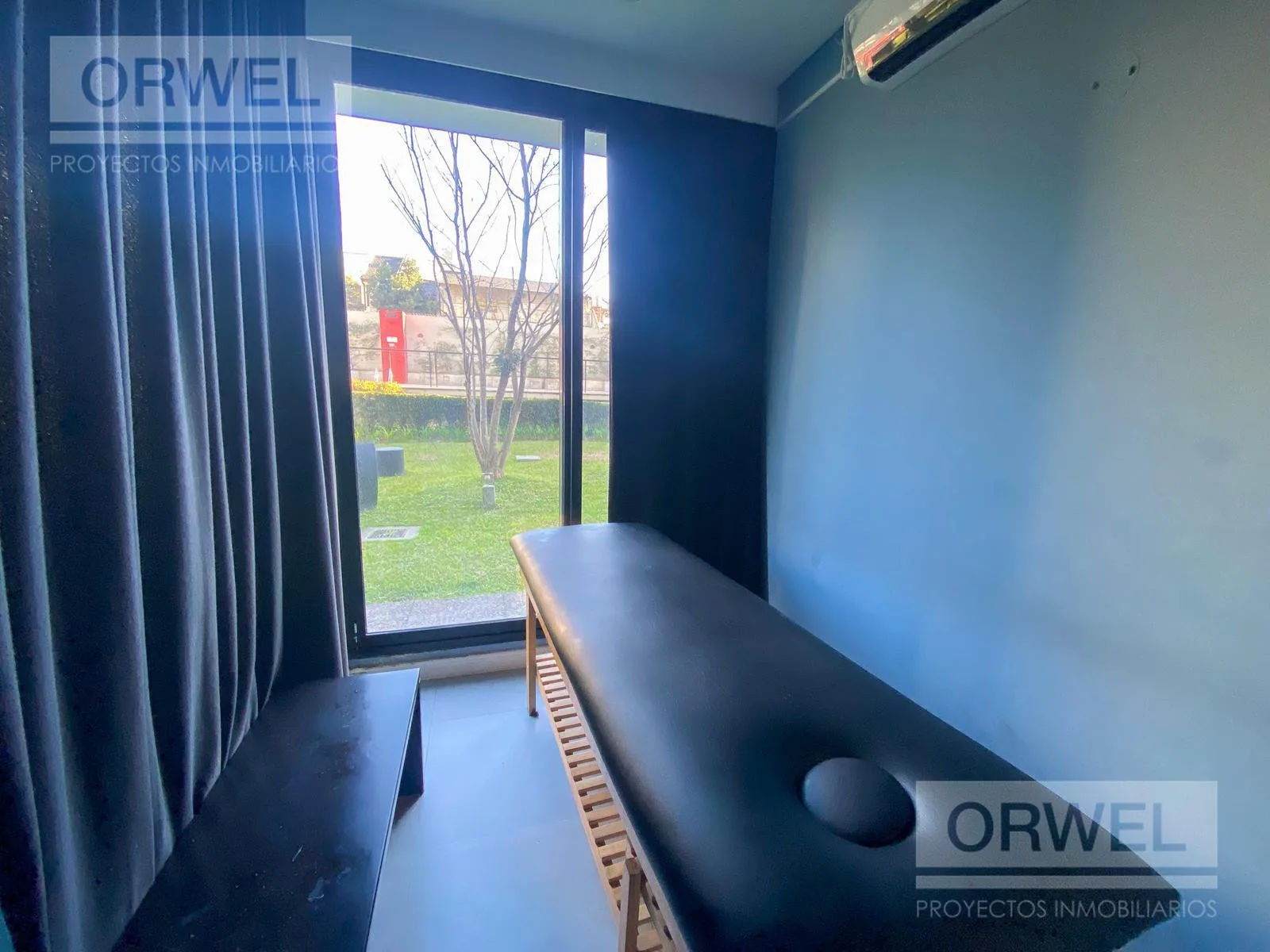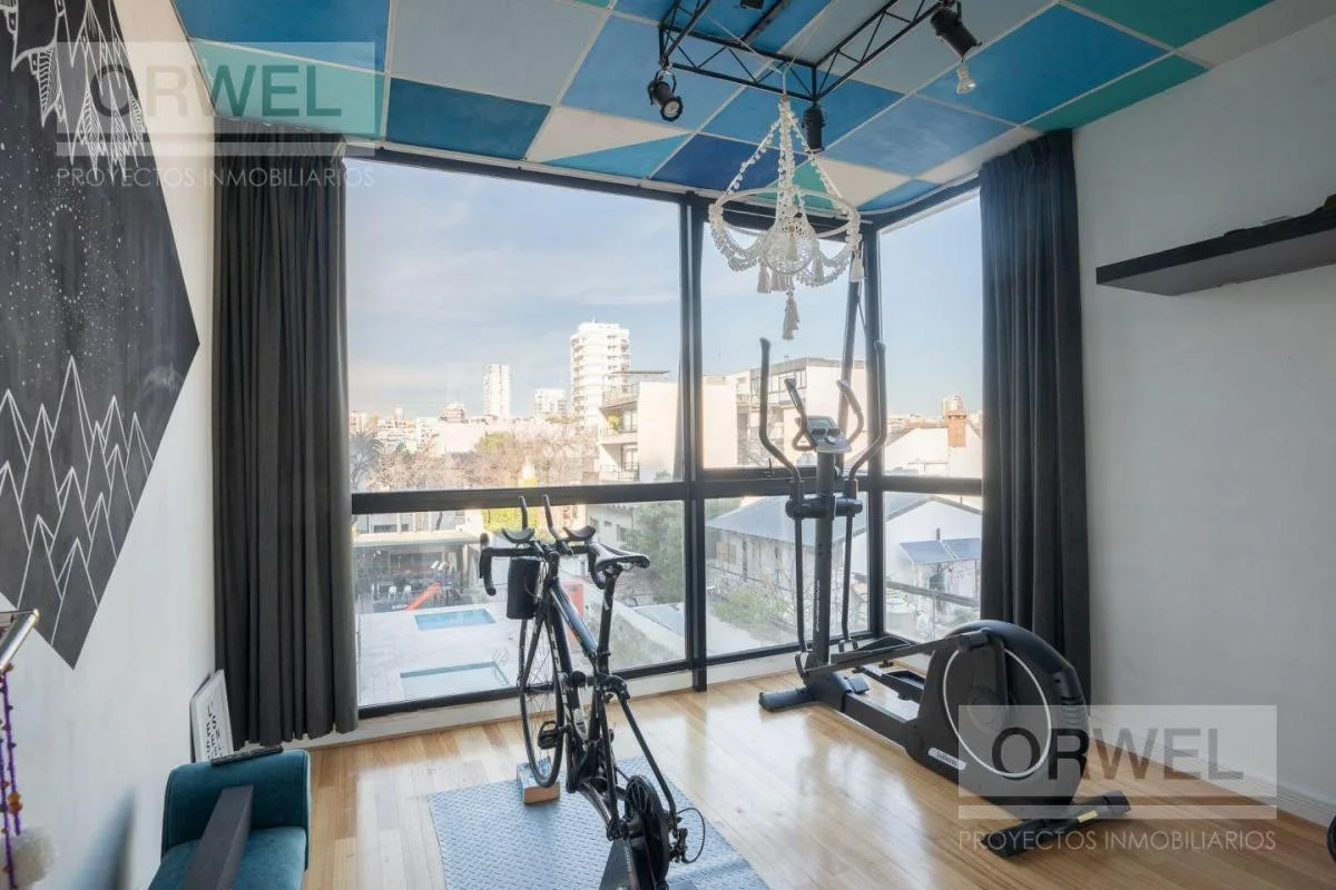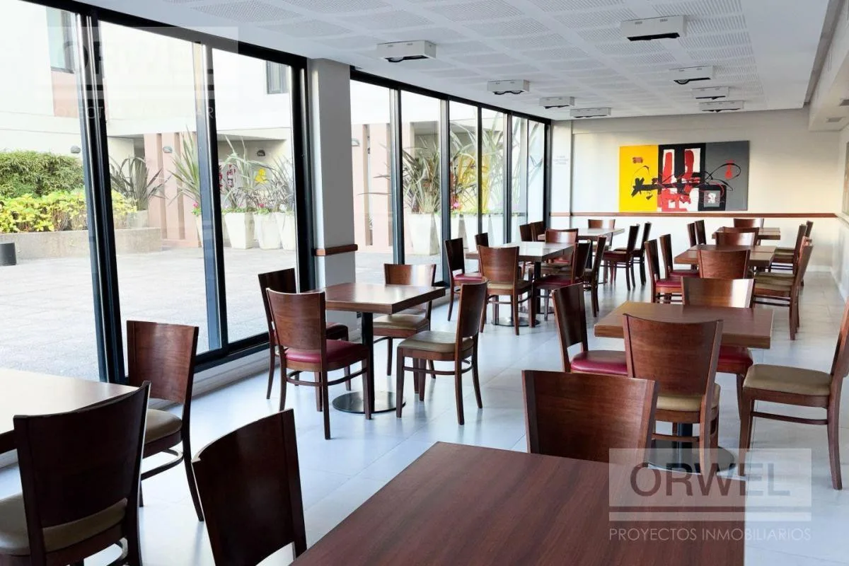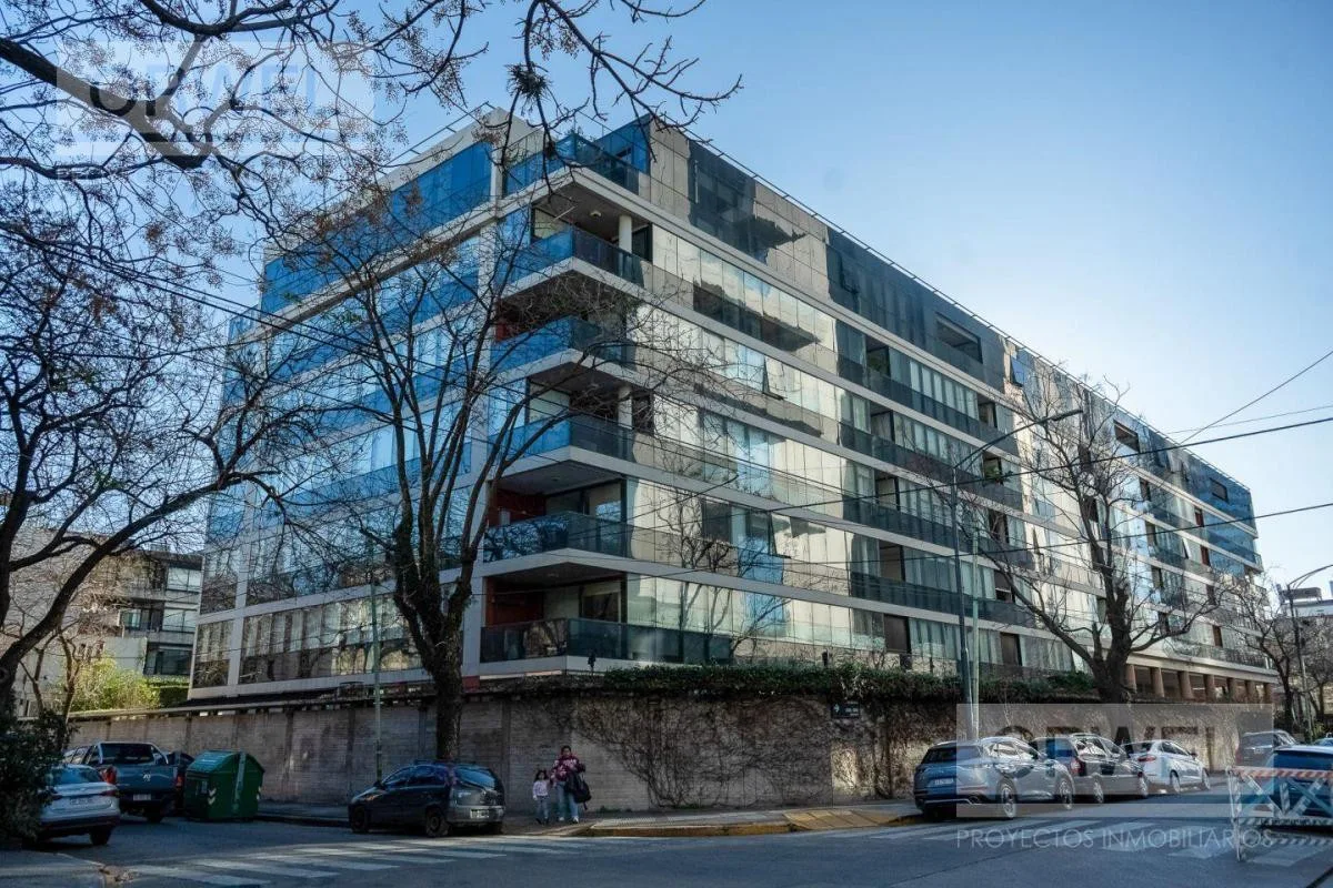 Duplex apartment in Núñez across floors 3 and 4. The layout includes 4 bedrooms, 3 bathrooms, a reception toilet, and two living areas. It has 2 assigned parking spaces, can be rented furnished or unfurnished, and includes a balcony with decking, hardwood floors, and double-door floor-to-ceiling windows. The independent kitchen has grey granite countertops, porcelain tiles, connection for a dishwasher, and a separate laundry area with staff room or study. The complex has 24-hour security, a comm