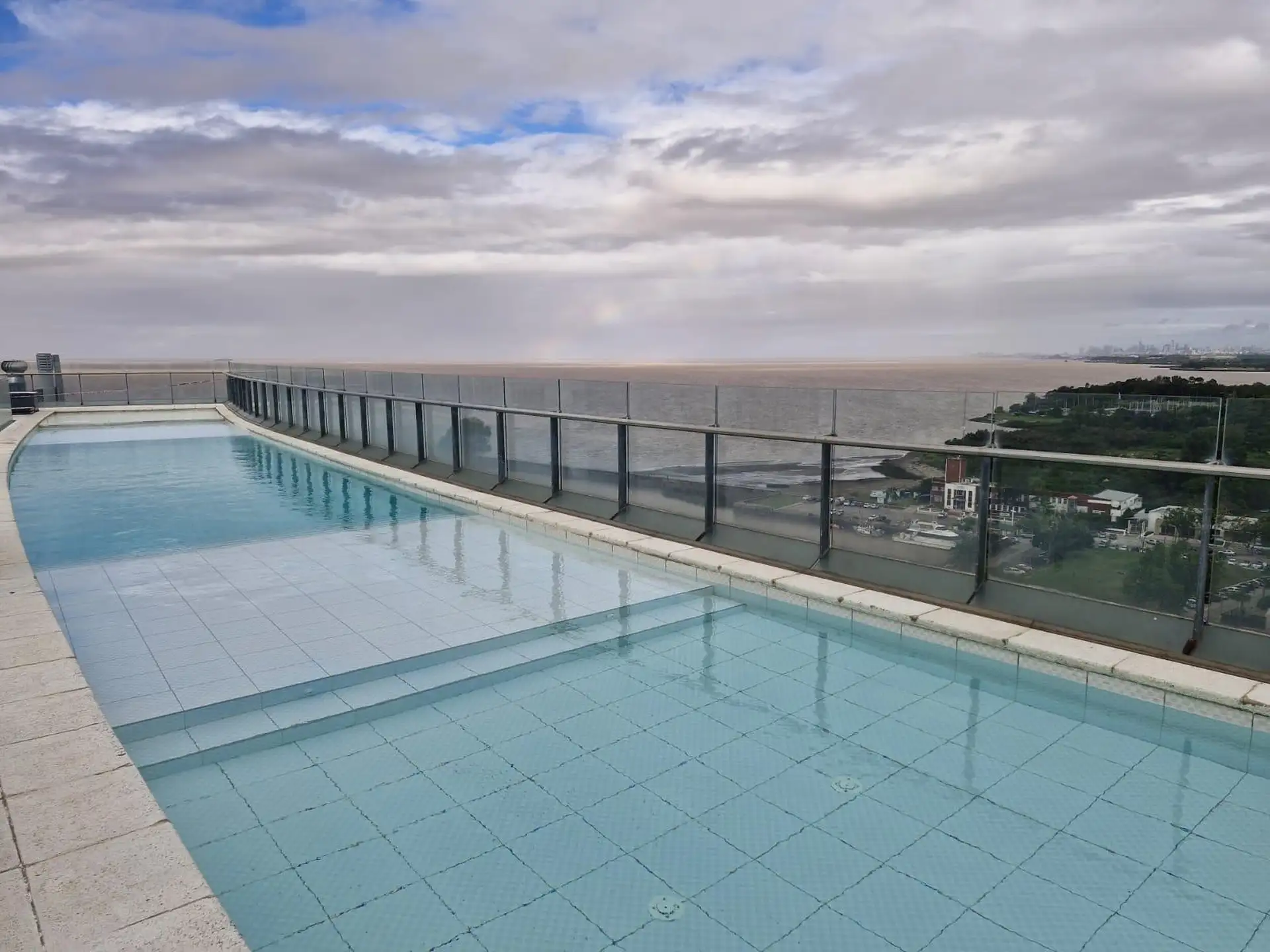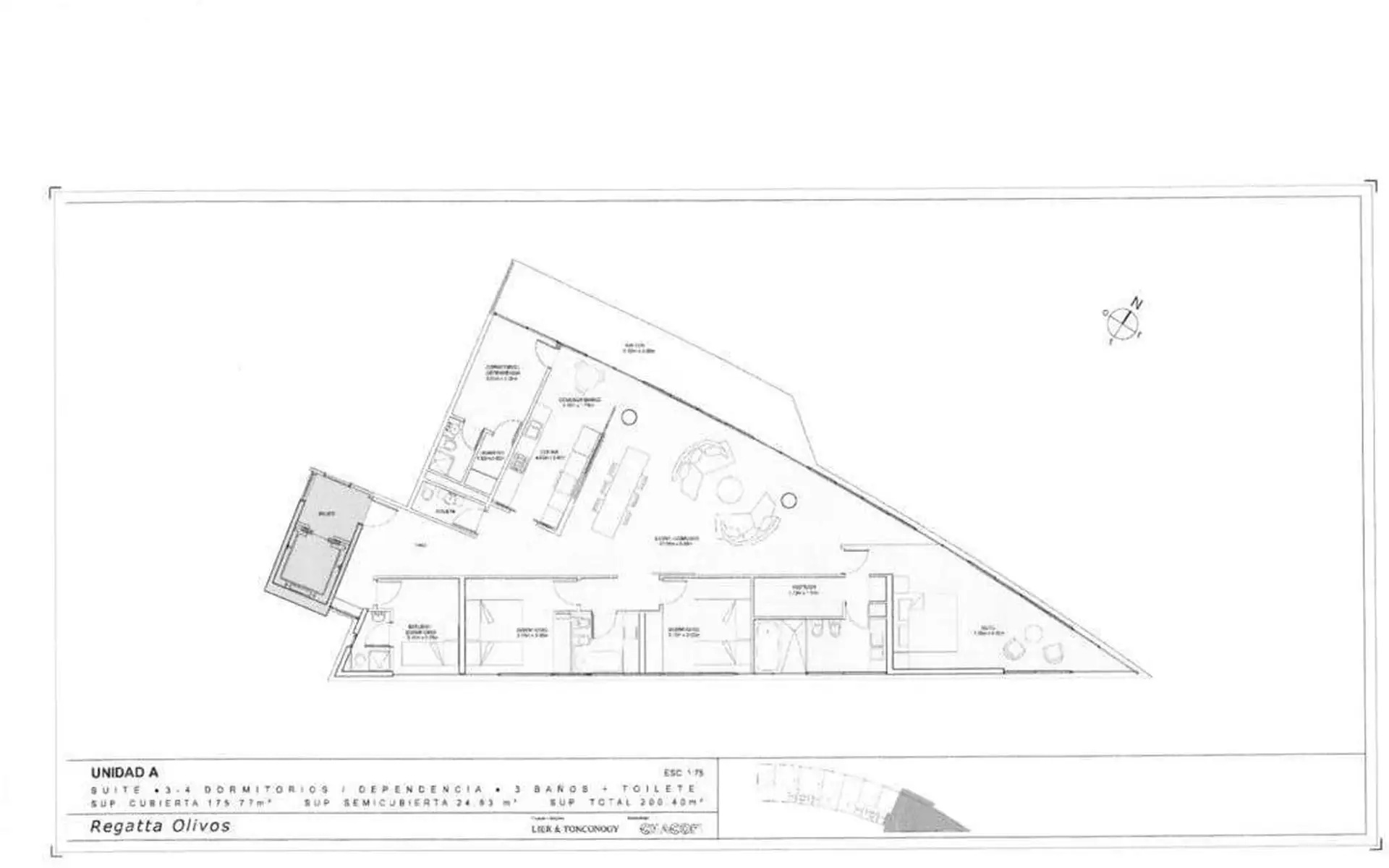 Four-bedroom apartment in Regatta Olivos with a total area of 174 m² (158 m² covered, 16 m² semi-covered). Street-facing with a terrace-style balcony; entry hall with a guest toilet. The main bedroom is en suite with a dressing room, and the two other bedrooms share a full bathroom. Large living-dining room with kitchen access to the balcony, plus a service quarters area with a laundry area. Building amenities include indoor and outdoor pools, locker rooms, gym, laundry, solarium, communal room