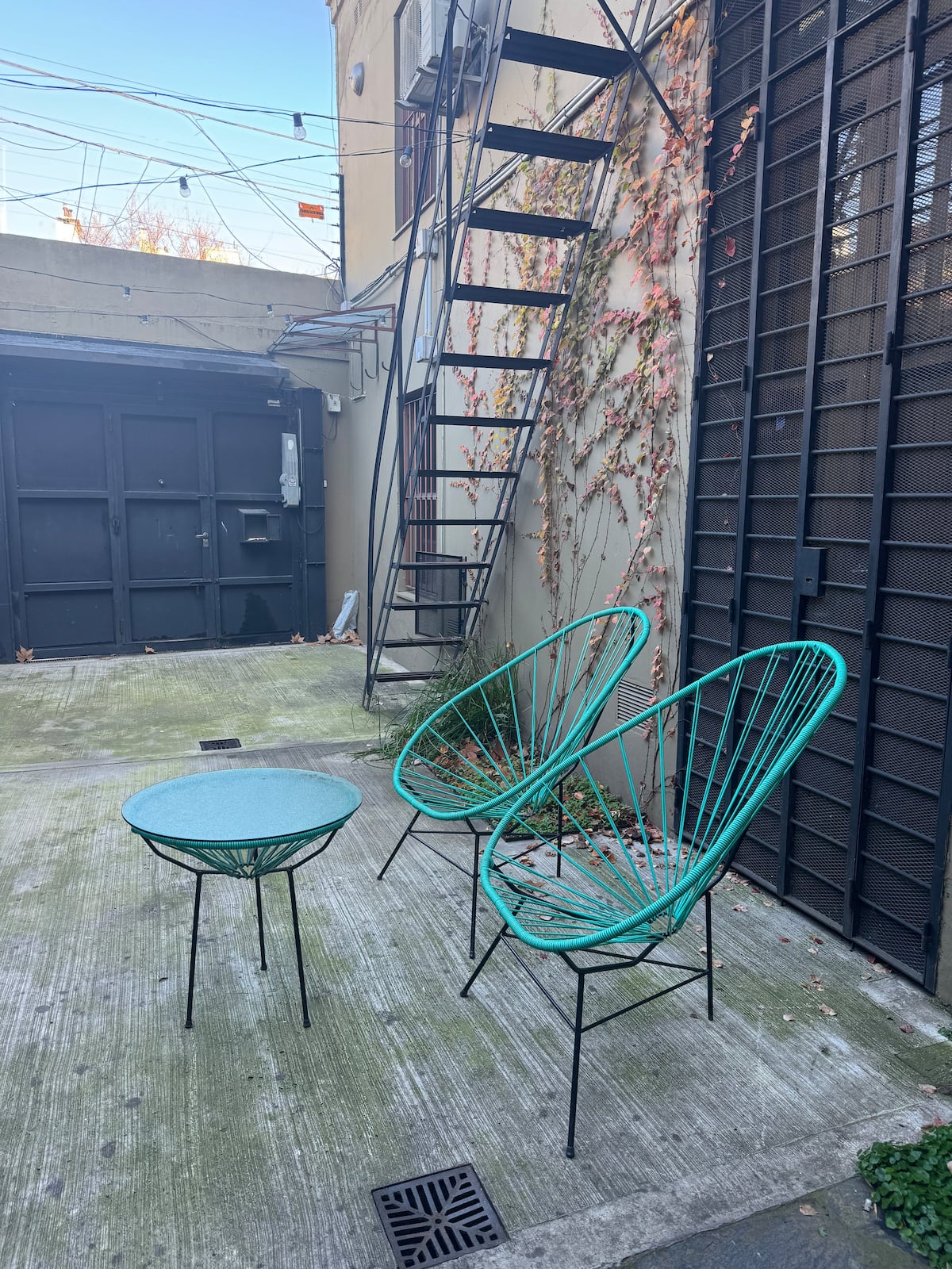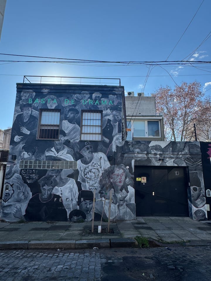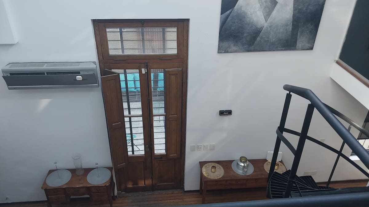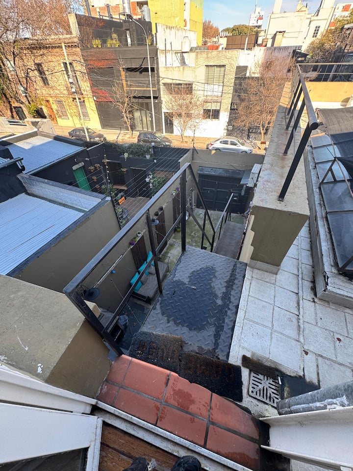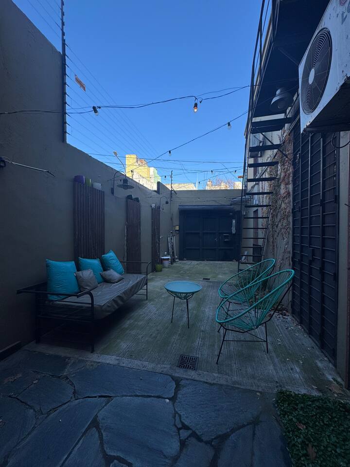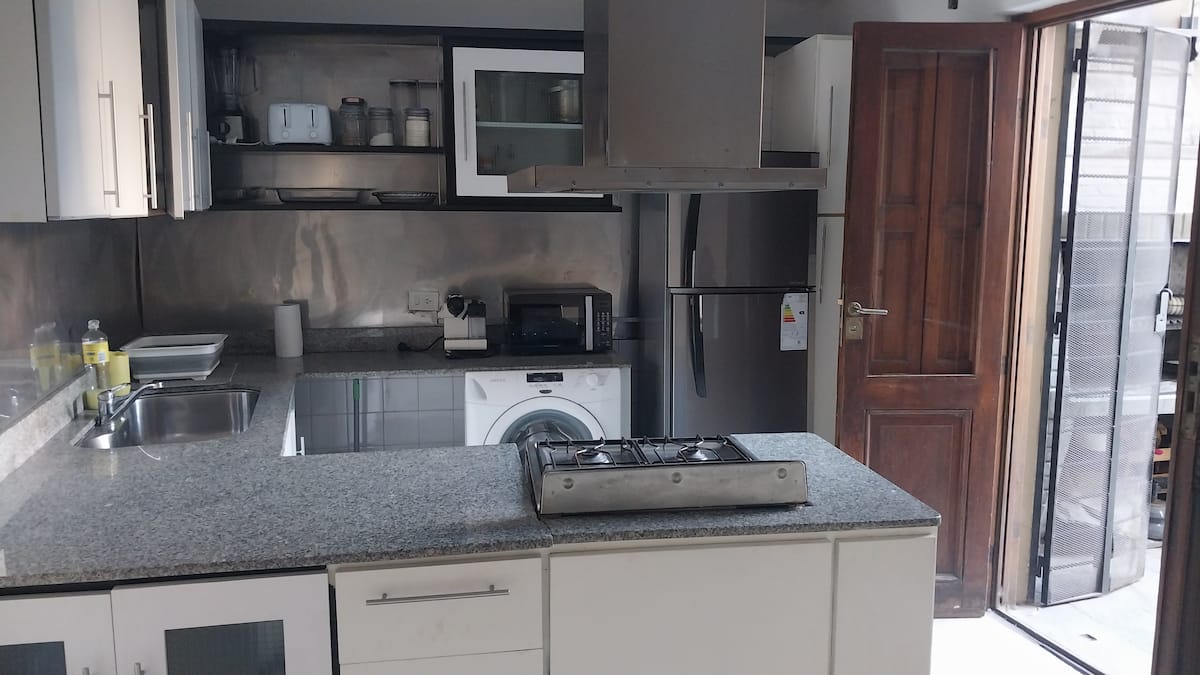 House-style apartment in Palermo Soho for up to 12 people, with a ground-floor patio and a covered grill. It includes a full kitchen with oven, microwave, Nespresso coffee maker, toaster, blender, and tableware, plus a living/dining room with air conditioning and a smart TV with cable. There are 4 bedrooms distributed across the ground floor, a first-floor level reached by stairs, and an independent annex accessed from the patio by a steep staircase; the annex is not suitable for people with red