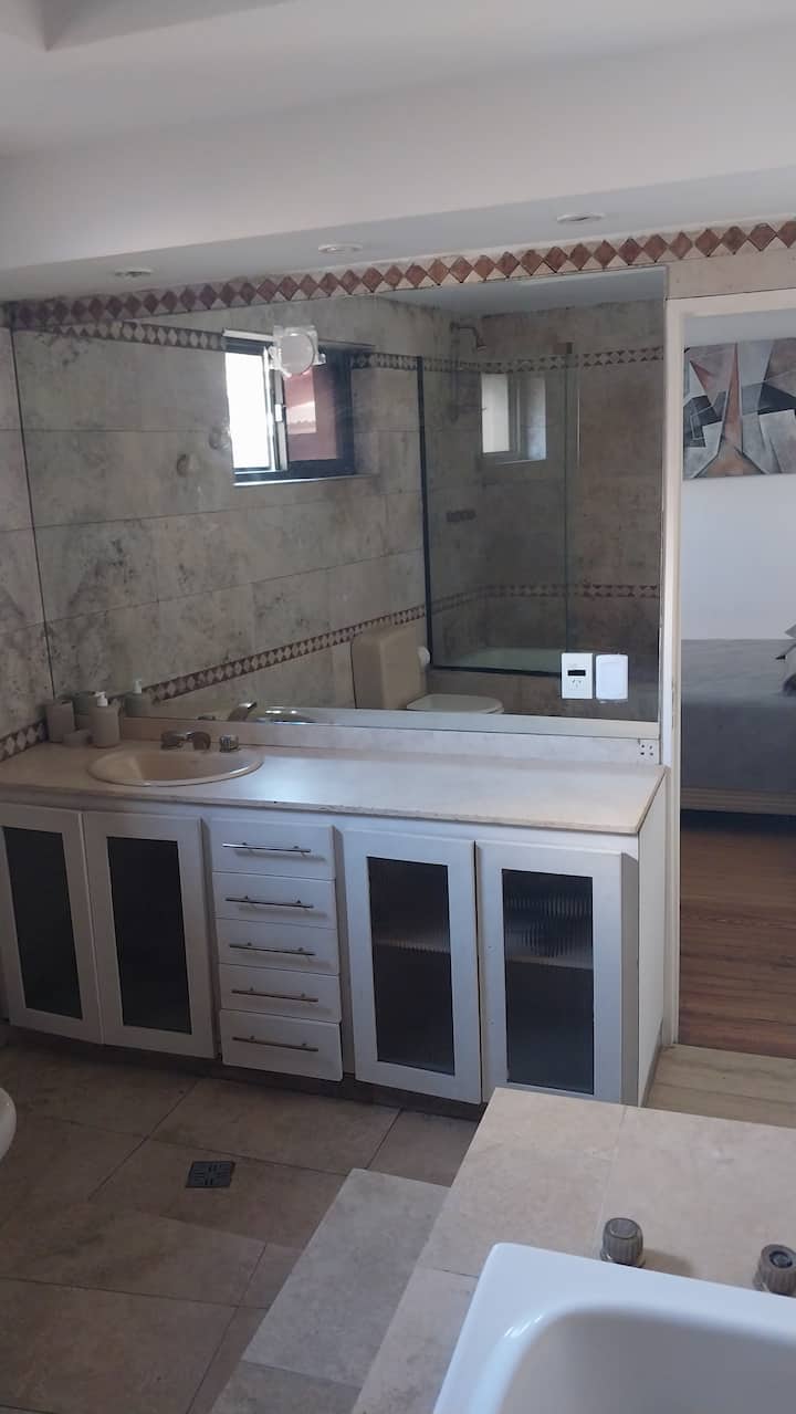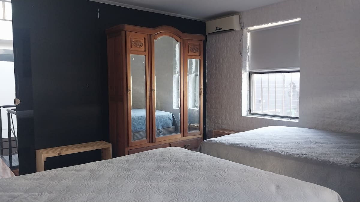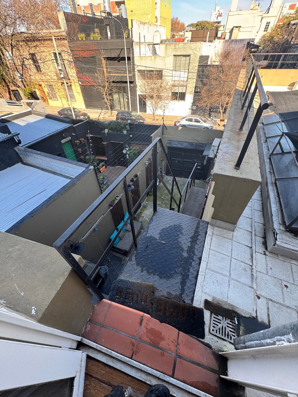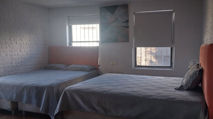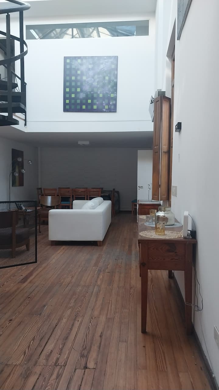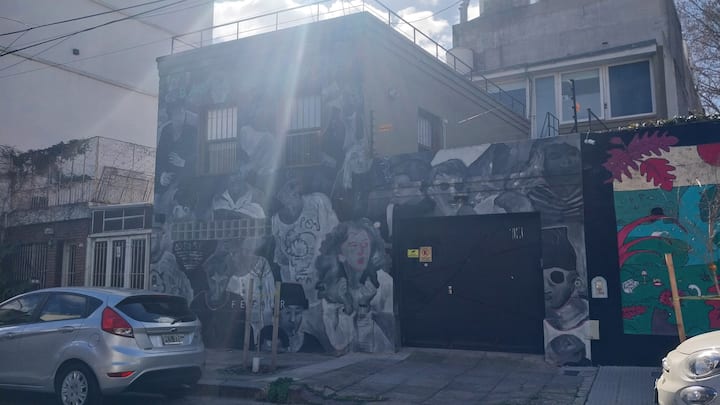 House-style apartment in Palermo Soho for up to 12 people, with a ground-floor patio and a covered grill. It includes a full kitchen with oven, microwave, Nespresso coffee maker, toaster, blender, and tableware, plus a living/dining room with air conditioning and a smart TV with cable. There are 4 bedrooms distributed across the ground floor, a first-floor level reached by stairs, and an independent annex accessed from the patio by a steep staircase; the annex is not suitable for people with red